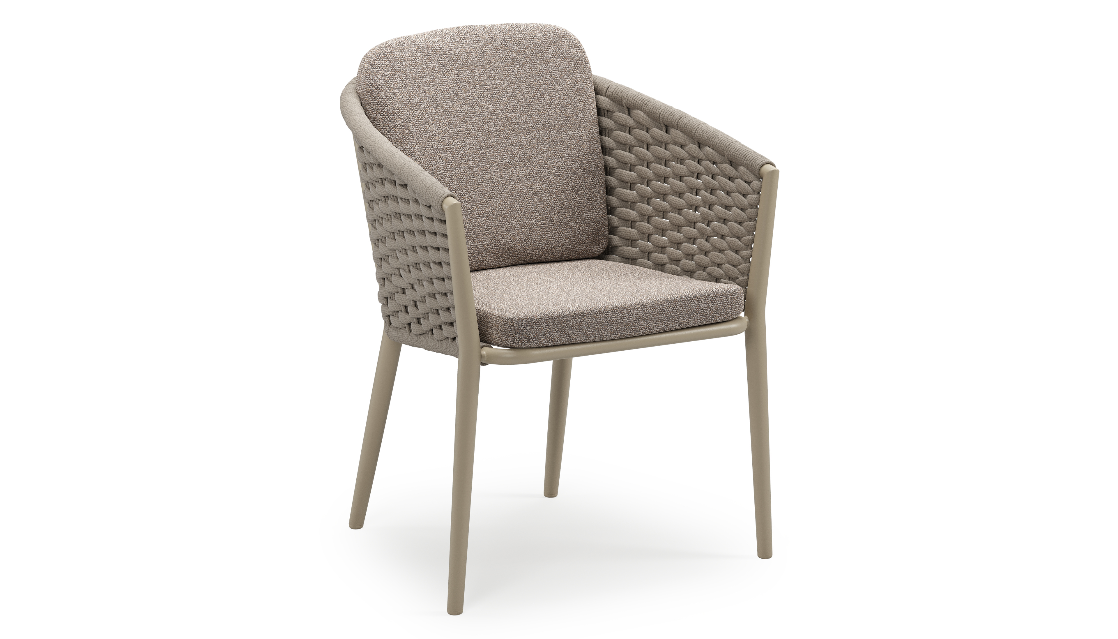 Orso stapelbare tuinstoel in beige aluminium en beige horizontaal geweven ronde rope met stoelkussen in All Weather Sunbrella® Luxe Wander Manioc | Exterioo tuinmeubelen