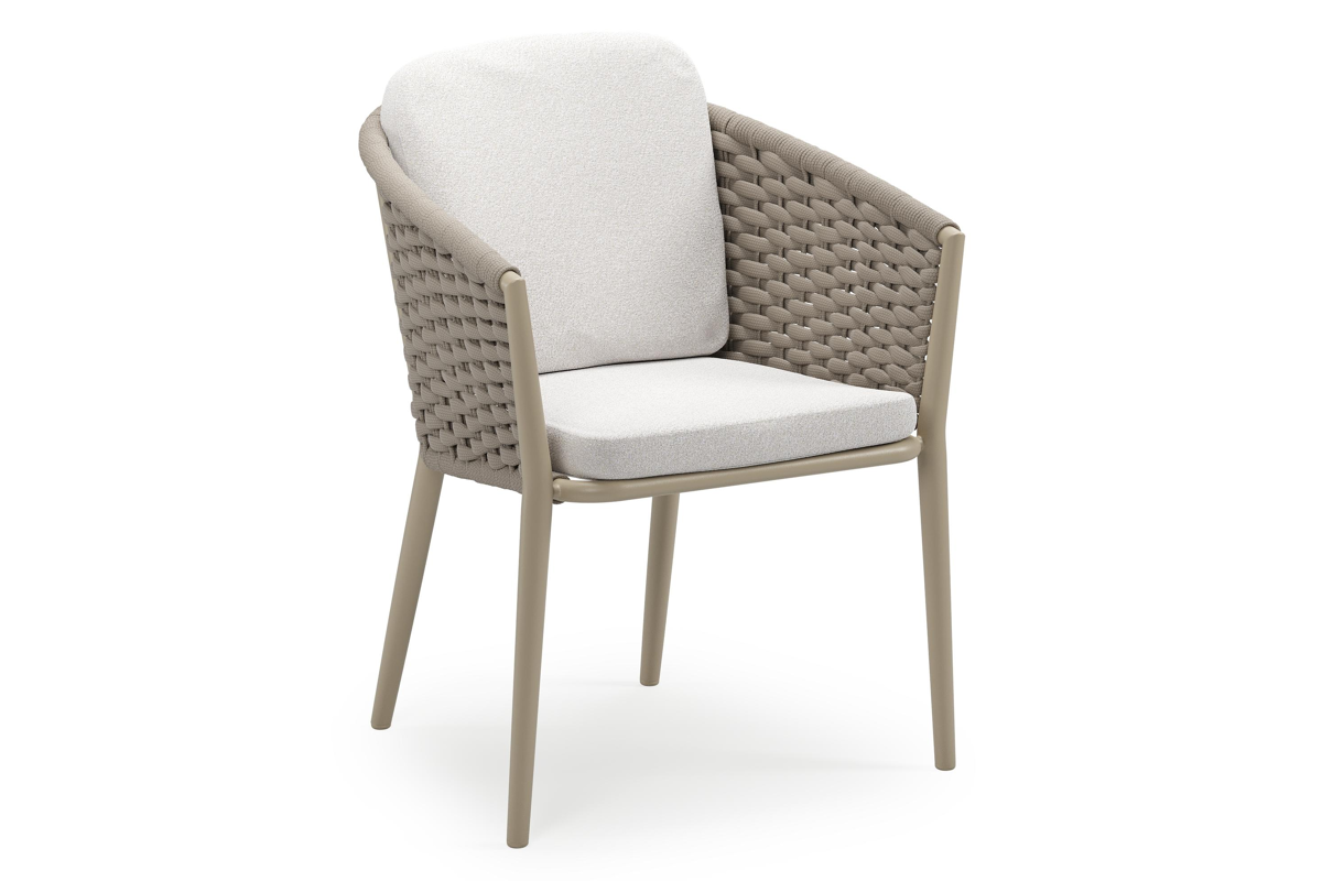Orso stapelbare tuinstoel in beige aluminium en beige horizontaal geweven ronde rope met stoelkussen in All Weather Solica Soul Optik | Exterioo