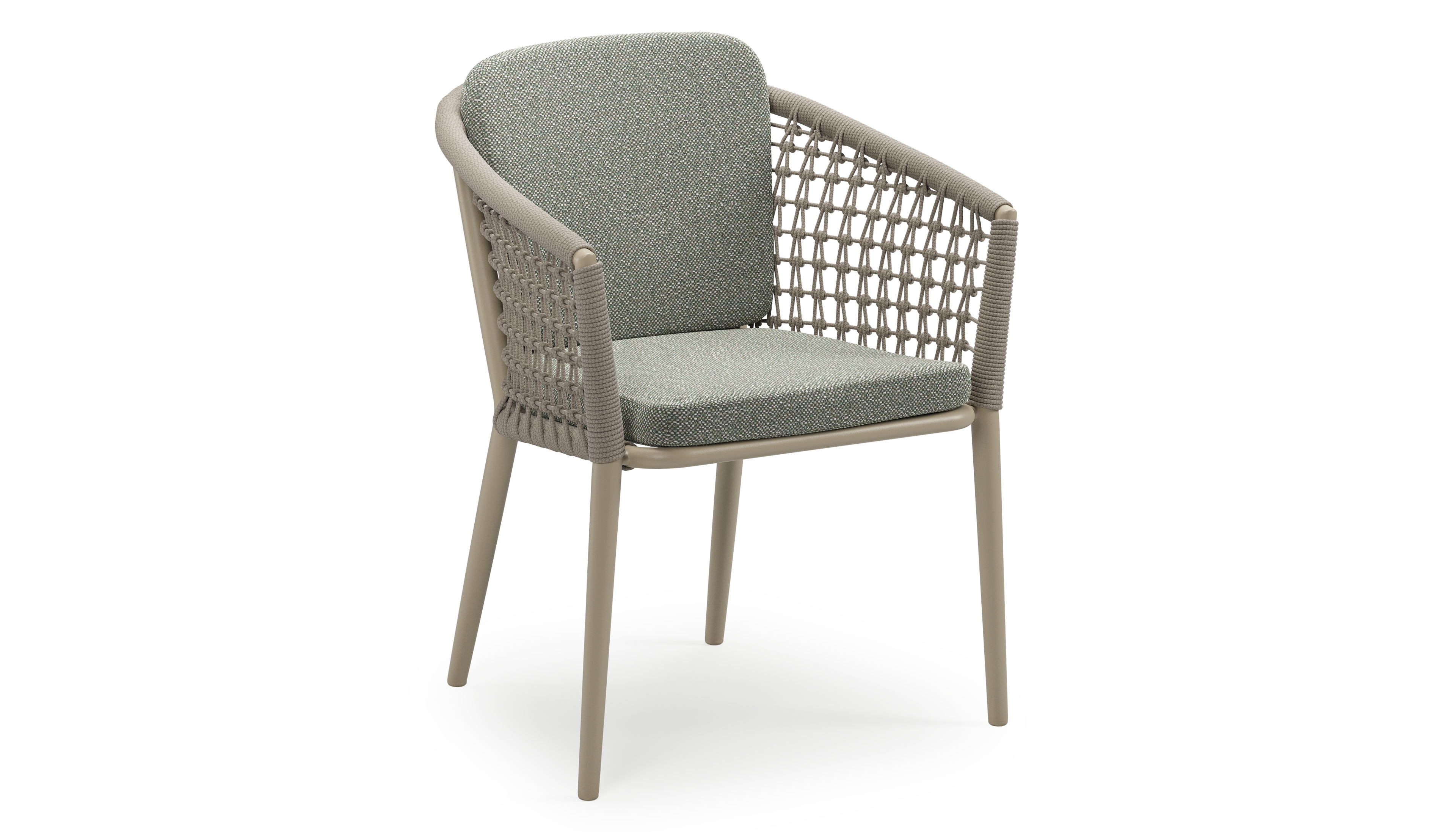 Orso stapelbare tuinstoel in beige aluminium en beige visnet geweven ronde rope met stoelkussen in All Weather Sunbrella® Luxe Savane Leaf | Exterioo tuinmeubelen