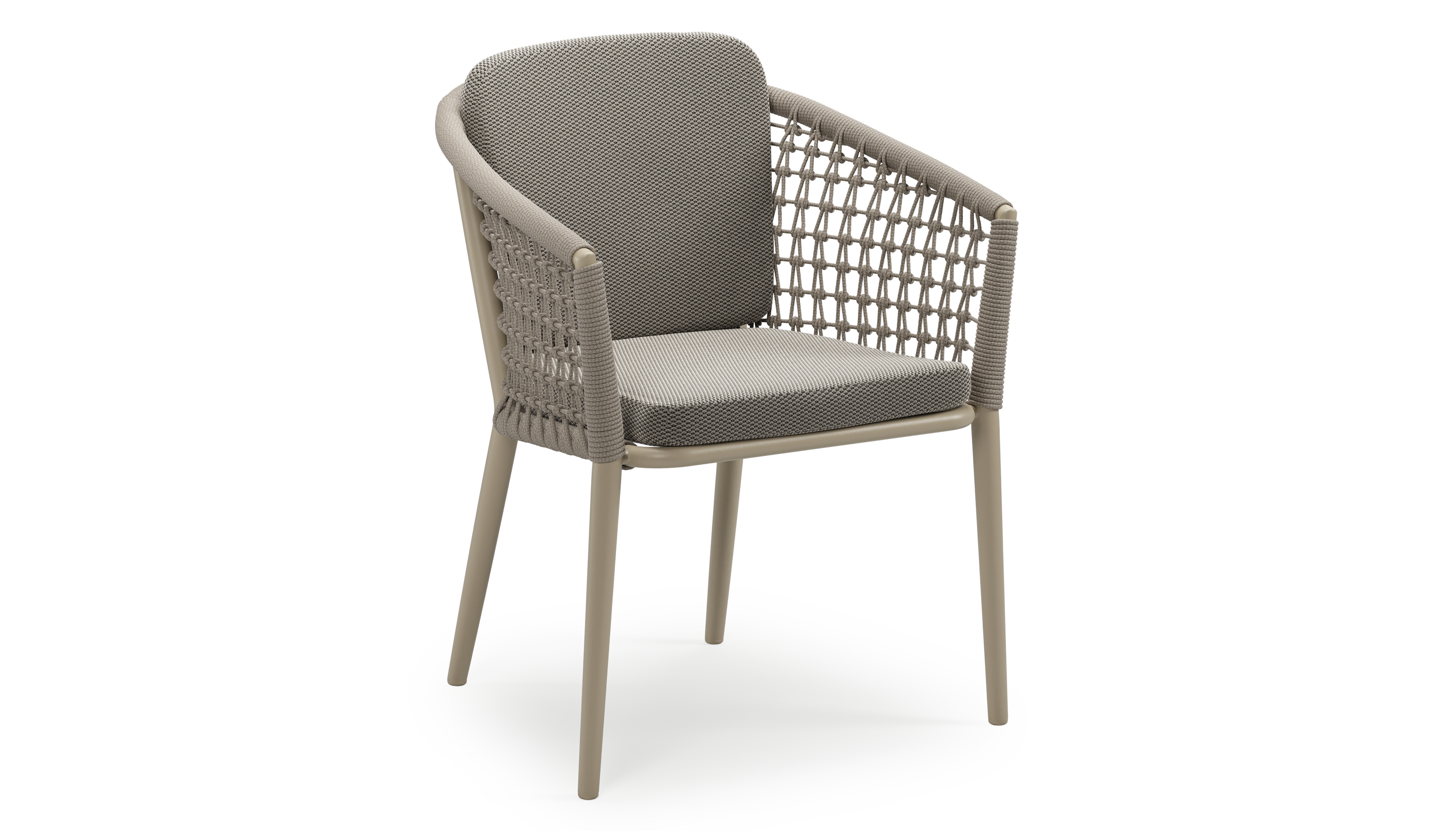 Orso stapelbare tuinstoel in beige aluminium en beige visnet geweven ronde rope met stoelkussen in All Weather Sunbrella® Luxe Lopi Charcoal | Exterioo tuinmeubelen