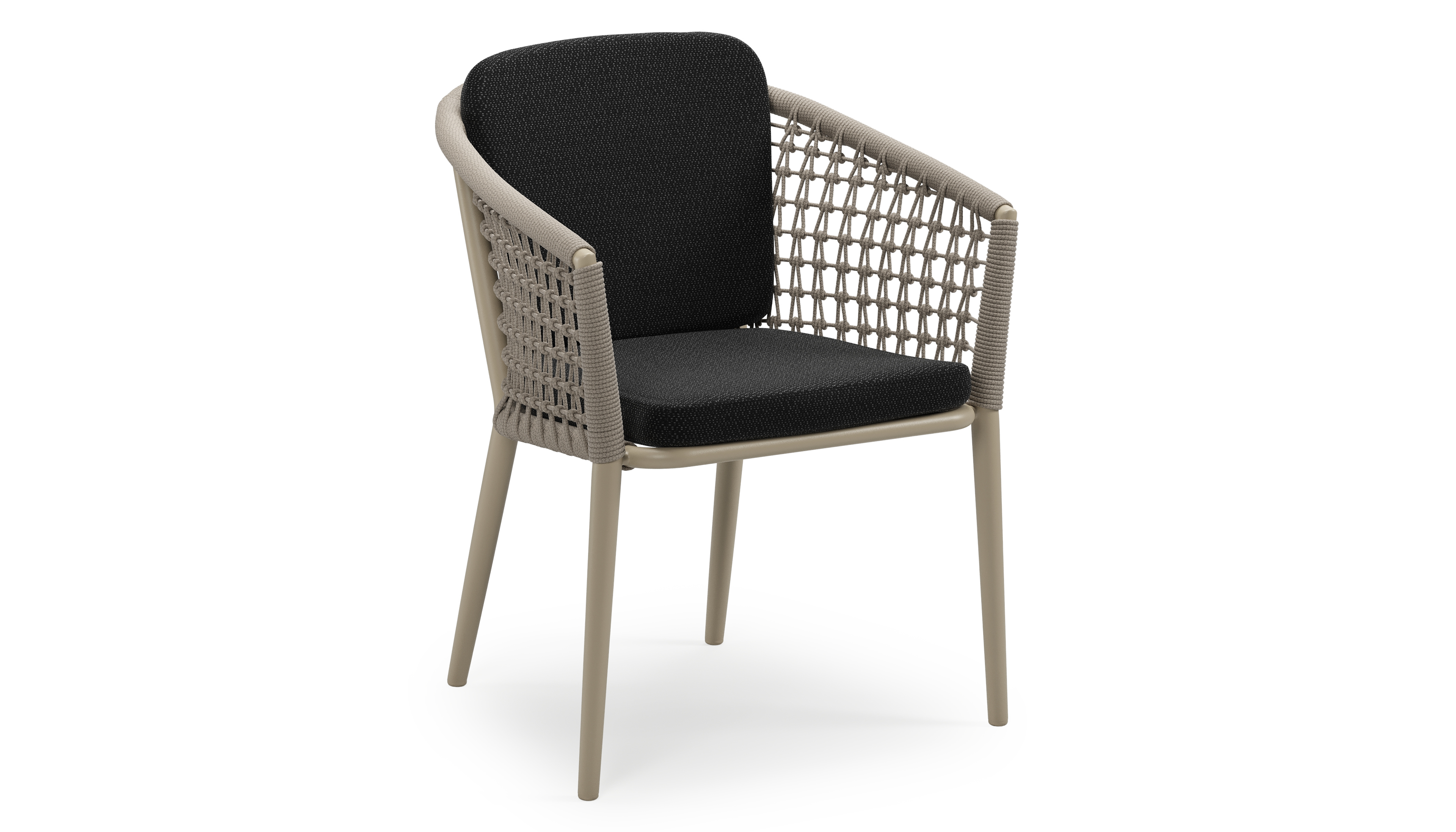Orso stapelbare tuinstoel in beige aluminium en beige visnet geweven ronde rope met stoelkussen in All Weather Sunbrella® Luxe Lopi Baribal | Exterioo tuinmeubelen