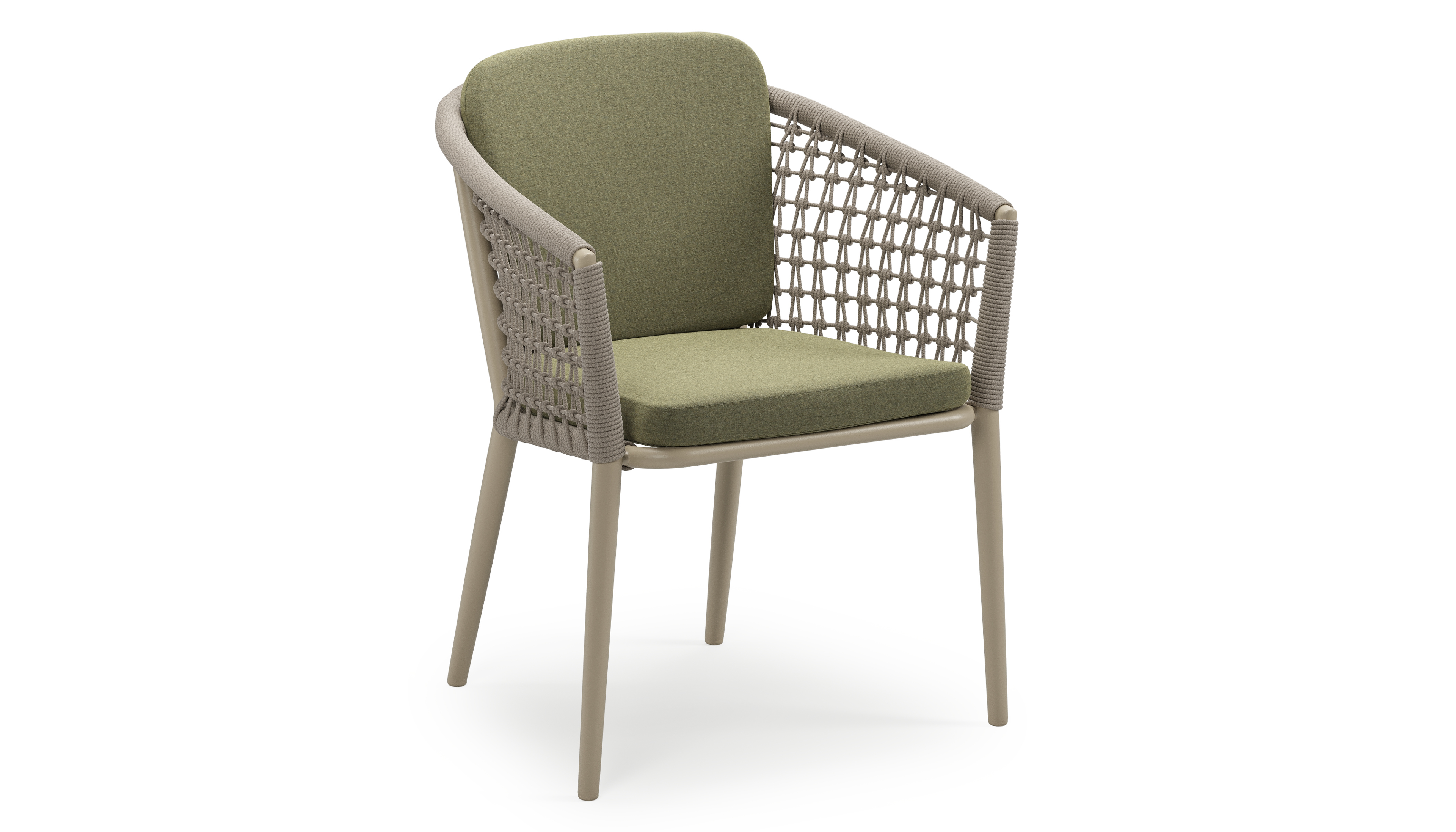 Orso stapelbare tuinstoel in beige aluminium en beige visnet geweven ronde rope met stoelkussen in All Weather Sunbrella® Luxe Heritage Leaf | Exterioo tuinmeubelen