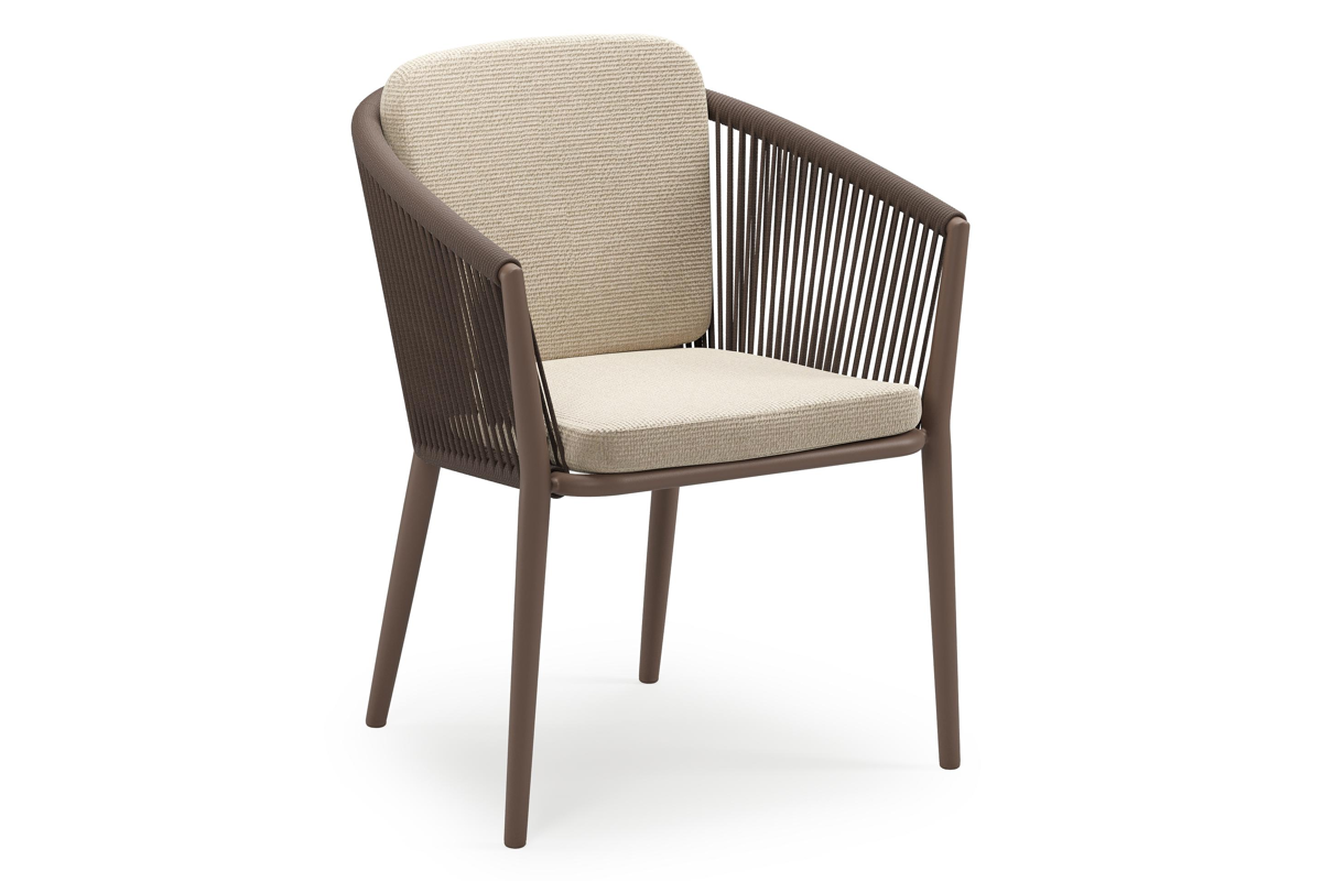 Orso stapelbare tuinstoel in taupe aluminium en taupe verticaal geweven ronde rope met stoelkussen in All Weather Cosytica Althea Chalk | Exterioo