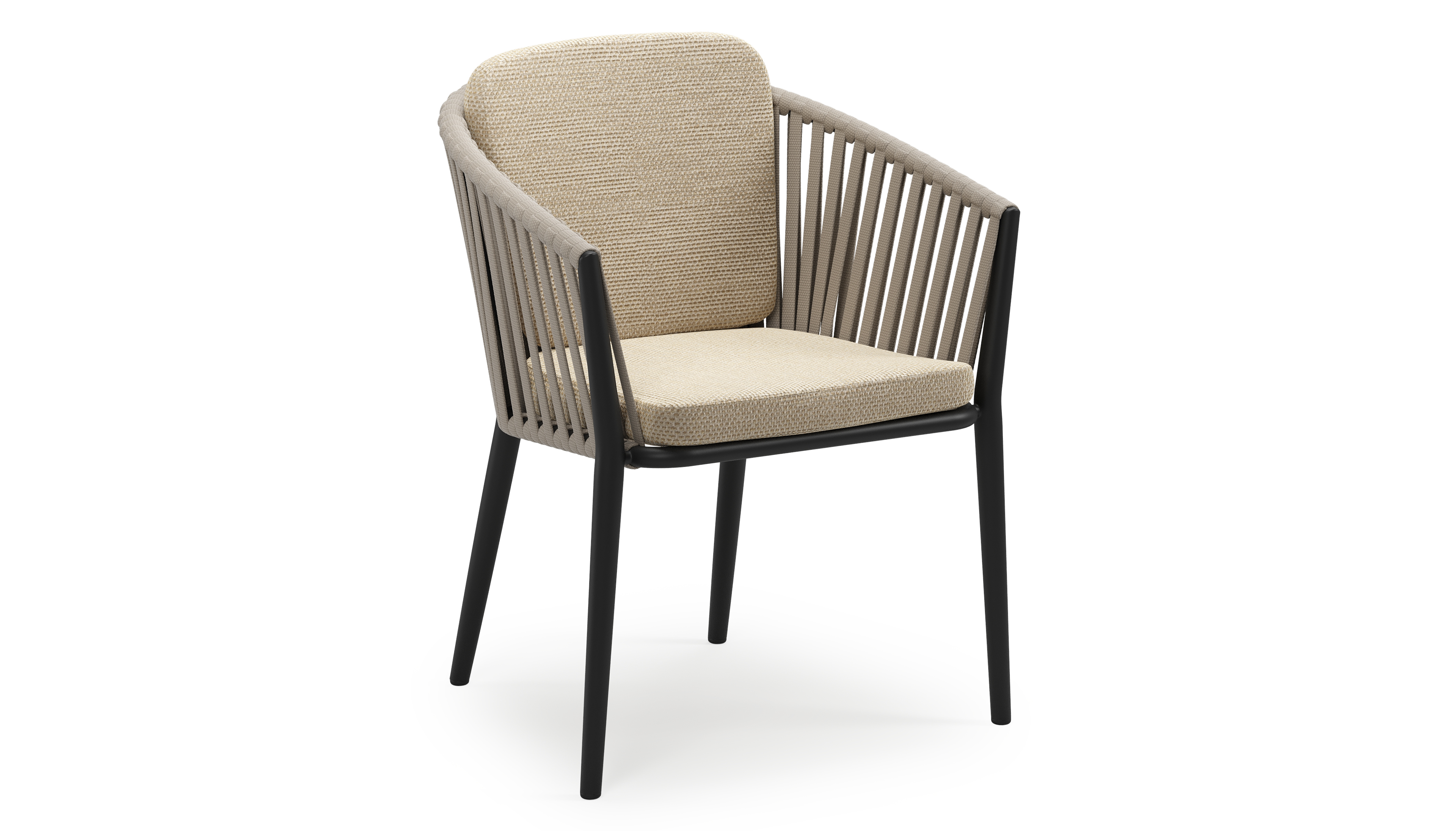 Orso stapelbare tuinstoel in zwart aluminium en beige verticaal geweven luxe vlakke brede rope met stoelkussen in All Weather Cosytica Althea Camel | Exterioo tuinmeubelen