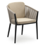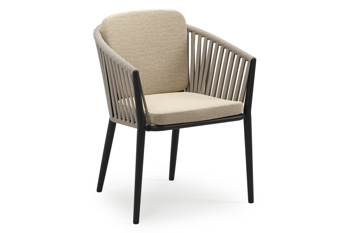 Orso stapelbare tuinstoel in zwart aluminium en beige verticaal geweven luxe vlakke brede rope met stoelkussen in All Weather Cosytica Althea Camel | Exterioo