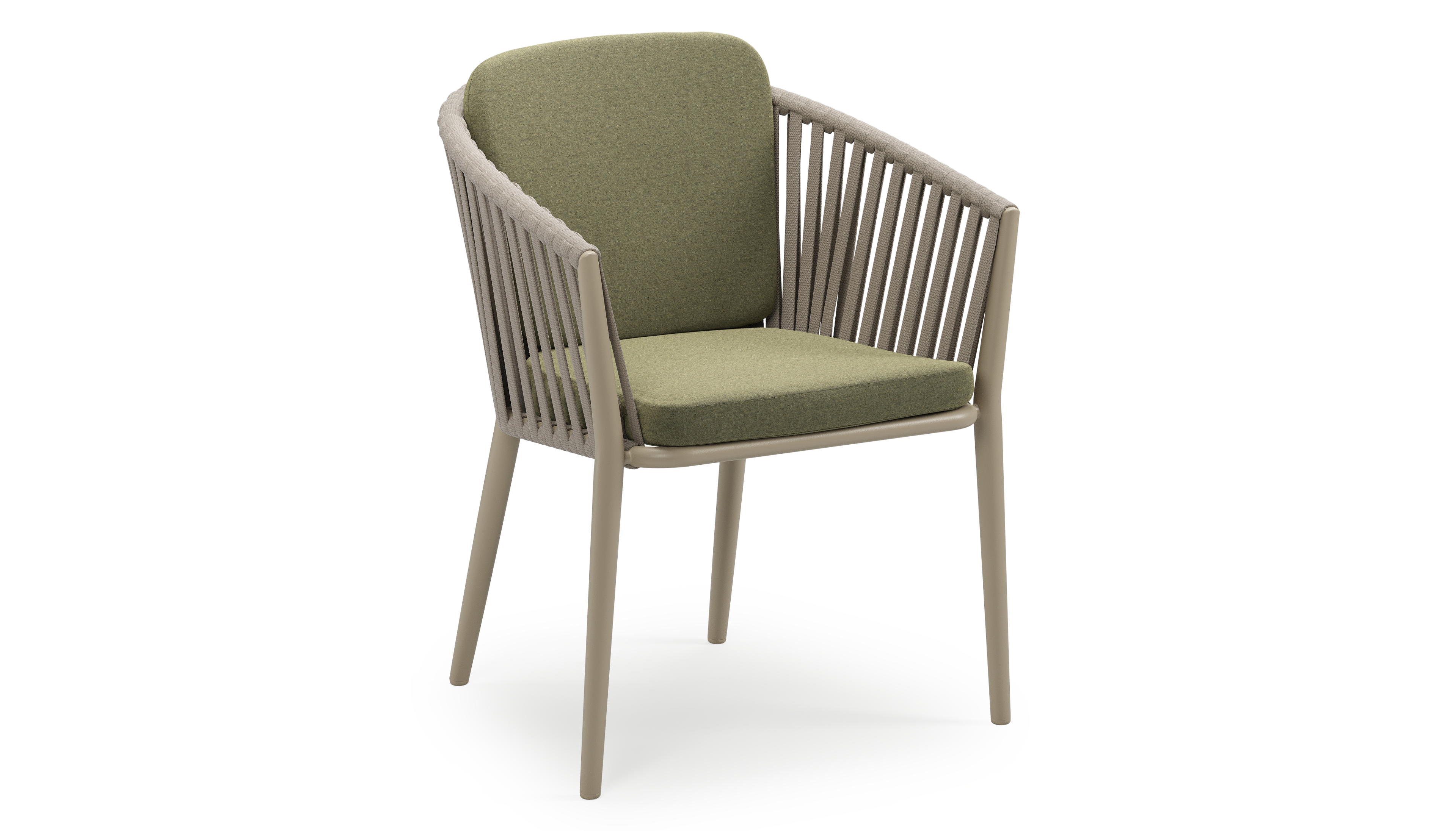 Orso stapelbare tuinstoel in beige aluminium en beige verticaal geweven luxe vlakke brede rope met stoelkussen in All Weather Sunbrella® Luxe Heritage Leaf | Exterioo tuinmeubelen