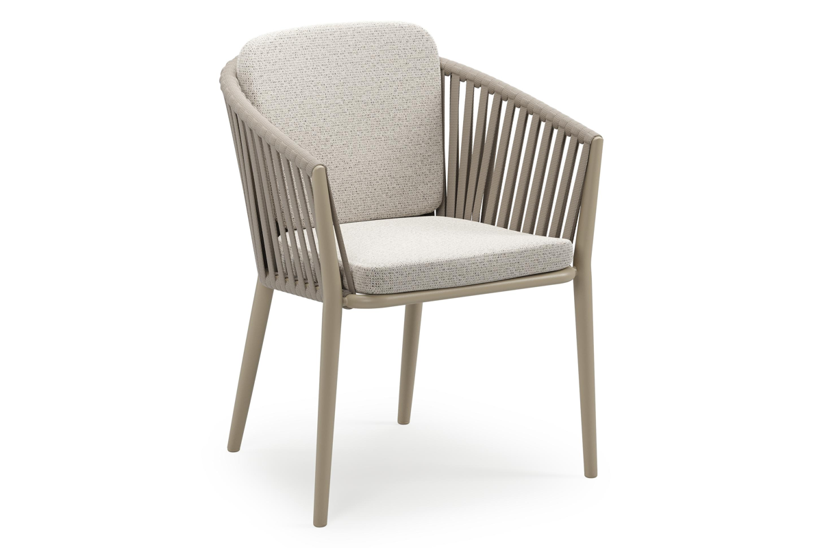 Orso stapelbare tuinstoel in beige aluminium en beige verticaal geweven luxe vlakke brede rope met stoelkussen in All Weather Solica Firenze Natural | Exterioo