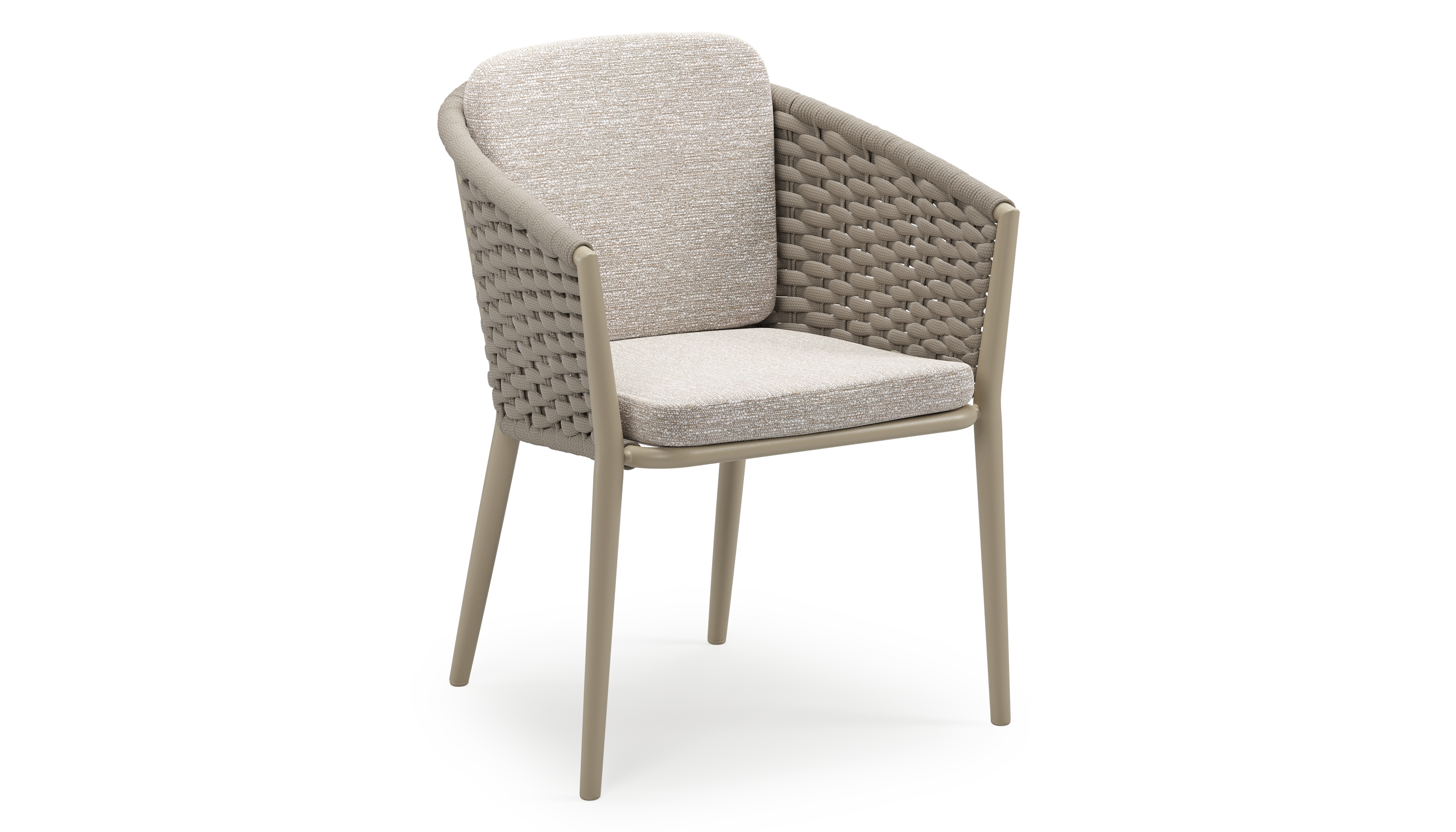 Orso stapelbare tuinstoel in beige aluminium en beige horizontaal geweven ronde rope met stoelkussen in All Weather Sunbrella® Luxe Tundra Sand | Exterioo tuinmeubelen