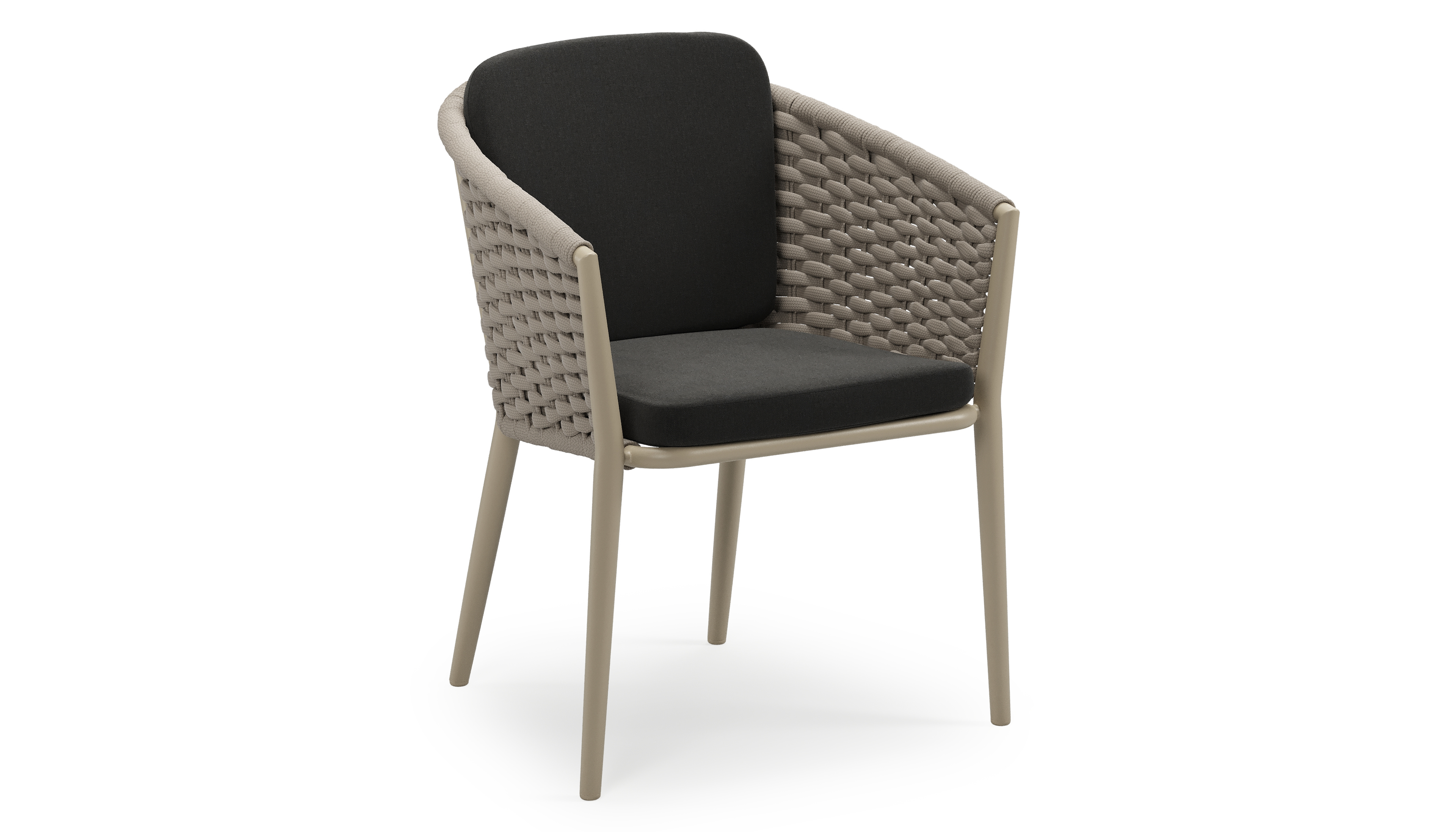 Orso stapelbare tuinstoel in beige aluminium en beige horizontaal geweven ronde rope met stoelkussen in All Weather Sunbrella® Luxe Natte Sooty | Exterioo tuinmeubelen