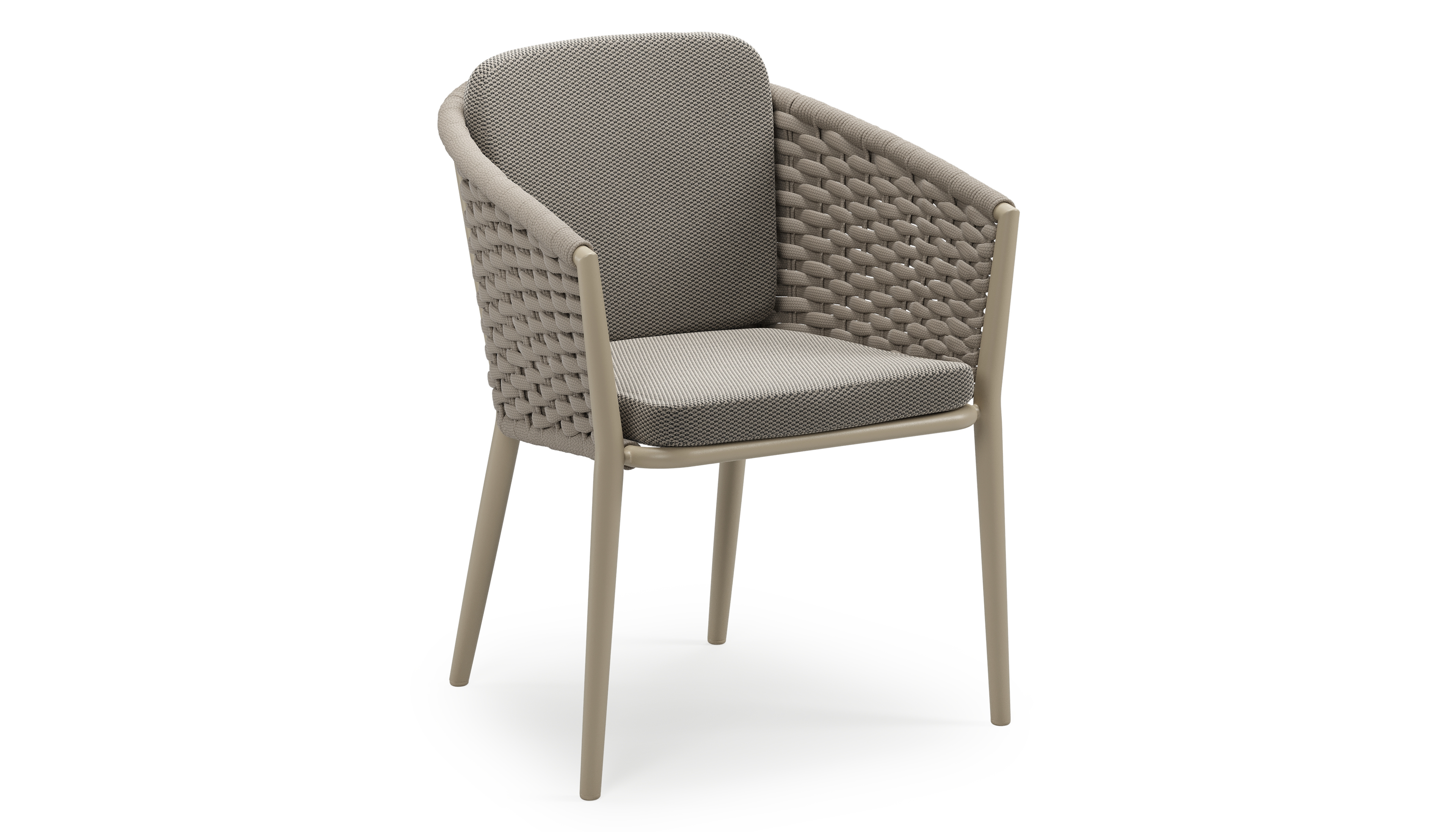 Orso stapelbare tuinstoel in beige aluminium en beige horizontaal geweven ronde rope met stoelkussen in All Weather Sunbrella® Luxe Lopi Charcoal | Exterioo tuinmeubelen
