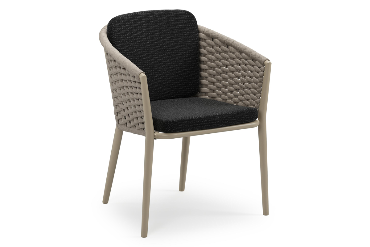 Orso stapelbare tuinstoel in beige aluminium en beige horizontaal geweven ronde rope met stoelkussen in All Weather Sunbrella® Luxe Lopi Baribal | Exterioo