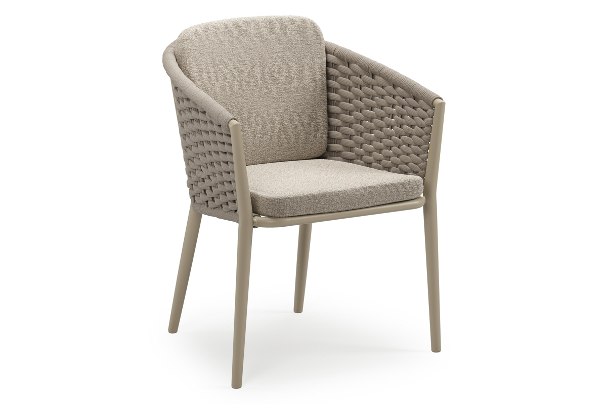 Orso stapelbare tuinstoel in beige aluminium en beige horizontaal geweven ronde rope met stoelkussen in All Weather Cosytica Catania Greige | Exterioo