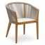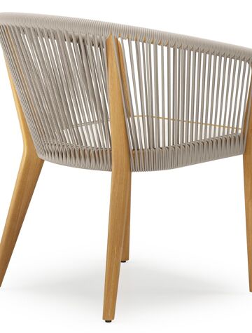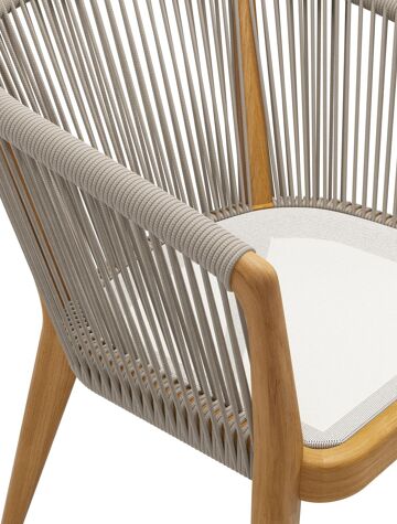 Een tuinstoel uit teak staat gelijk aan bijzondere kwaliteit en natuurlijk design. Teak is een kwalitatieve houtsoort gekenmerkt door zijn hardheid. Aangezien hout leeft, kan de structuur of kleur licht anders zijn dan op het beeld weergegeven.De rug- en armleuning is afgewerkt met ronde rope en heeft een cilindrische vorm. Deze ronde vorm kan een meer organische en traditionele uitstraling geven.De zitting is afgewerkt met textilene, een stijlvol materiaal dat erg stevig en onderhoudsvriendelijk is. Het is een materiaal dat bovendien weerbestendig is en daarbij dus ook snel droogt. Textilene buigt gemakkelijk mee met het lichaam, maar is ook erg vormvast, waardoor er niet snel verzakkingen ontstaan. De elasticiteit maakt het comfortabel om te zitten.