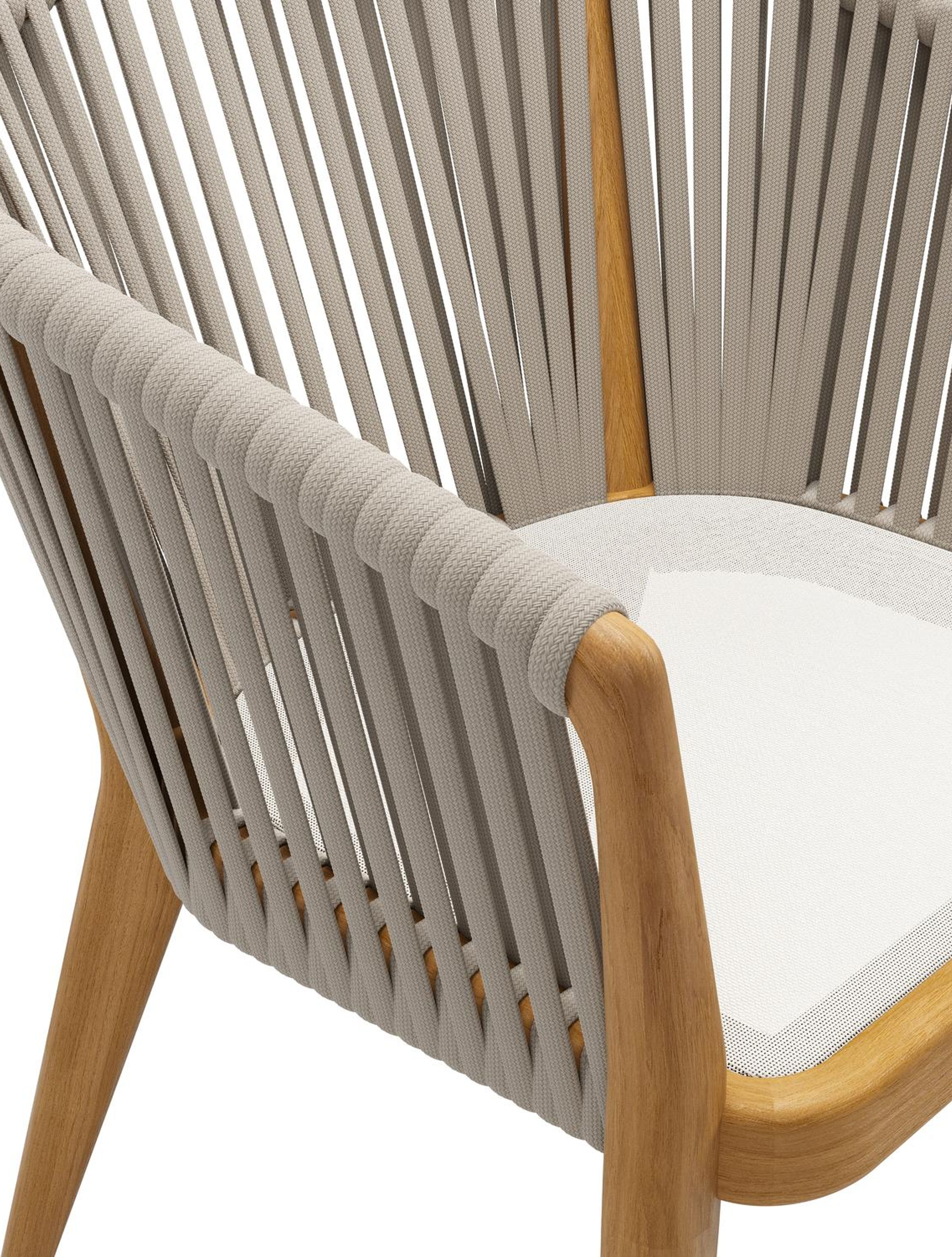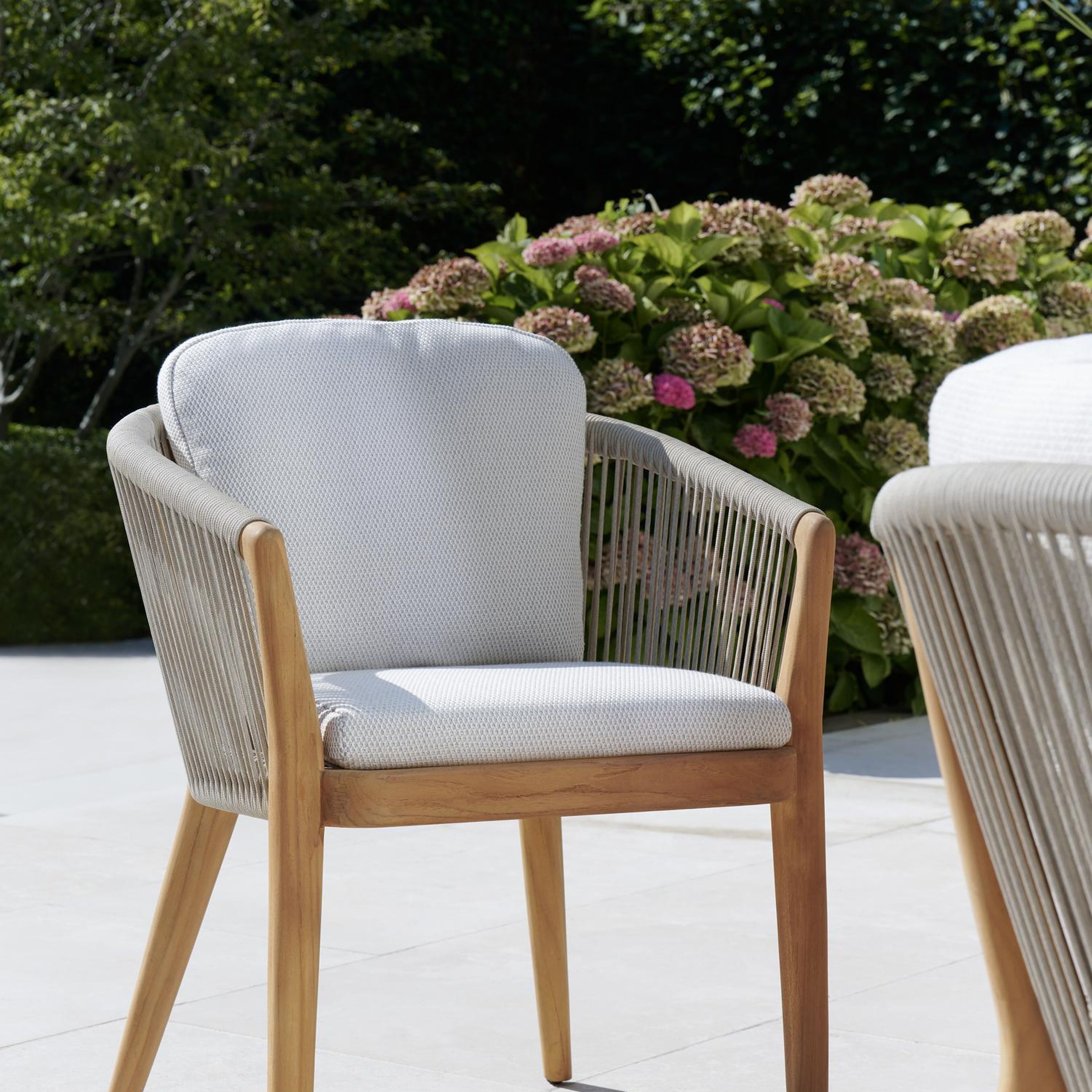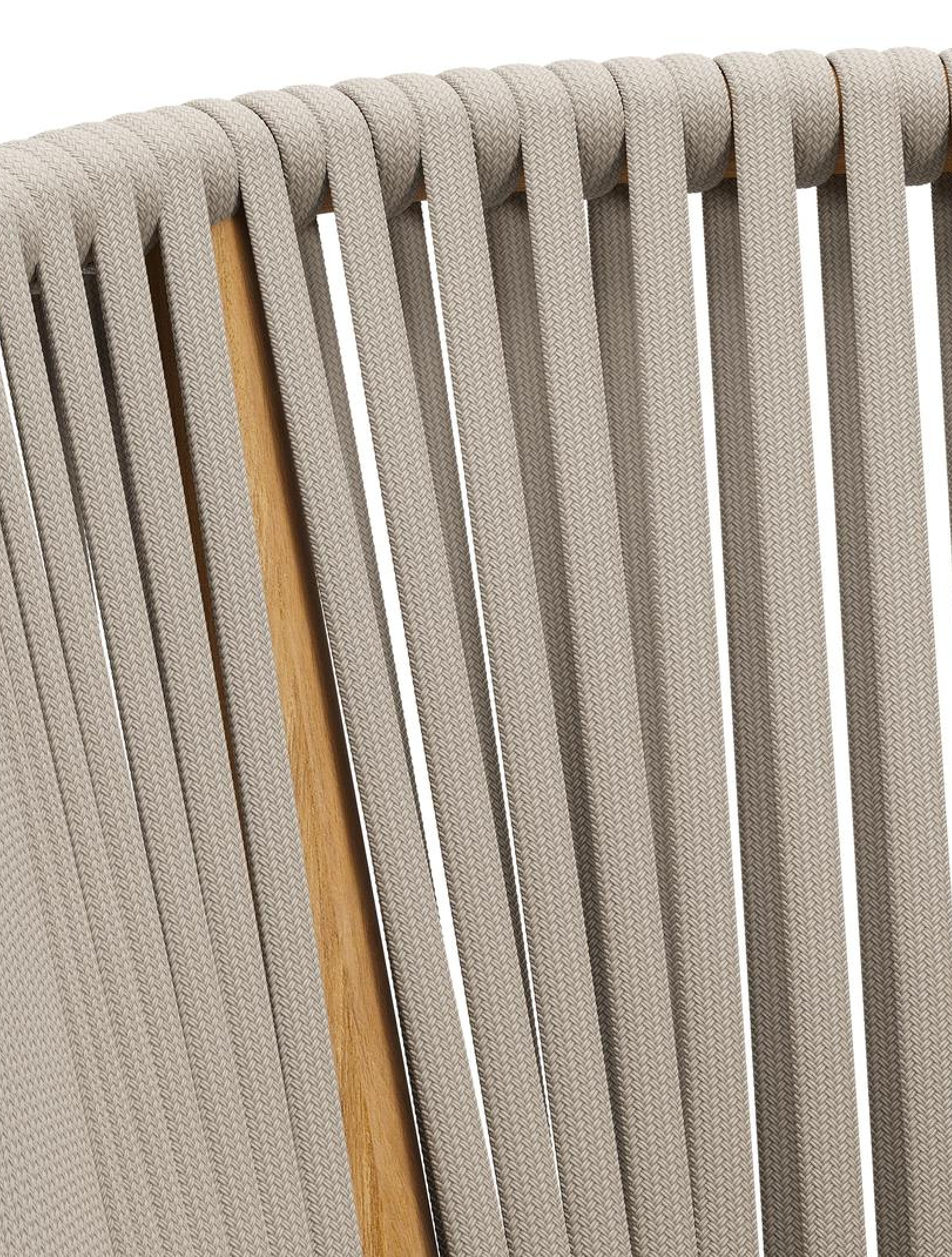 Een tuinstoel uit teak staat gelijk aan bijzondere kwaliteit en natuurlijk design. Teak is een kwalitatieve houtsoort gekenmerkt door zijn hardheid. Aangezien hout leeft, kan de structuur of kleur licht anders zijn dan op het beeld weergegeven.De rug- en armleuning is afgewerkt met luxe vlakke rope en heeft een platte en rechthoekige dwarsdoorsnede en biedt een luxueuze en gezellige uitstraling aan de stoel.De zitting is afgewerkt met textilene, een stijlvol materiaal dat erg stevig en onderhoudsvriendelijk is. Het is een materiaal dat bovendien weerbestendig is en daarbij dus ook snel droogt. Textilene buigt gemakkelijk mee met het lichaam, maar is ook erg vormvast, waardoor er niet snel verzakkingen ontstaan. De elasticiteit maakt het comfortabel om te zitten.