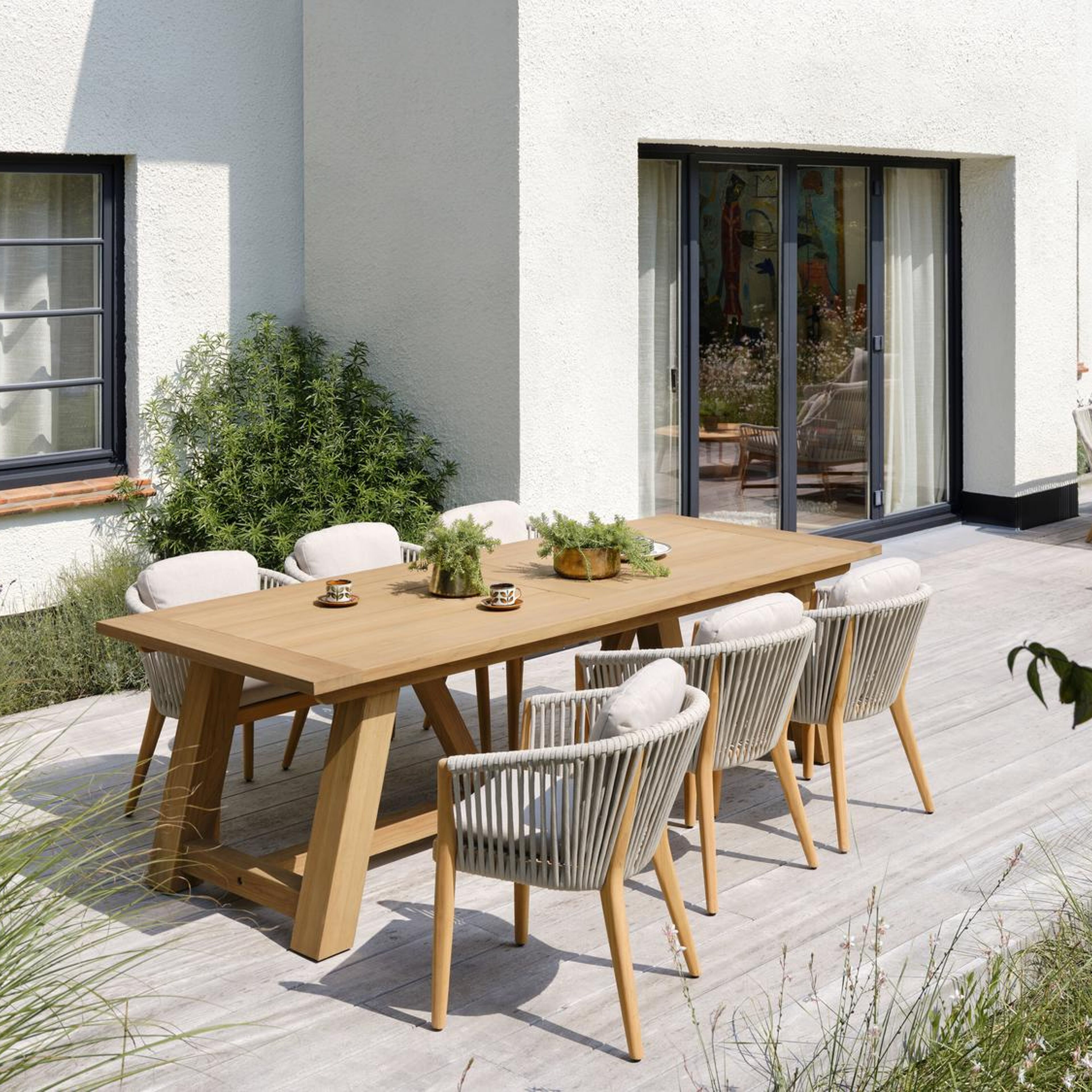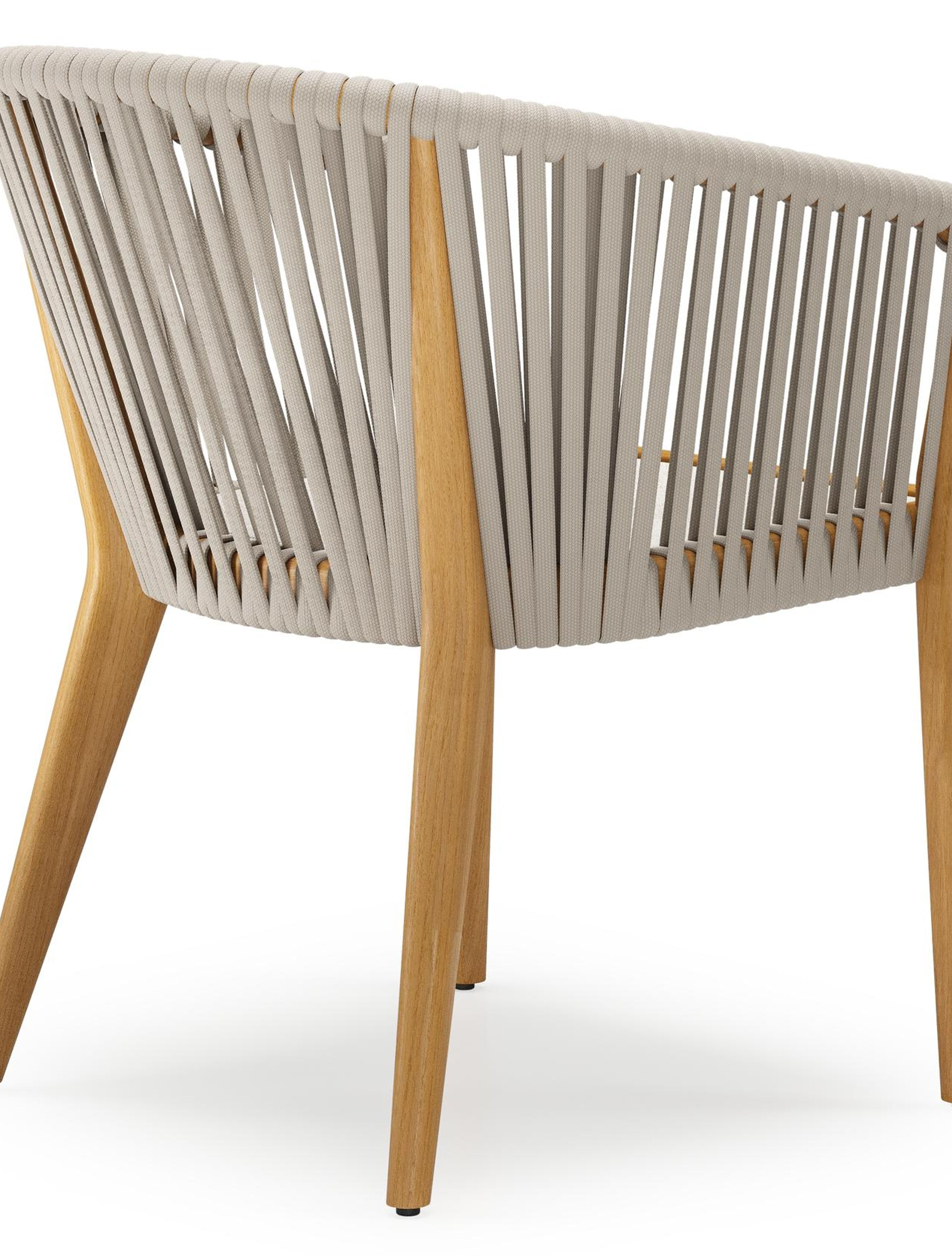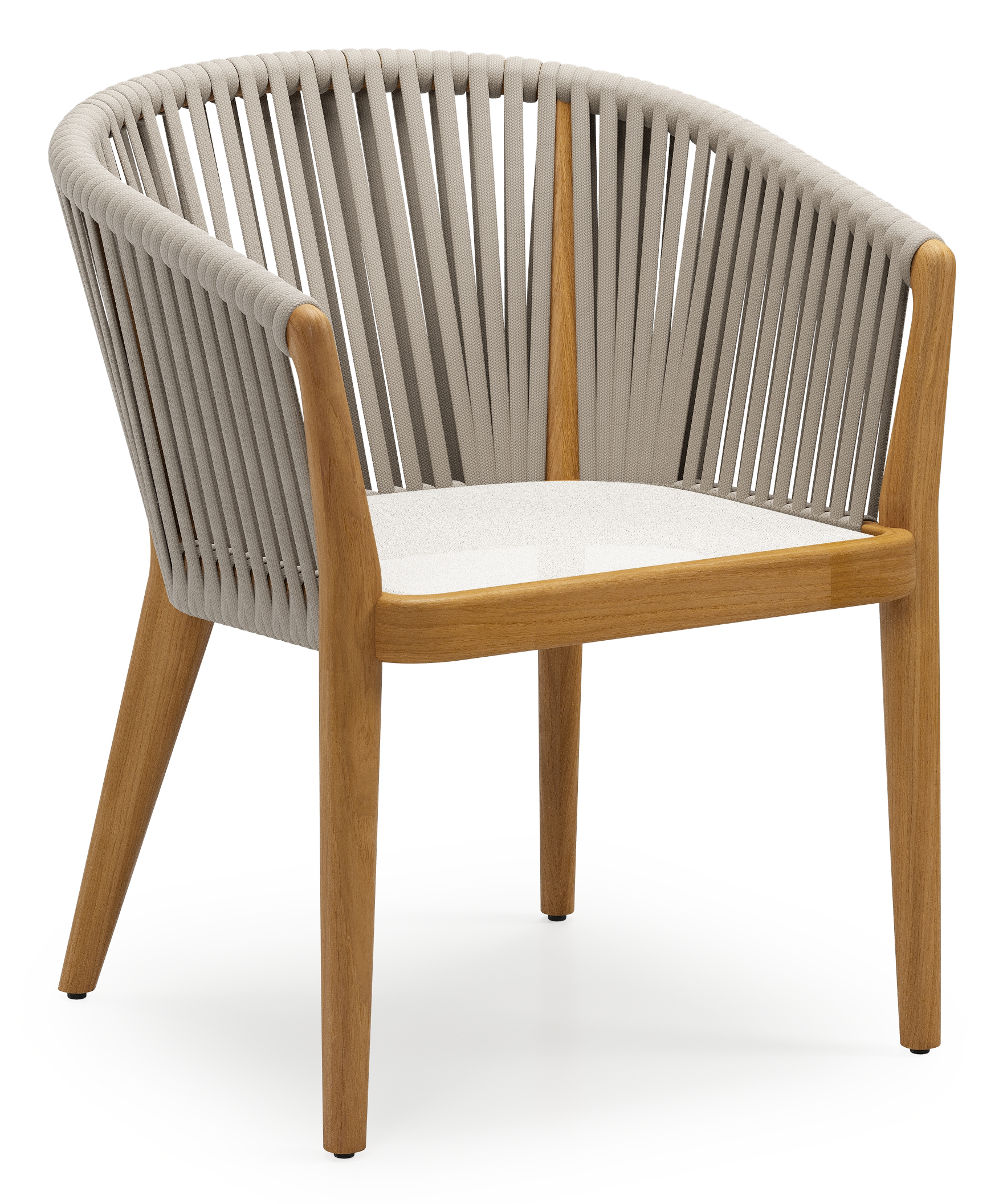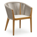 Een tuinstoel uit teak staat gelijk aan bijzondere kwaliteit en natuurlijk design. Teak is een kwalitatieve houtsoort gekenmerkt door zijn hardheid. Aangezien hout leeft, kan de structuur of kleur licht anders zijn dan op het beeld weergegeven.De rug- en armleuning is afgewerkt met luxe vlakke rope en heeft een platte en rechthoekige dwarsdoorsnede en biedt een luxueuze en gezellige uitstraling aan de stoel.De zitting is afgewerkt met textilene, een stijlvol materiaal dat erg stevig en onderhoudsvriendelijk is. Het is een materiaal dat bovendien weerbestendig is en daarbij dus ook snel droogt. Textilene buigt gemakkelijk mee met het lichaam, maar is ook erg vormvast, waardoor er niet snel verzakkingen ontstaan. De elasticiteit maakt het comfortabel om te zitten.
