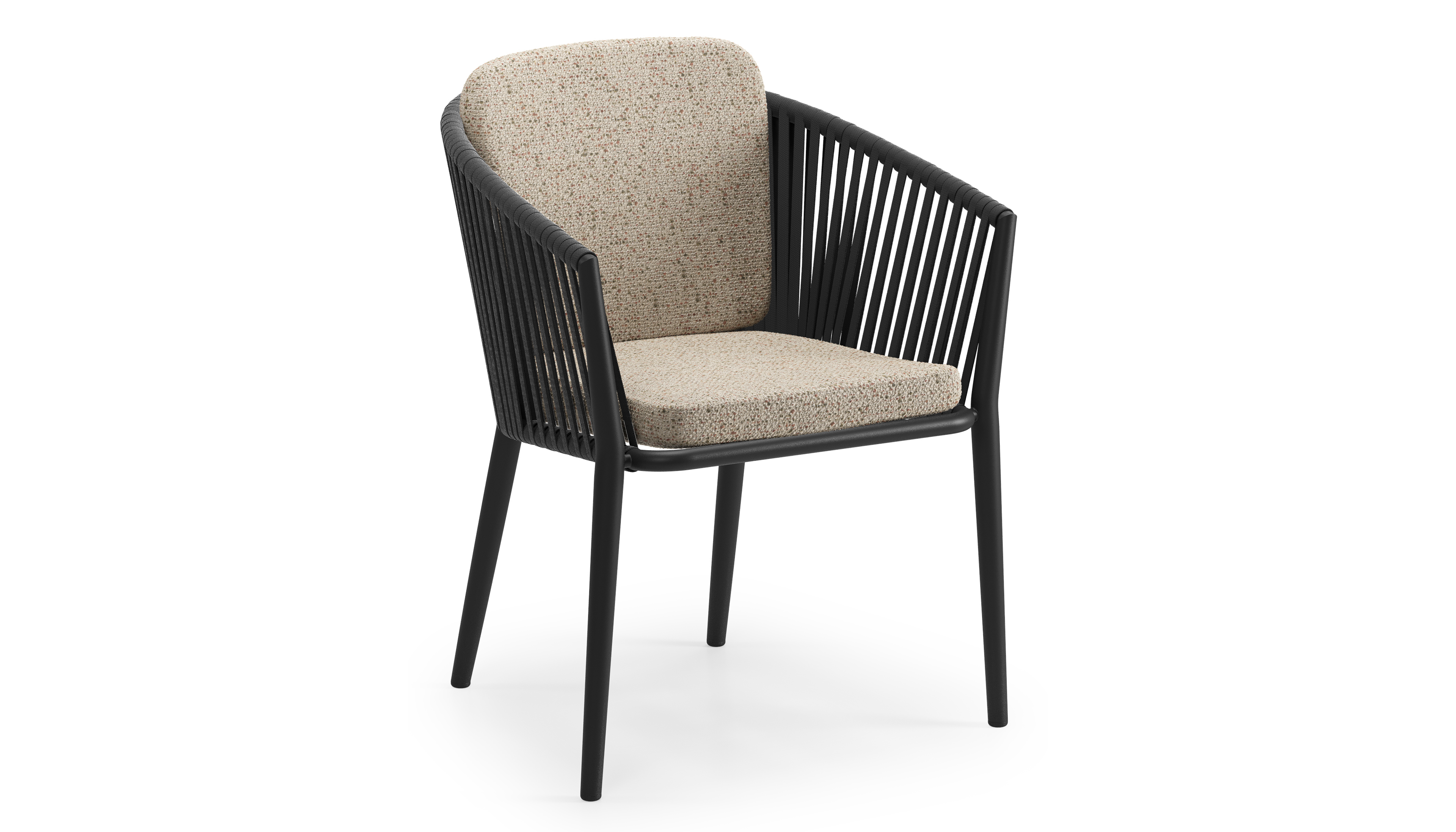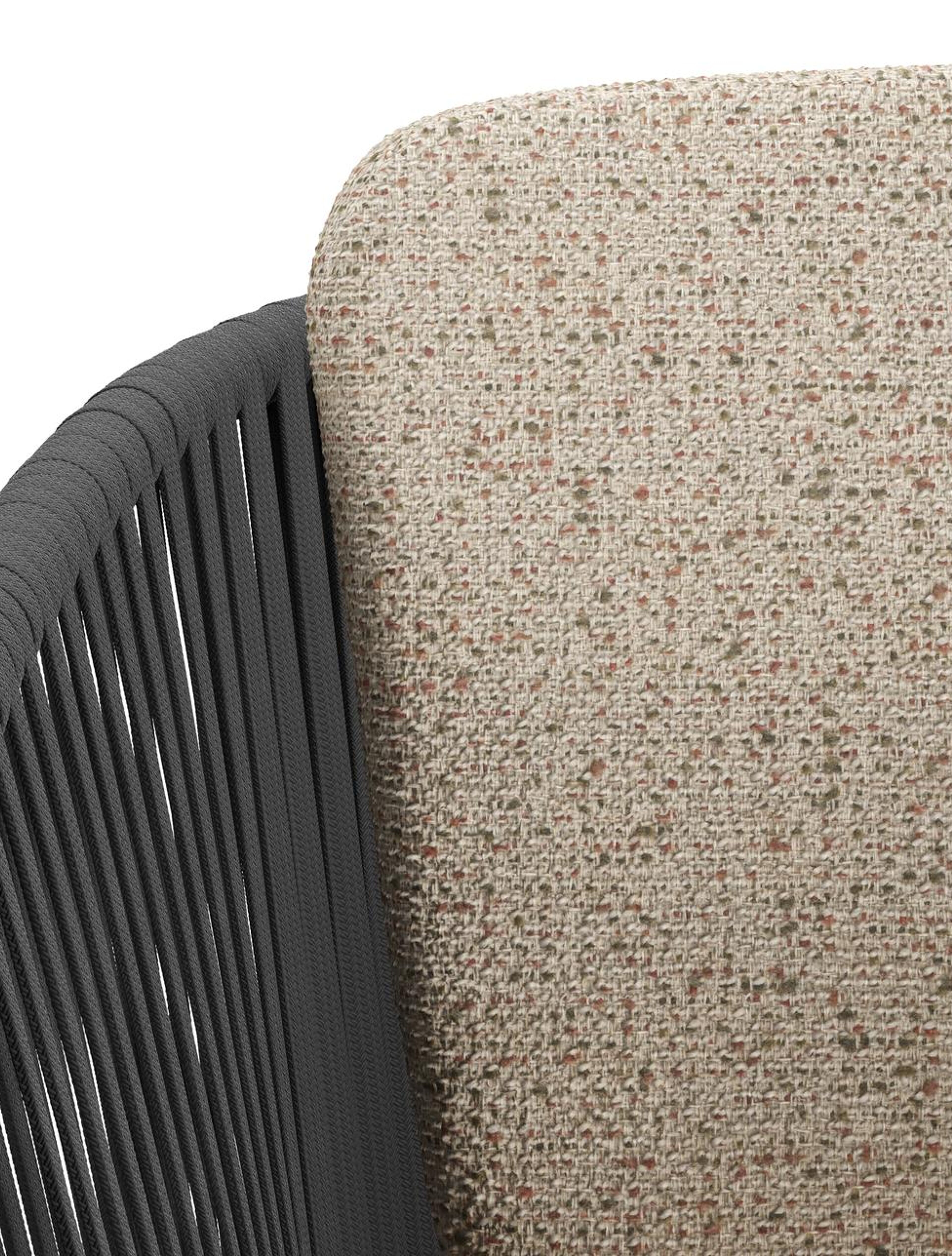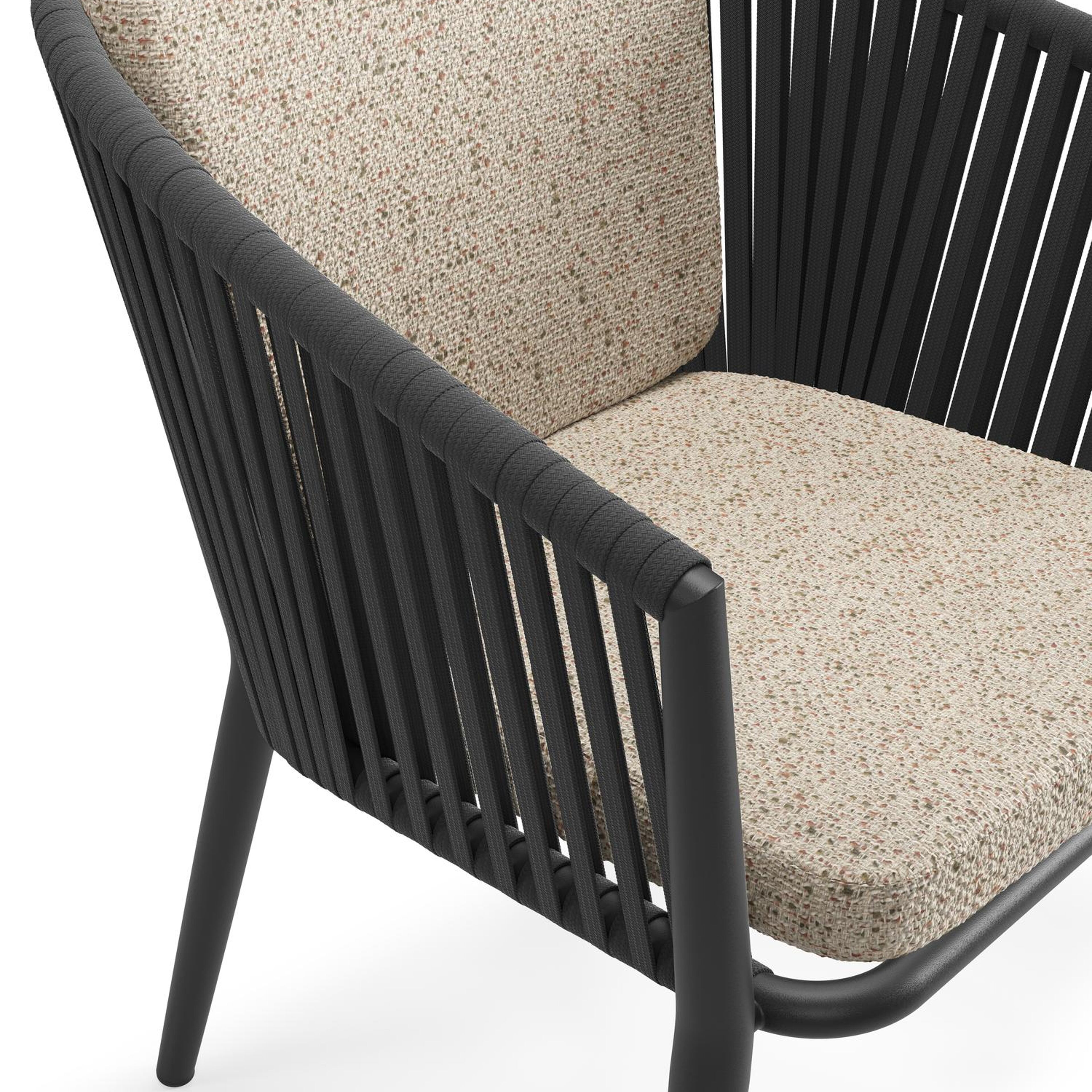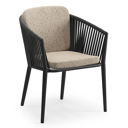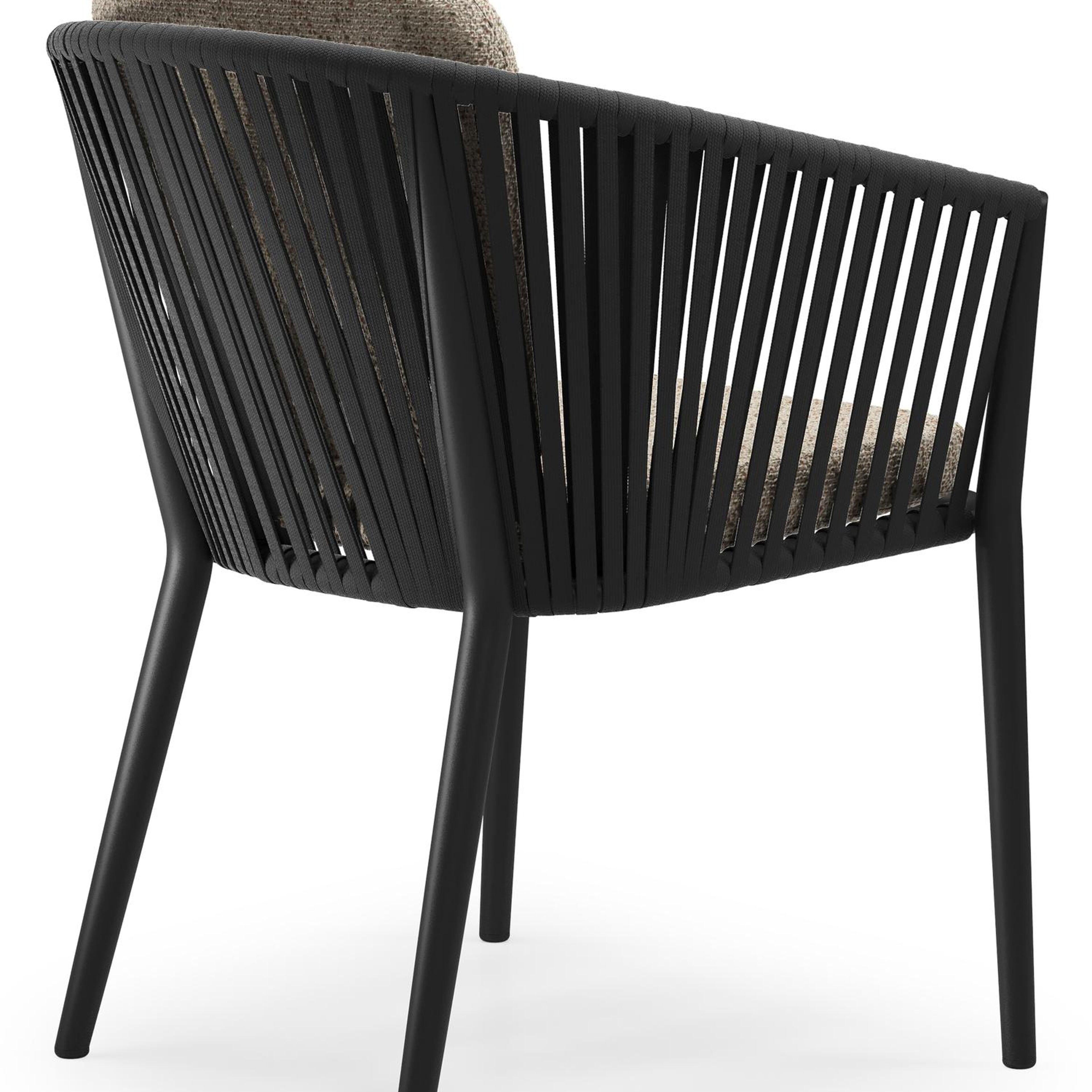 Orso tuinstoel in zwart aluminium en zwart verticaal geweven vlakke rope met zitkussen in All Weather Cosytica Bora Jungle | Exterioo tuinmeubelen