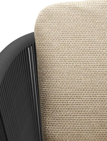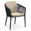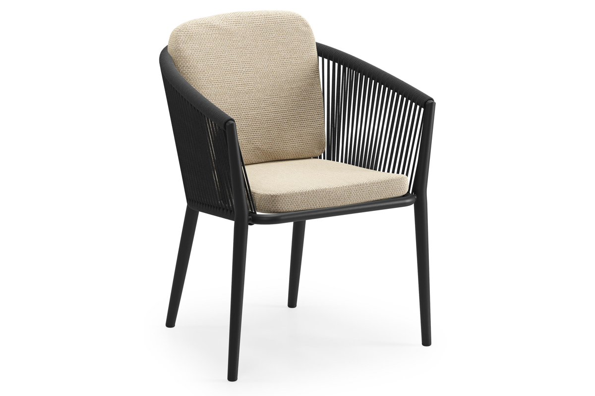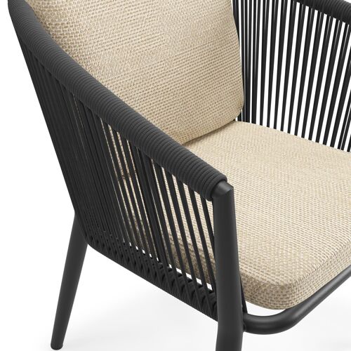 Orso tuinstoel in zwart aluminium en zwart verticaal geweven ronde rope met luxe zitkussen in All Weather Cosytica Althea Camel | Exterioo