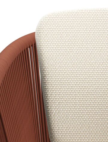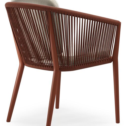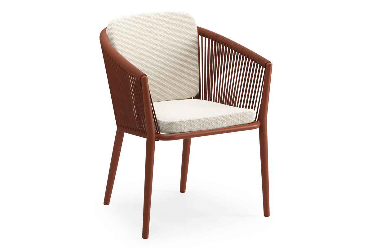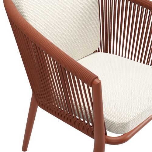 Orso tuinstoel in roestbruin aluminium en roestbruin verticaal geweven ronde rope met zitkussen in All Weather Cosytica Althea Off White | Exterioo