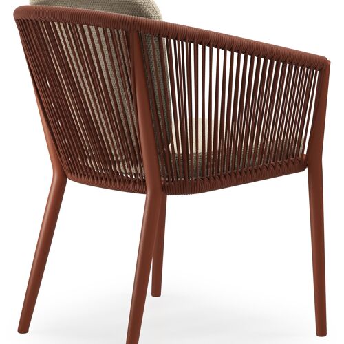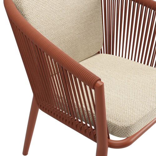 Orso tuinstoel in roestbruin aluminium en roestbruin verticaal geweven ronde rope met zitkussen in All Weather Cosytica Althea Camel | Exterioo
