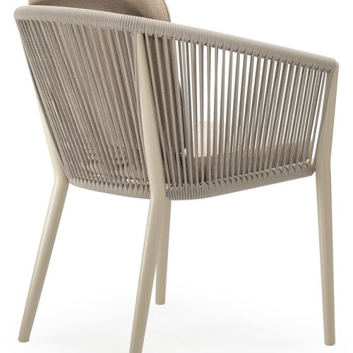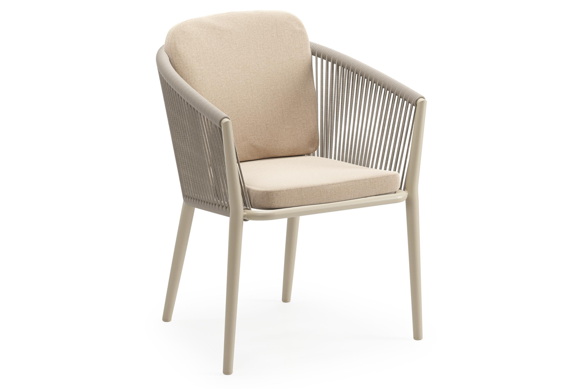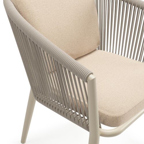 Orso tuinstoel in beige aluminium en beige verticaal geweven ronde rope met luxe zitkussen in All Weather Sunbrella® Luxe Natte Heather Beige | Exterioo