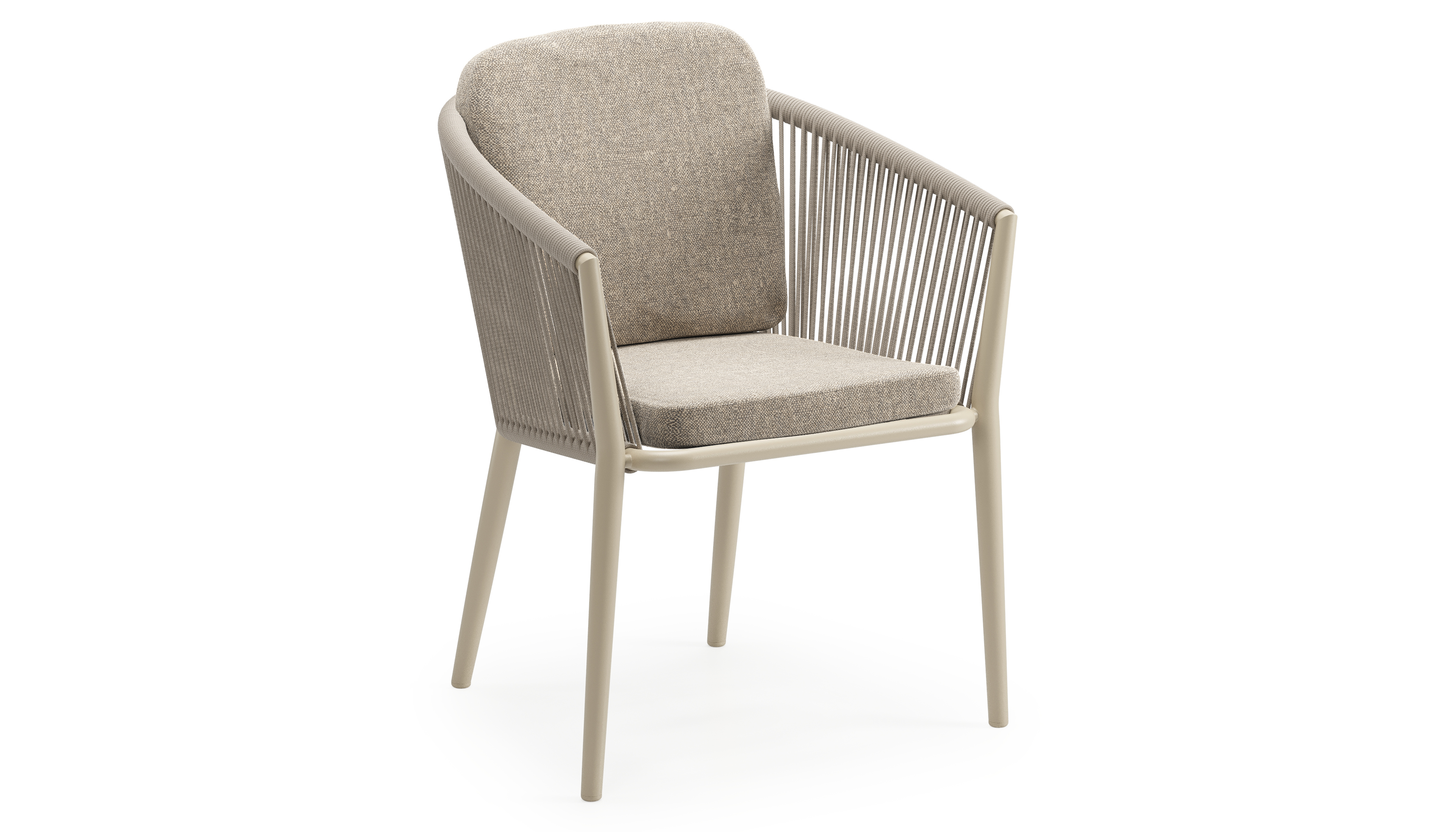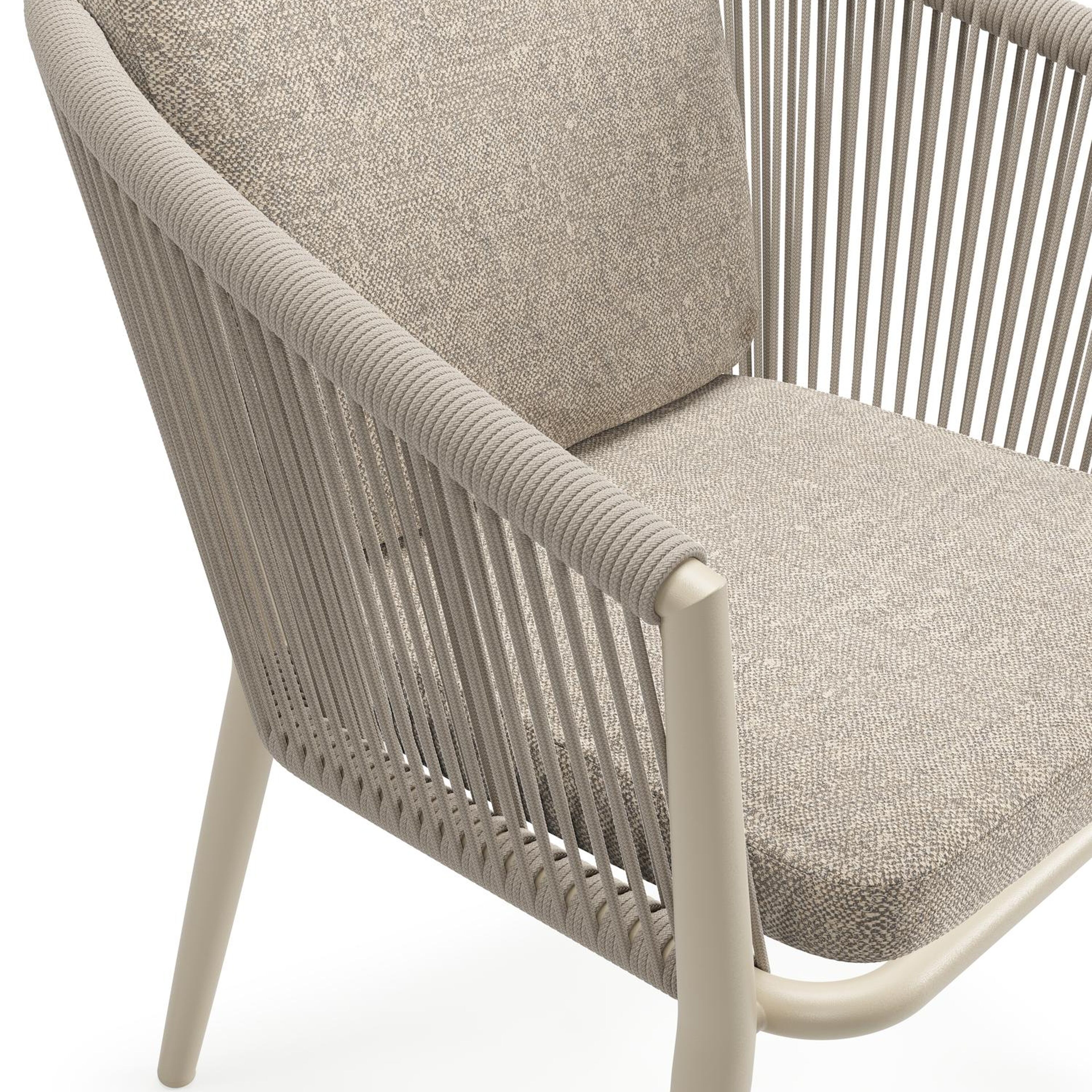 Orso tuinstoel in beige aluminium en beige verticaal geweven ronde rope met luxe zitkussen in All Weather Sunbrella® Luxe Chartres Pewter | Exterioo tuinmeubelen