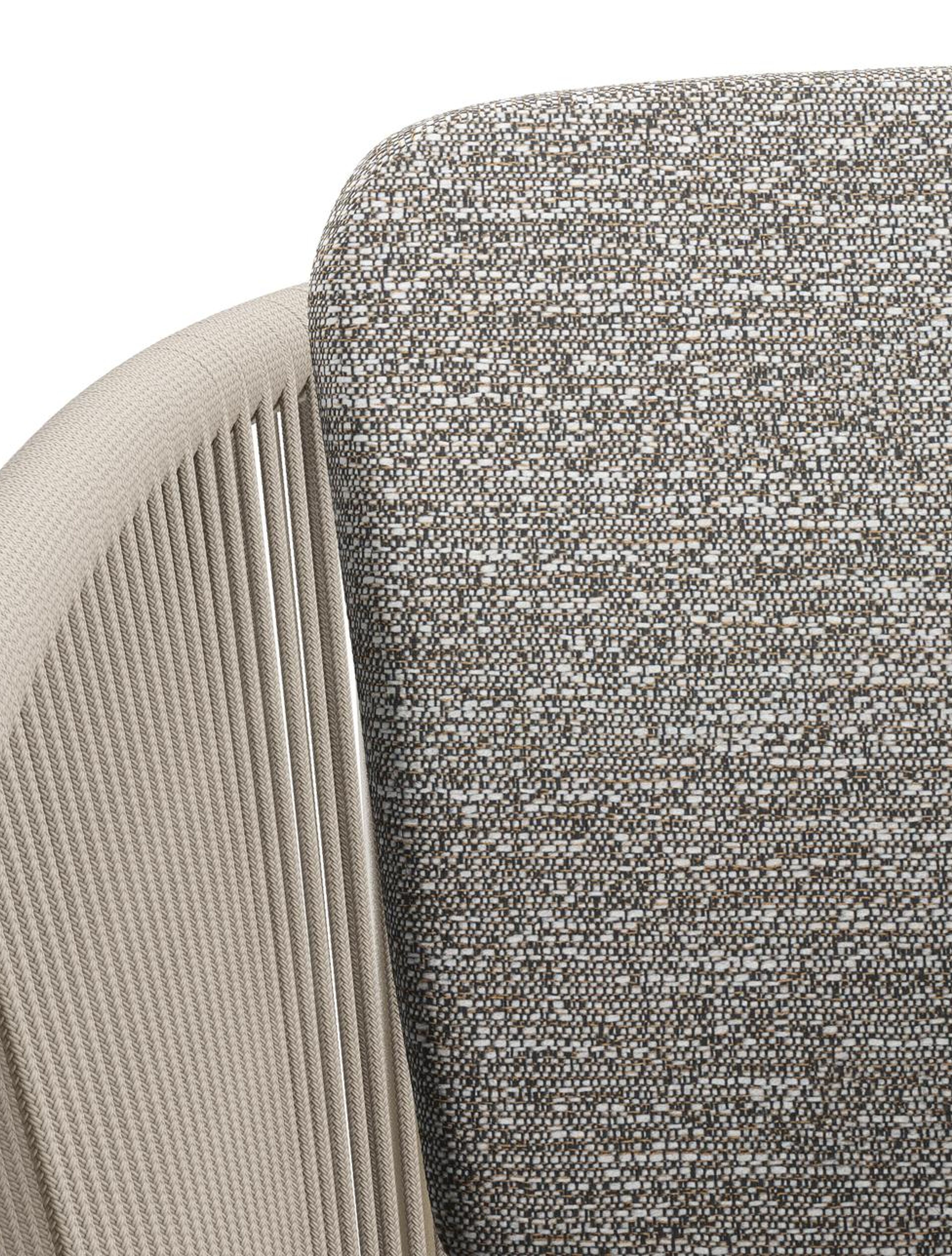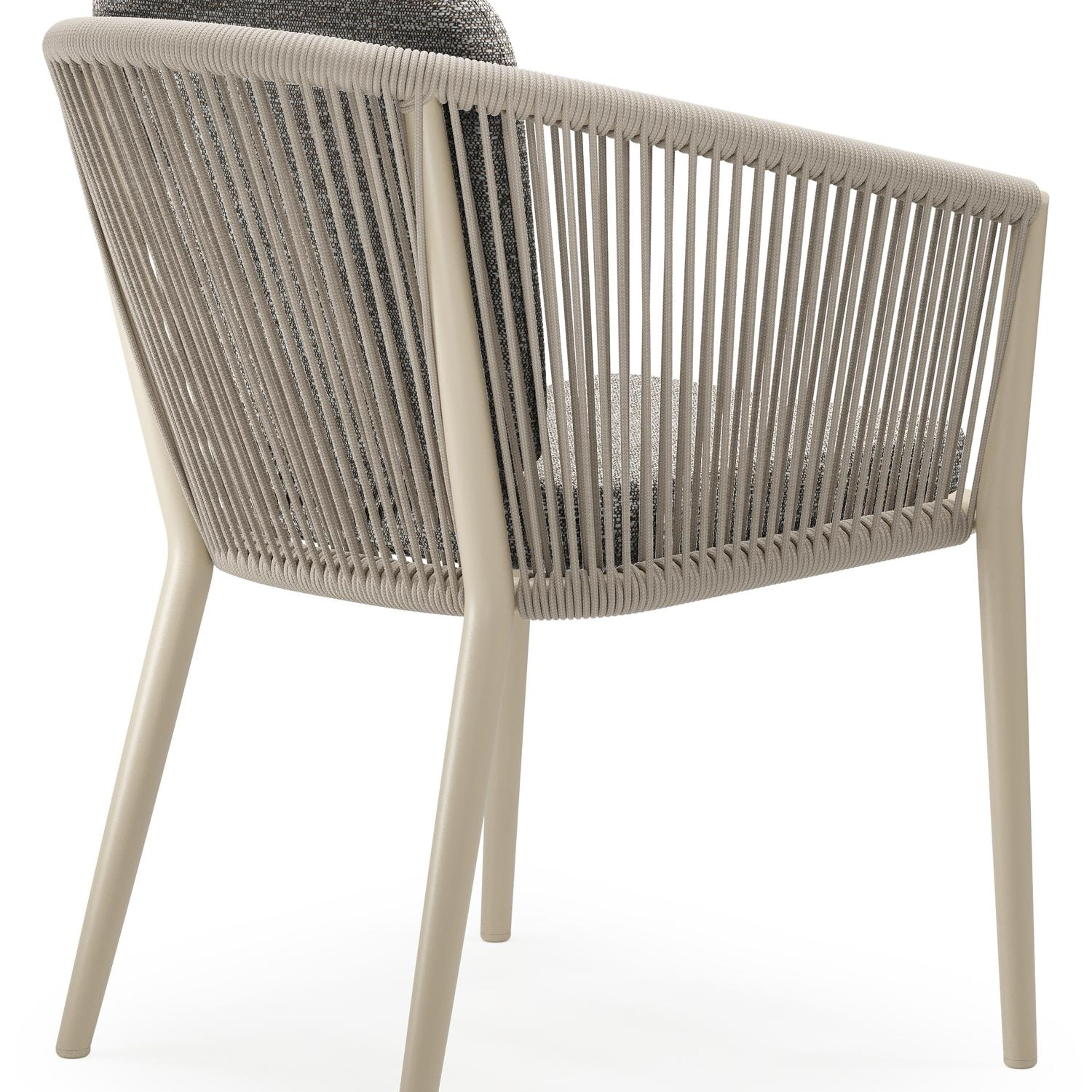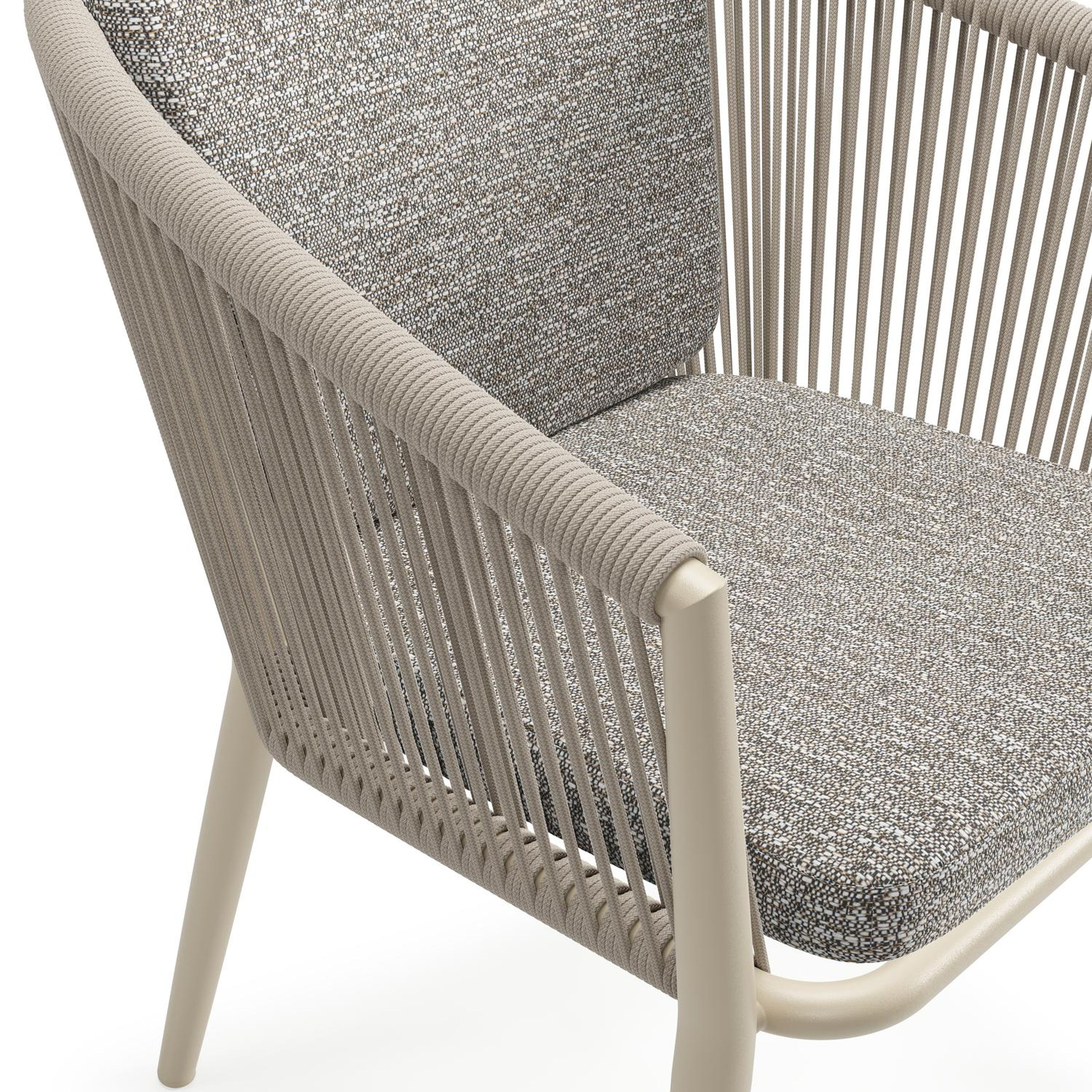 Orso tuinstoel in beige aluminium en beige verticaal geweven ronde rope met zitkussen in All Weather Sunbrella® Luxe Tundra Pepper | Exterioo tuinmeubelen