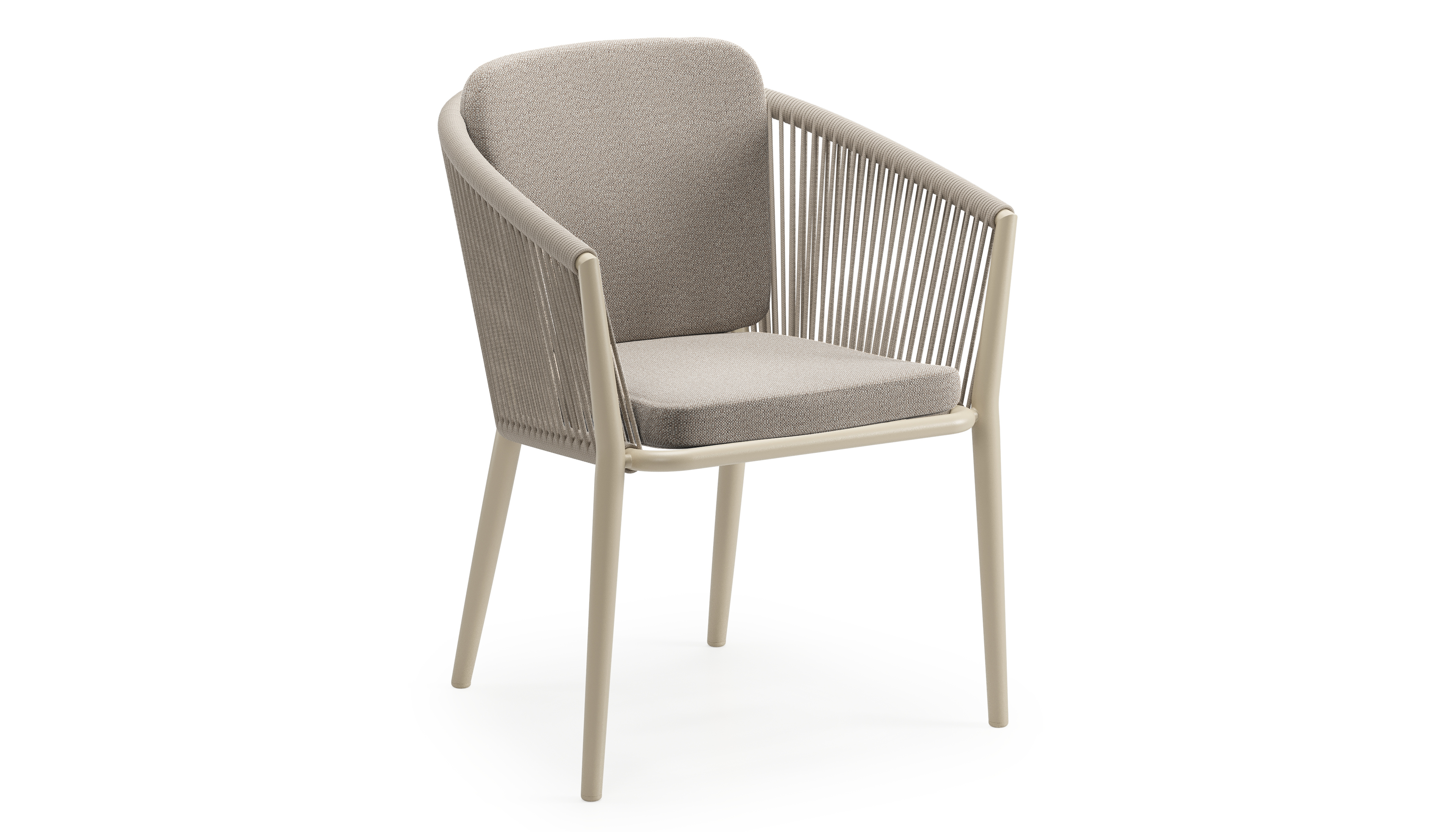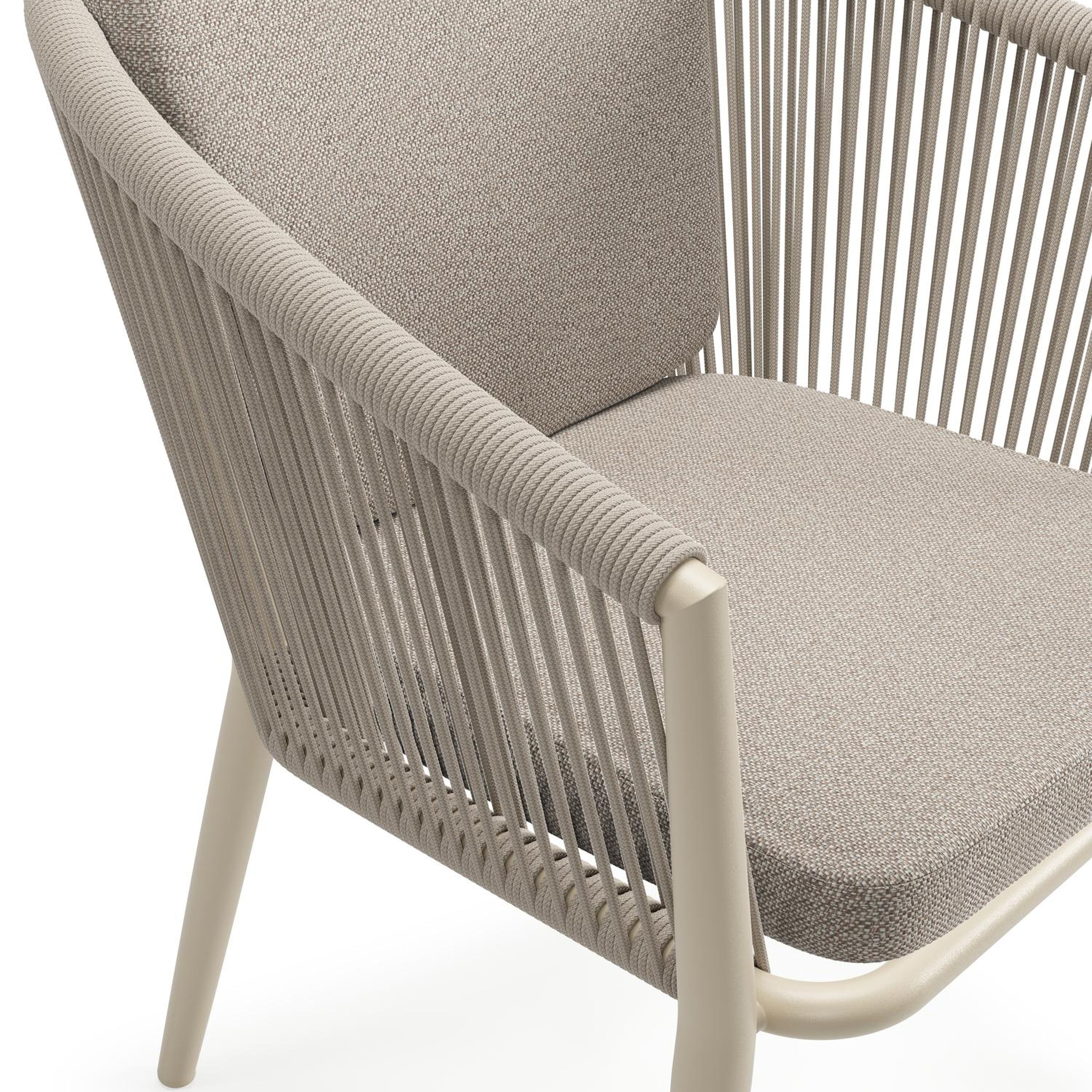 Orso tuinstoel in beige aluminium en beige verticaal geweven ronde rope met zitkussen in All Weather Sunbrella® Luxe Savane Coconut | Exterioo tuinmeubelen