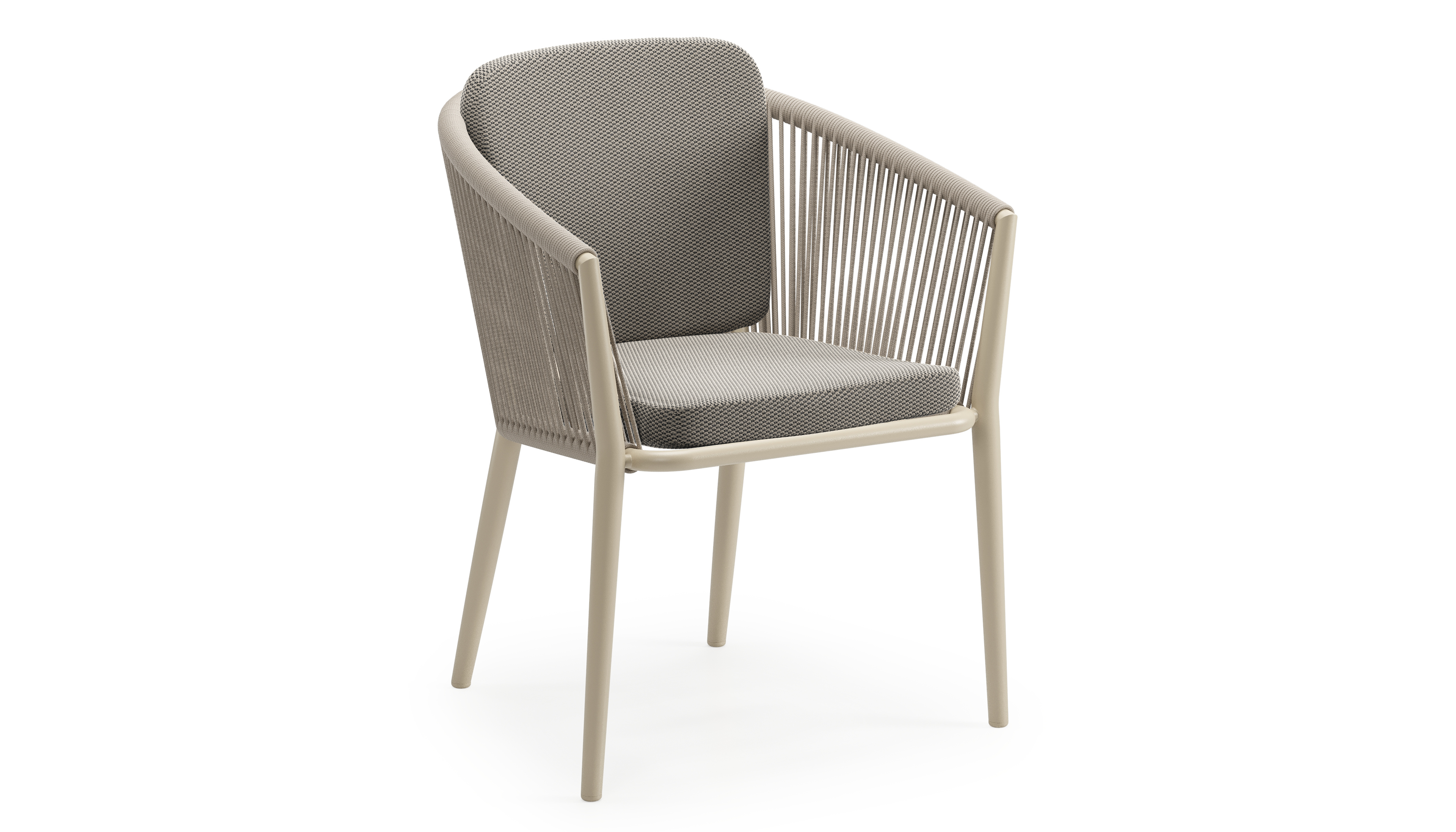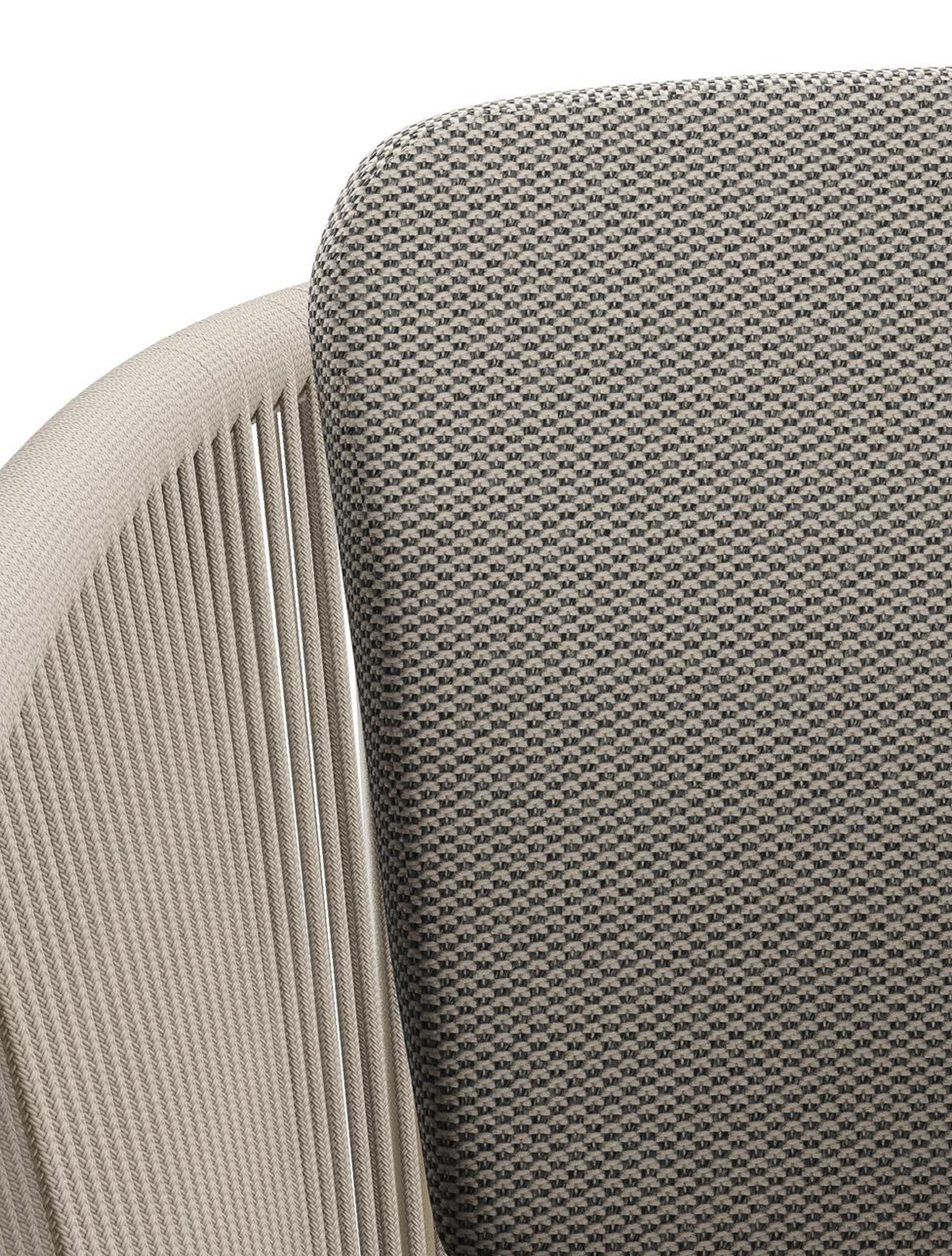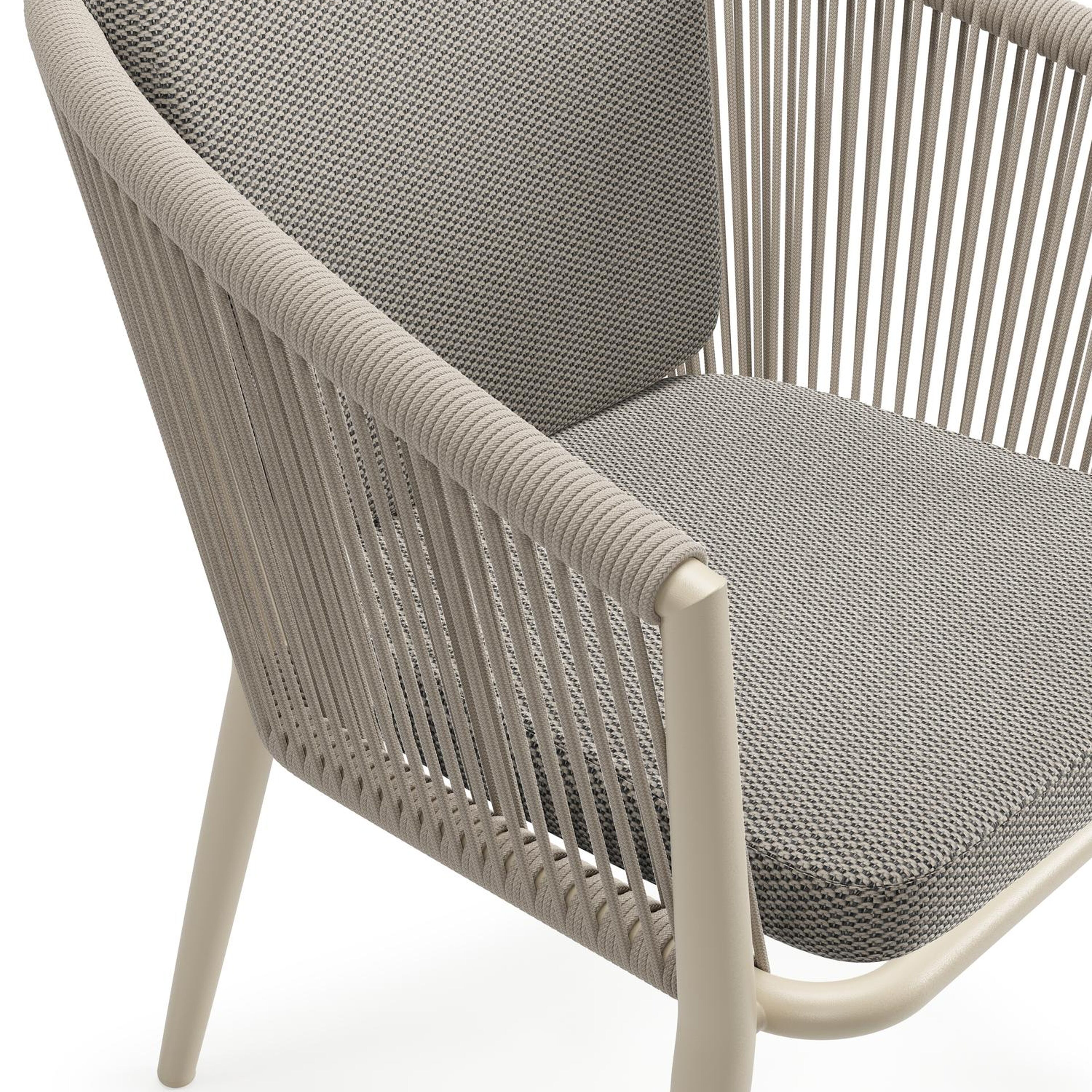 Orso tuinstoel in beige aluminium en beige verticaal geweven ronde rope met zitkussen in All Weather Sunbrella® Luxe Lopi Charcoal | Exterioo tuinmeubelen