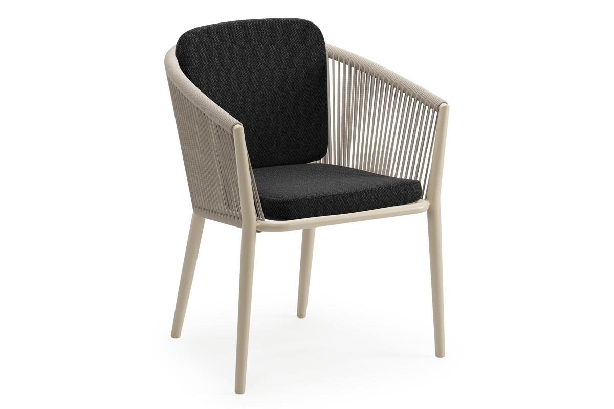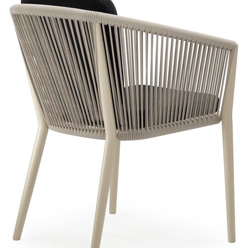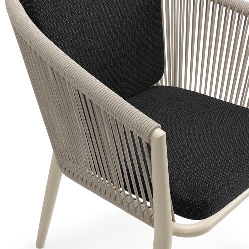 Orso tuinstoel in beige aluminium en beige verticaal geweven ronde rope met zitkussen in All Weather Sunbrella® Luxe Lopi Baribal | Exterioo