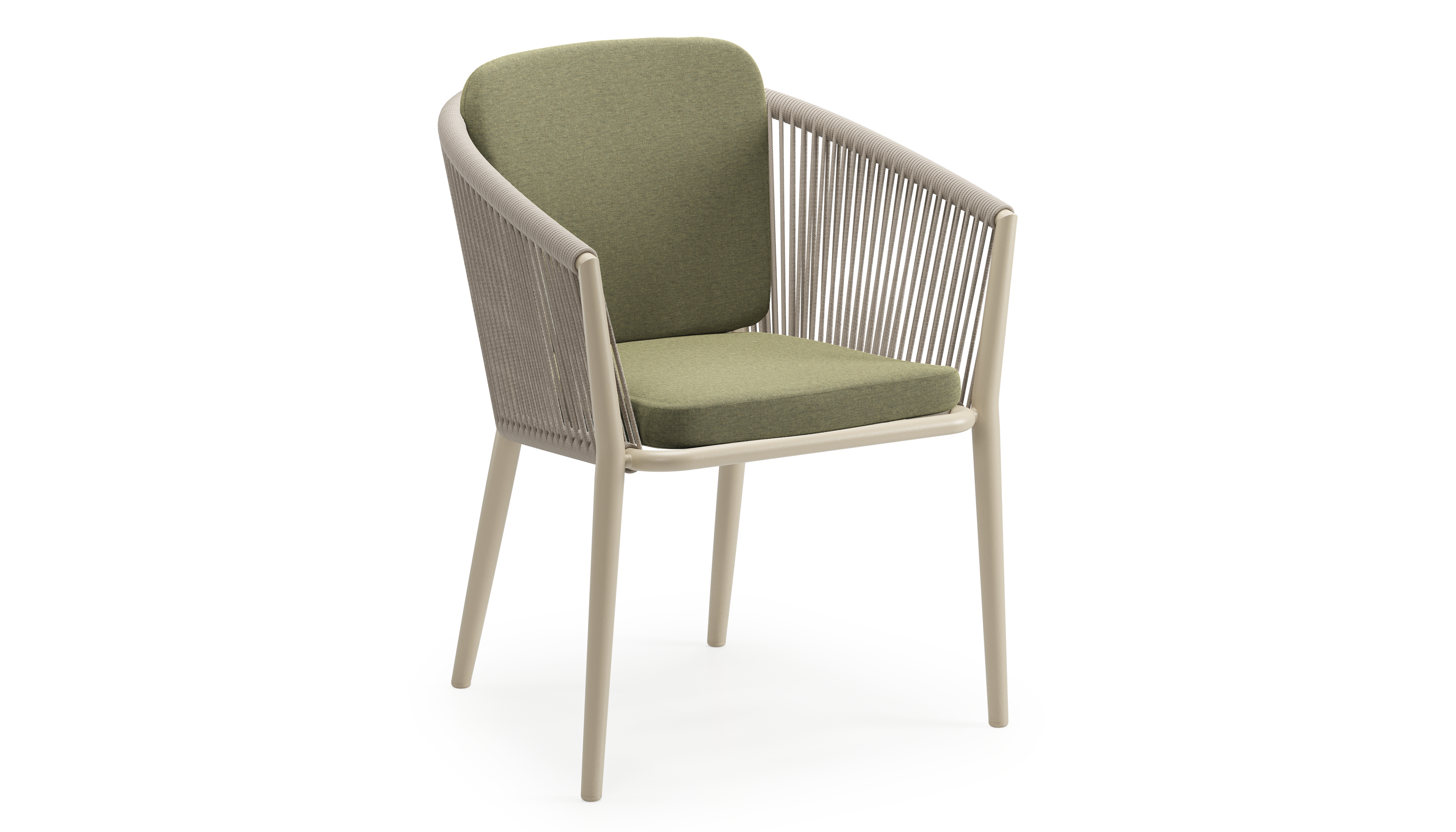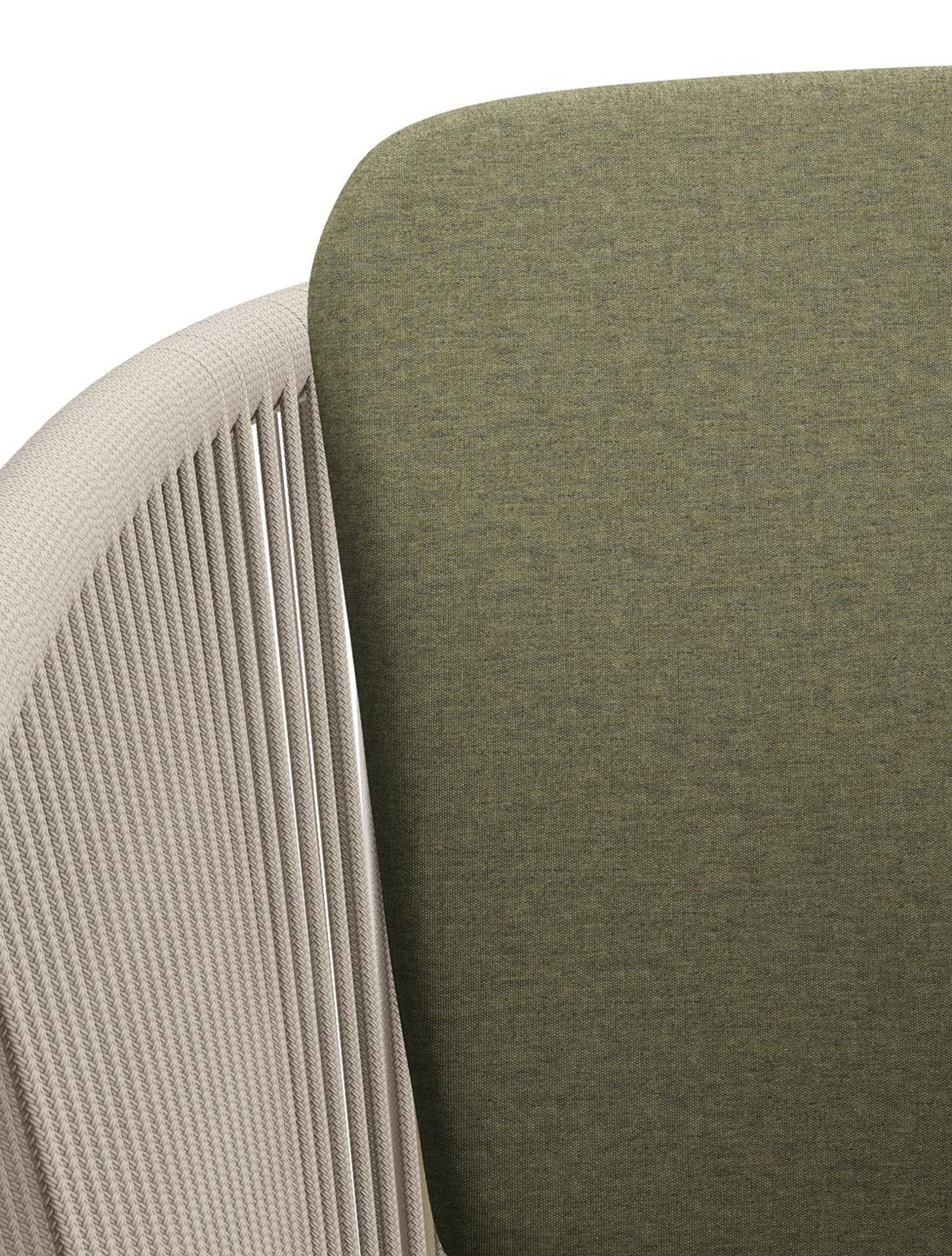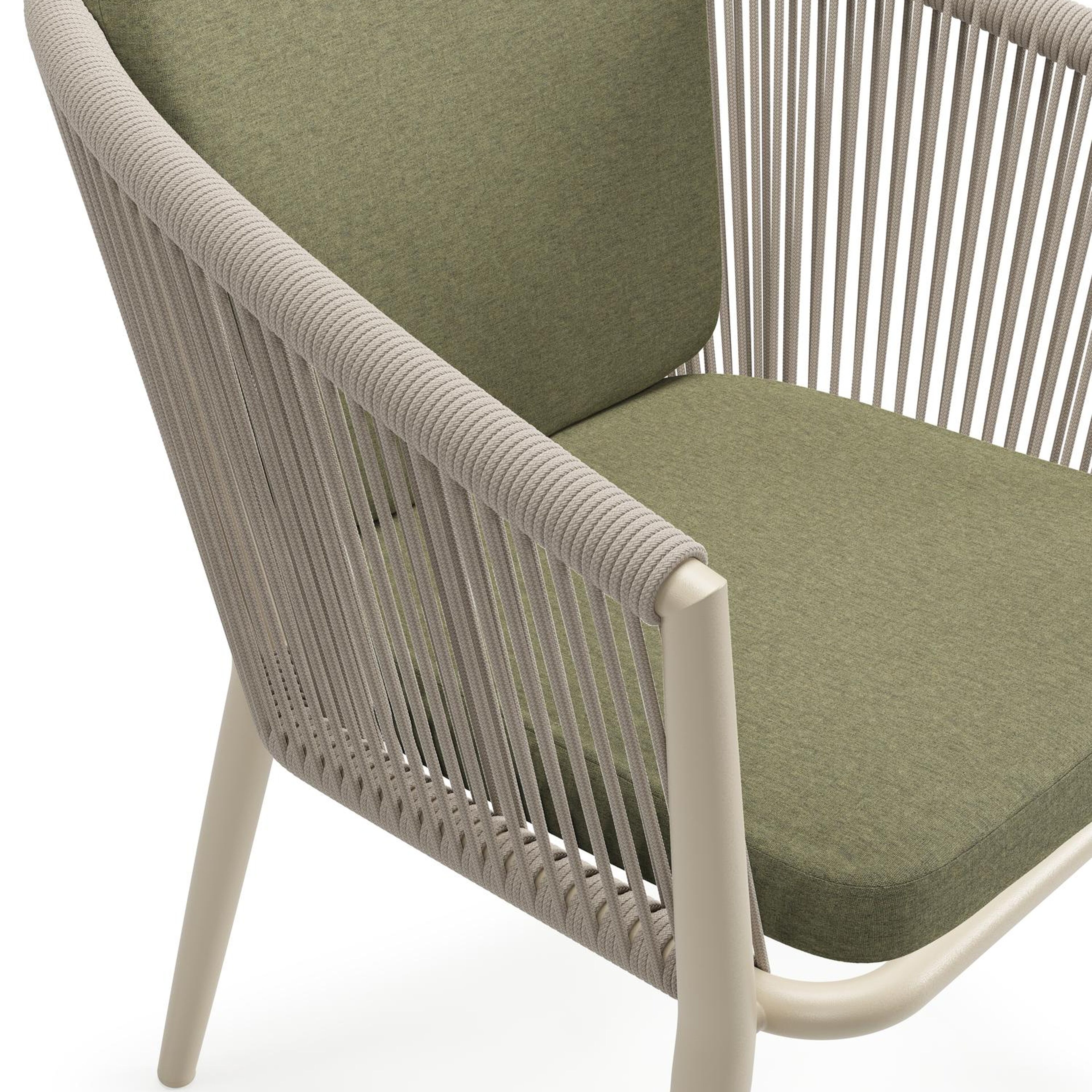 Orso tuinstoel in beige aluminium en beige verticaal geweven ronde rope met zitkussen in All Weather Sunbrella® Luxe Heritage Leaf | Exterioo tuinmeubelen
