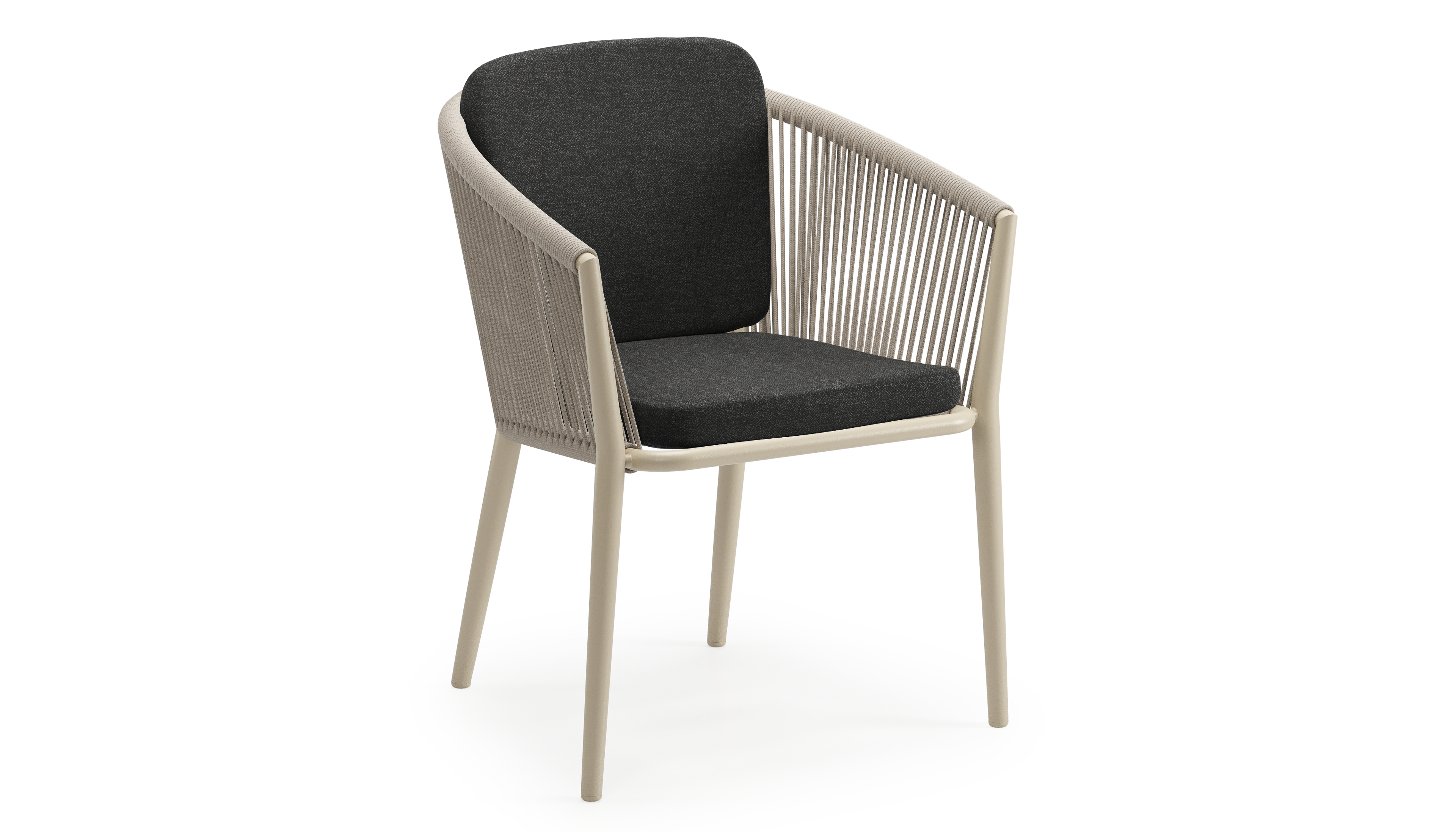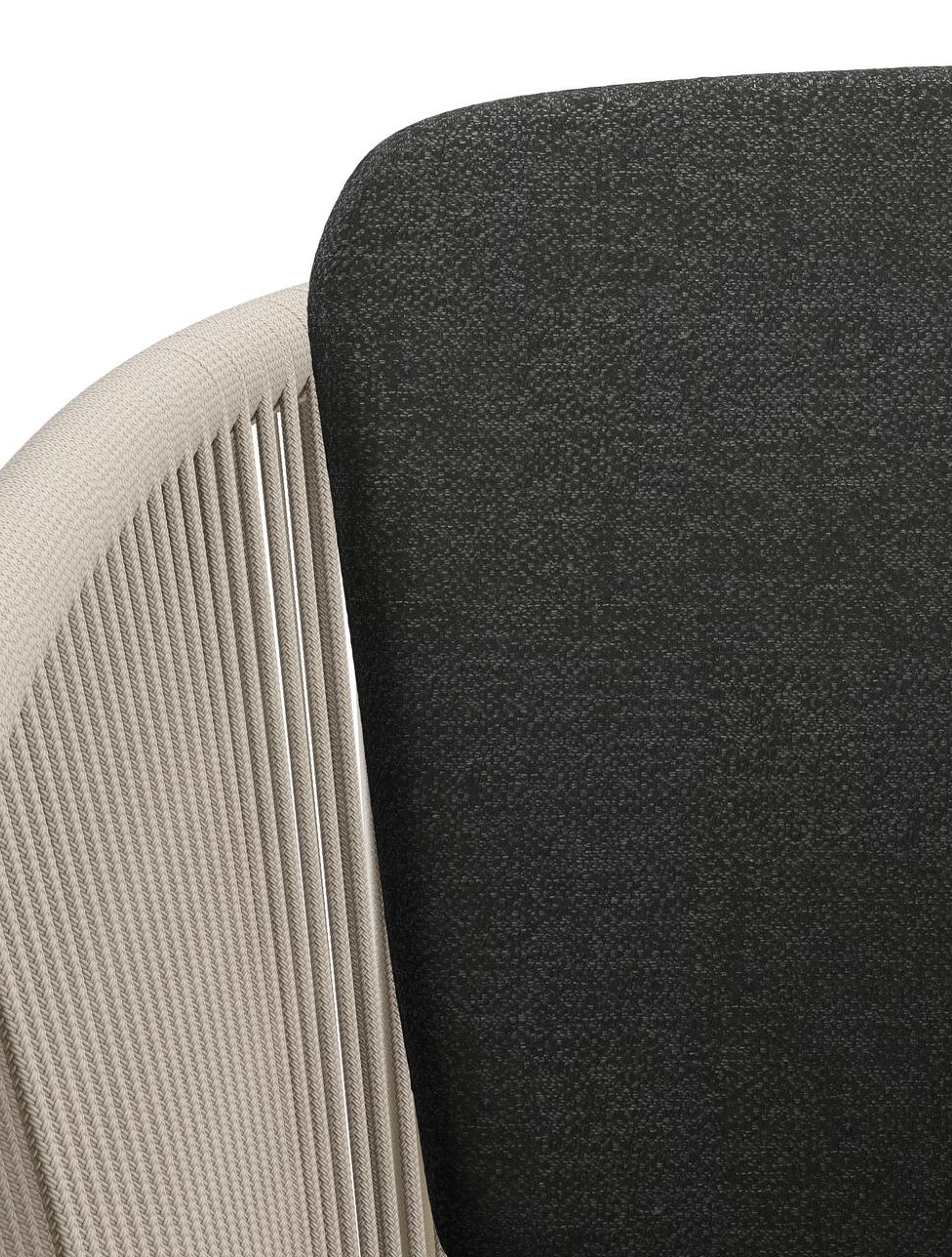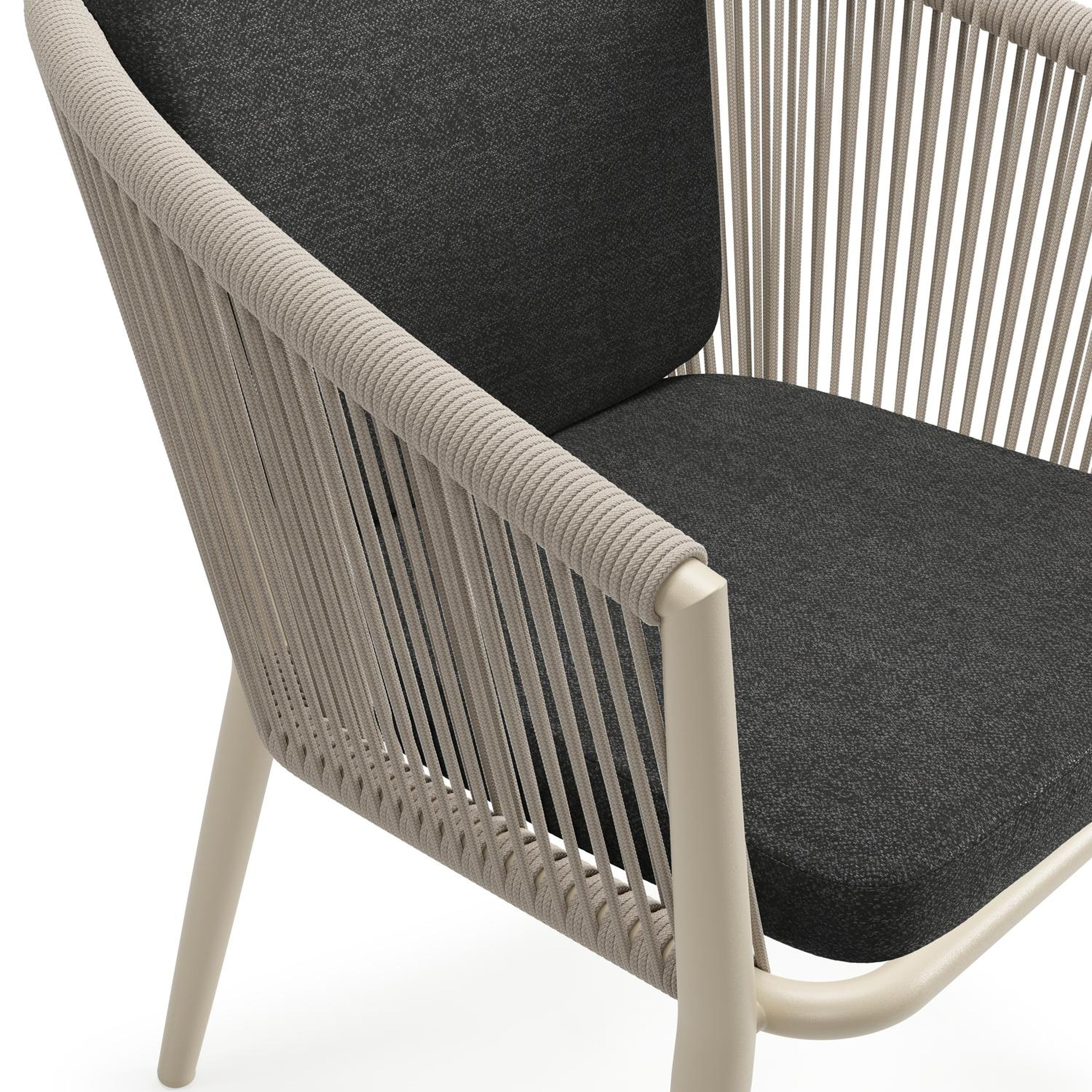 Orso tuinstoel in beige aluminium en beige verticaal geweven ronde rope met zitkussen in All Weather Sunbrella® Luxe Chartres Sooty | Exterioo tuinmeubelen