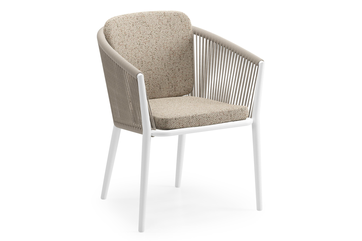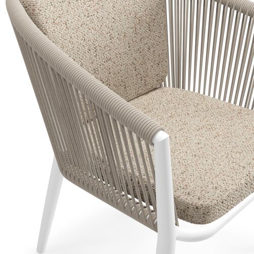 Orso tuinstoel in wit aluminium en beige verticaal geweven ronde rope met zitkussen in All Weather Cosytica Bora Jungle | Exterioo