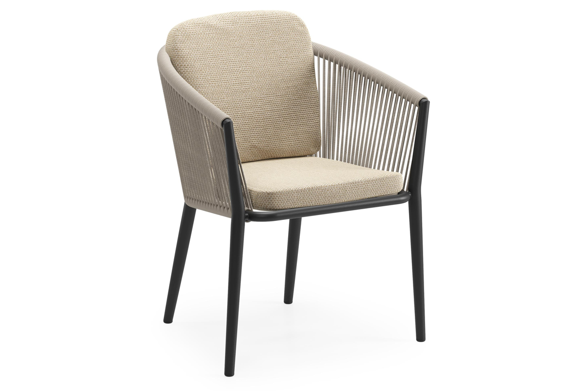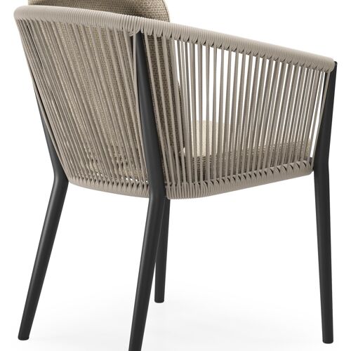 Orso tuinstoel in zwart aluminium en beige verticaal geweven ronde rope met luxe zitkussen in All Weather Cosytica Althea Camel | Exterioo