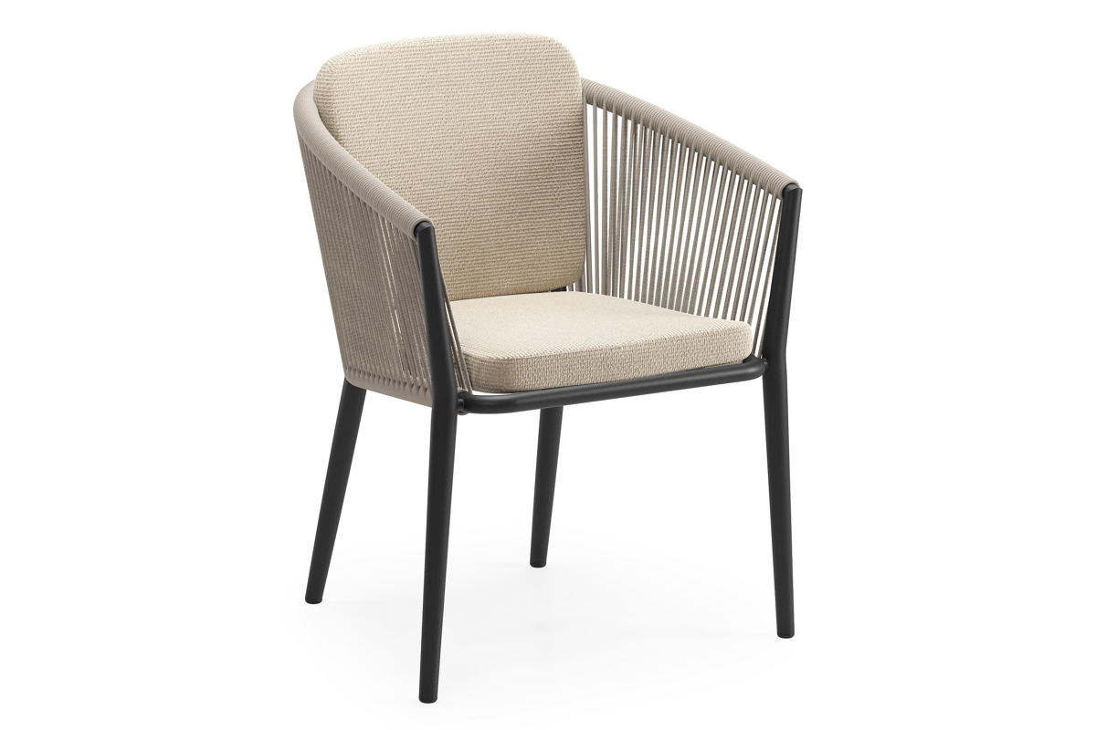 Orso tuinstoel in zwart aluminium en beige verticaal geweven ronde rope met zitkussen in All Weather Cosytica Althea Chalk | Exterioo