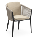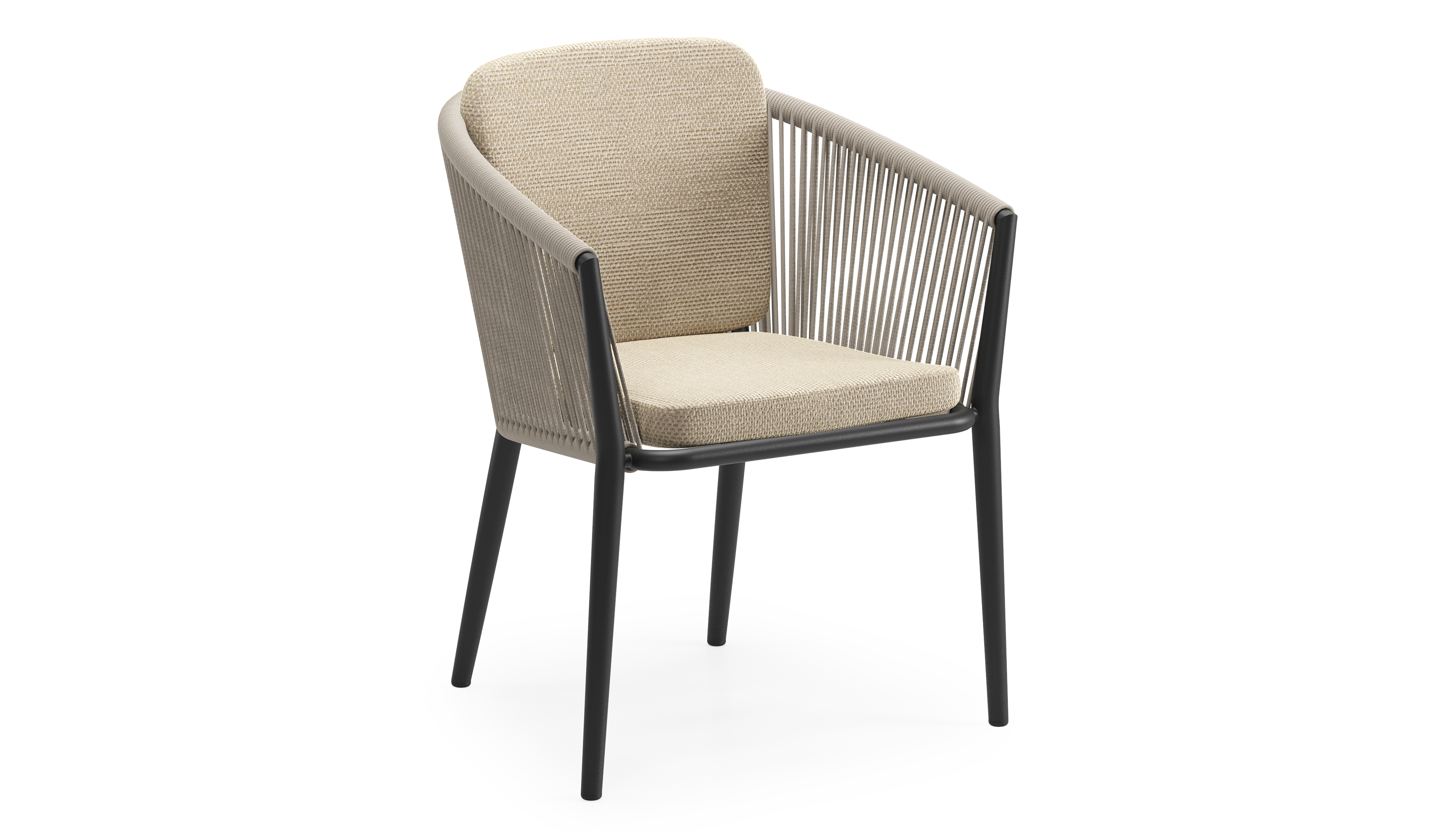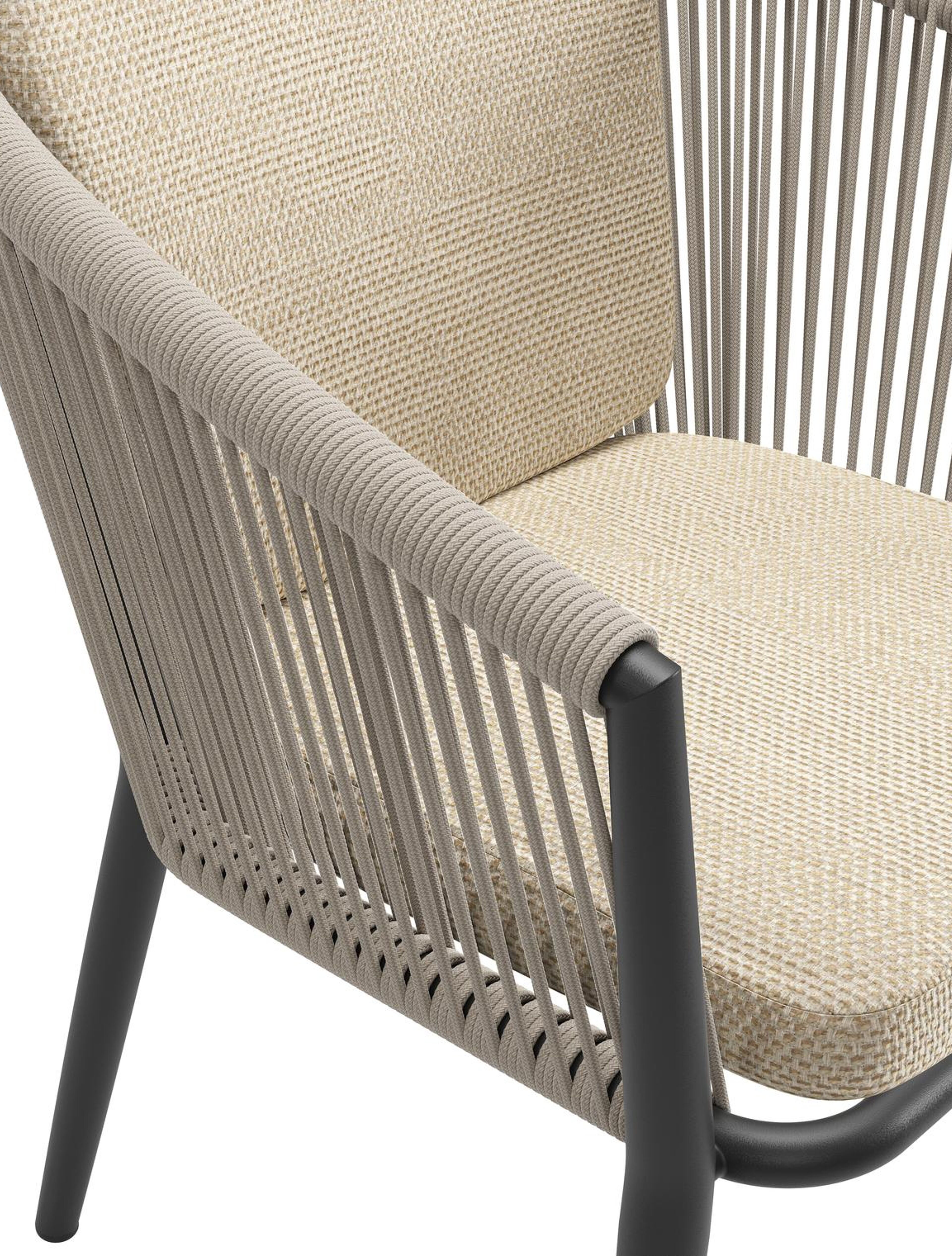 Orso tuinstoel in zwart aluminium en beige verticaal geweven ronde rope met zitkussen in All Weather Cosytica Althea Camel | Exterioo tuinmeubelen
