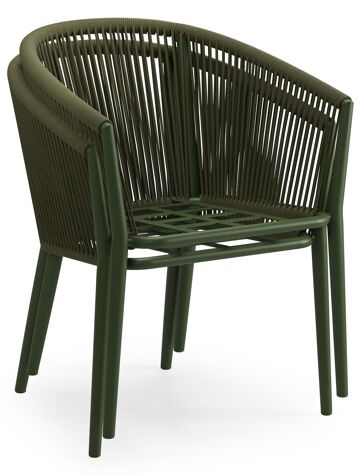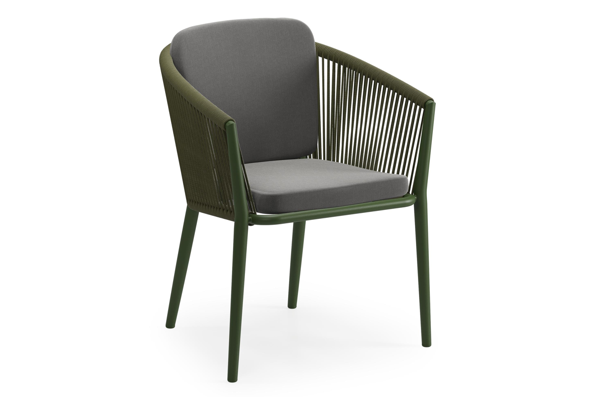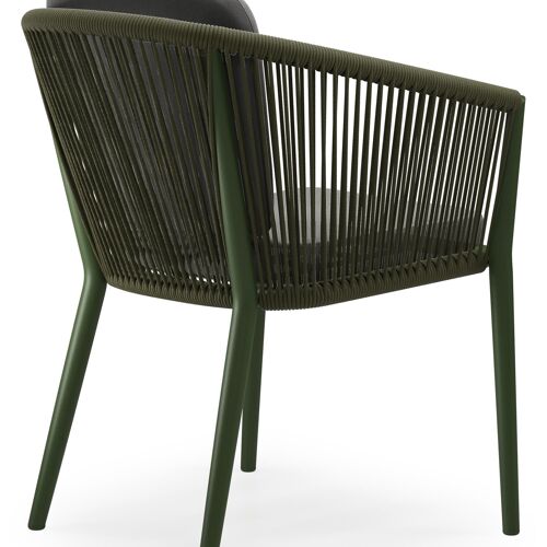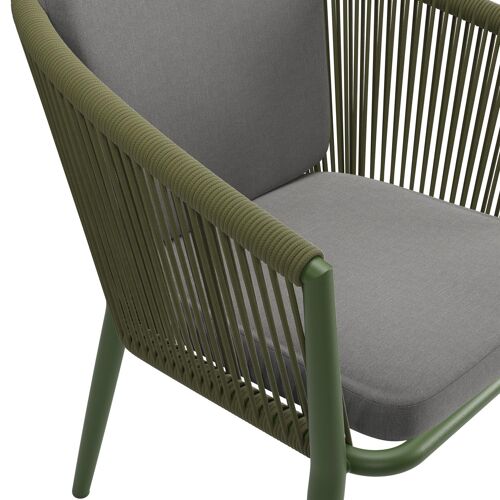 Orso tuinstoel in groen aluminium en groen verticaal geweven ronde rope met zitkussen in All Weather Sunbrella® Luxe Natte Charcoal Chine | Exterioo