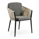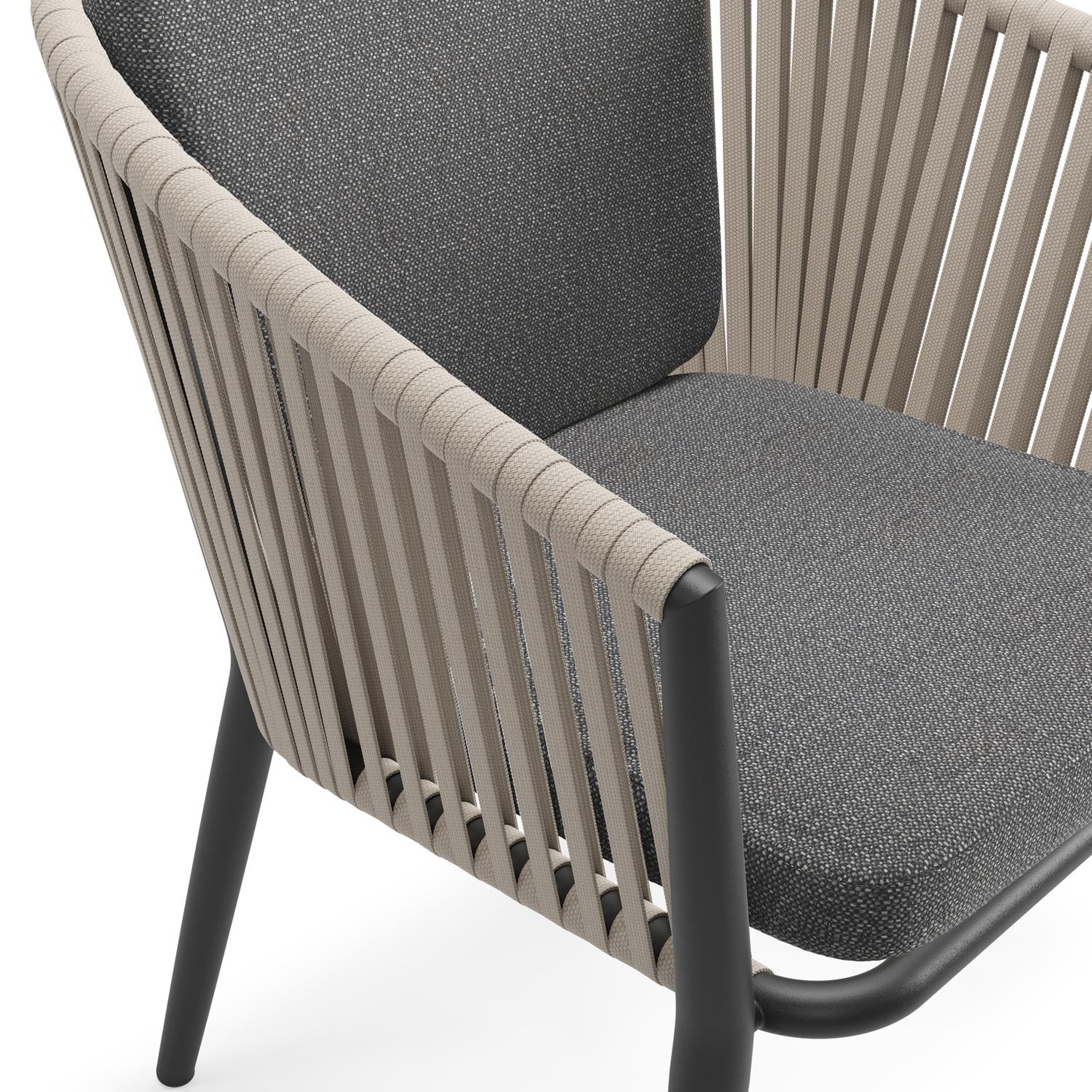 Orso tuinstoel in zwart aluminium en beige verticaal geweven vlakke rope met kussen in savane tornado all weather sunbrella® luxe | Exterioo tuinmeubelen