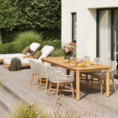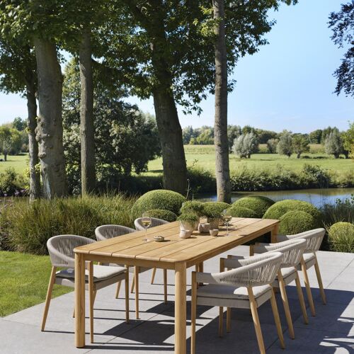 Een tuintafel uit teak staat gelijk aan bijzondere kwaliteit en natuurlijk design. Teak is een kwalitatieve houtsoort gekenmerkt door zijn hardheid. Aangezien hout leeft, kan de structuur of kleur licht anders zijn dan op het beeld weergegeven.