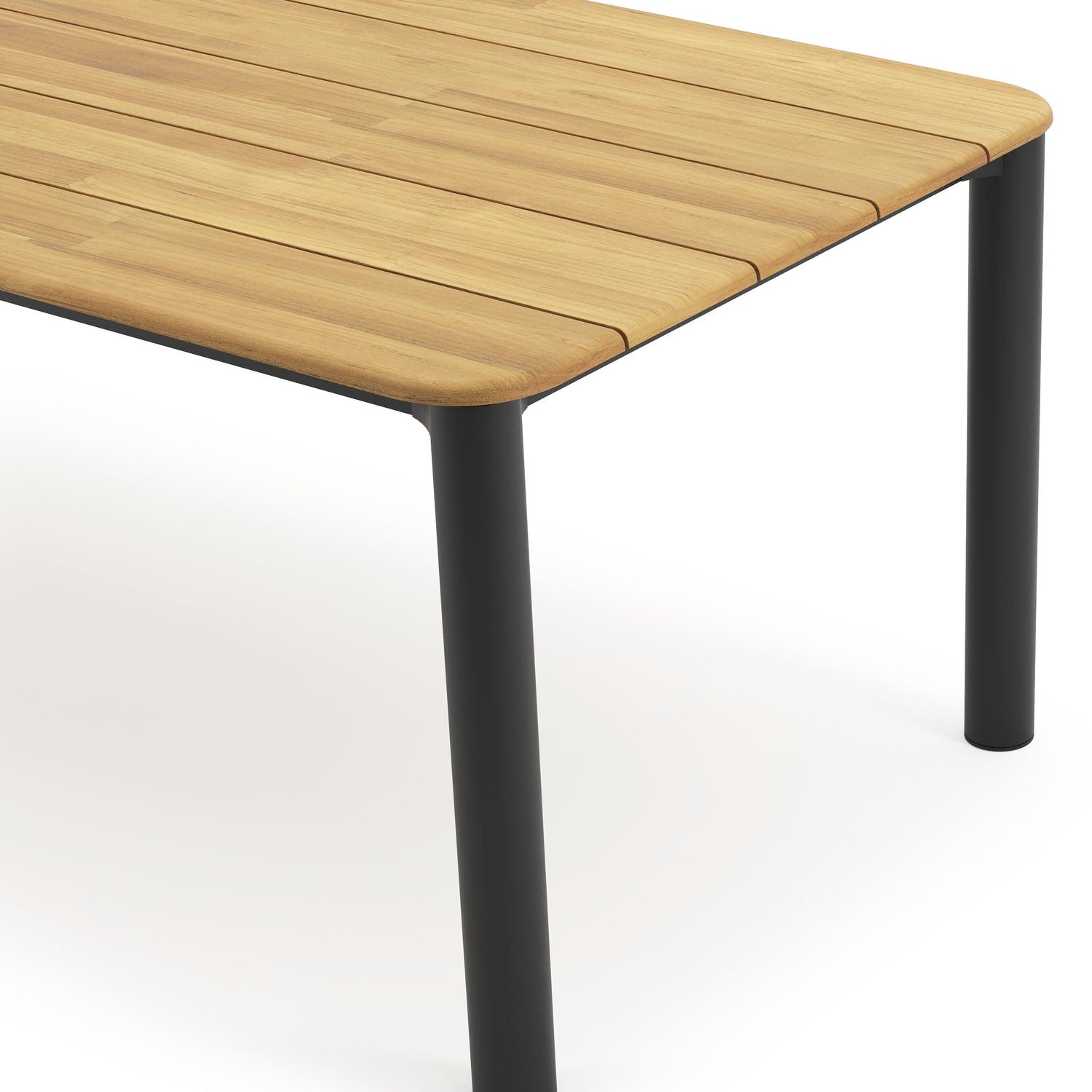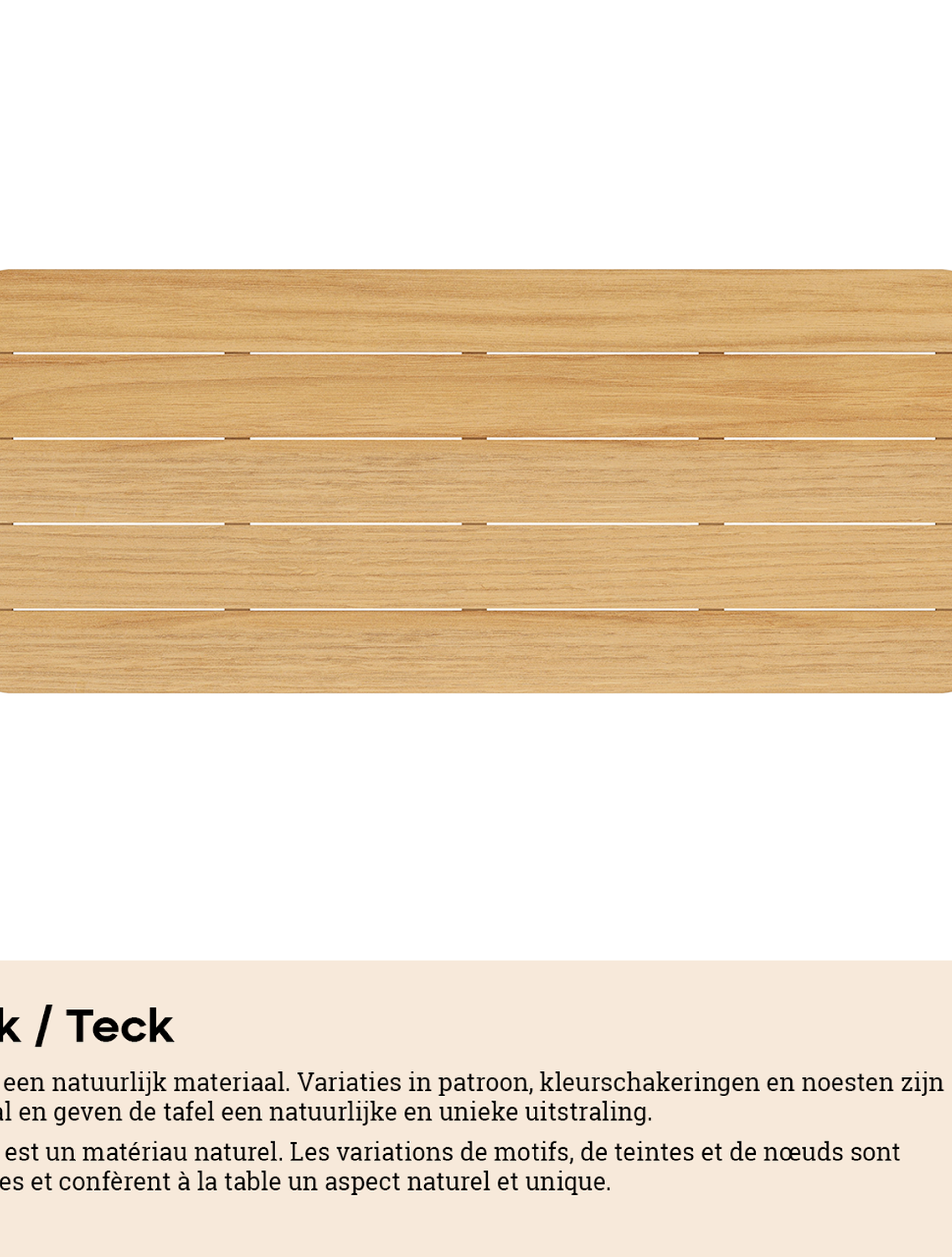 Een tafelblad uit teak staat gelijk aan bijzondere kwaliteit en natuurlijk design. Teak is een kwalitatieve houtsoort gekenmerkt door zijn hardheid. Aangezien hout leeft, kan de structuur of kleur licht anders zijn dan op het beeld weergegeven.