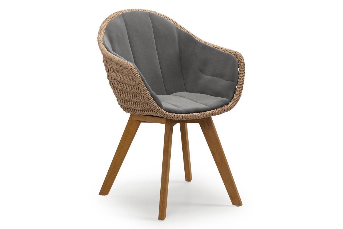 Pagino tuinstoel in teak en naturel ronde wicker met zitkussen in All Weather Sunbrella® Luxe Natte Charcoal Chine | Exterioo