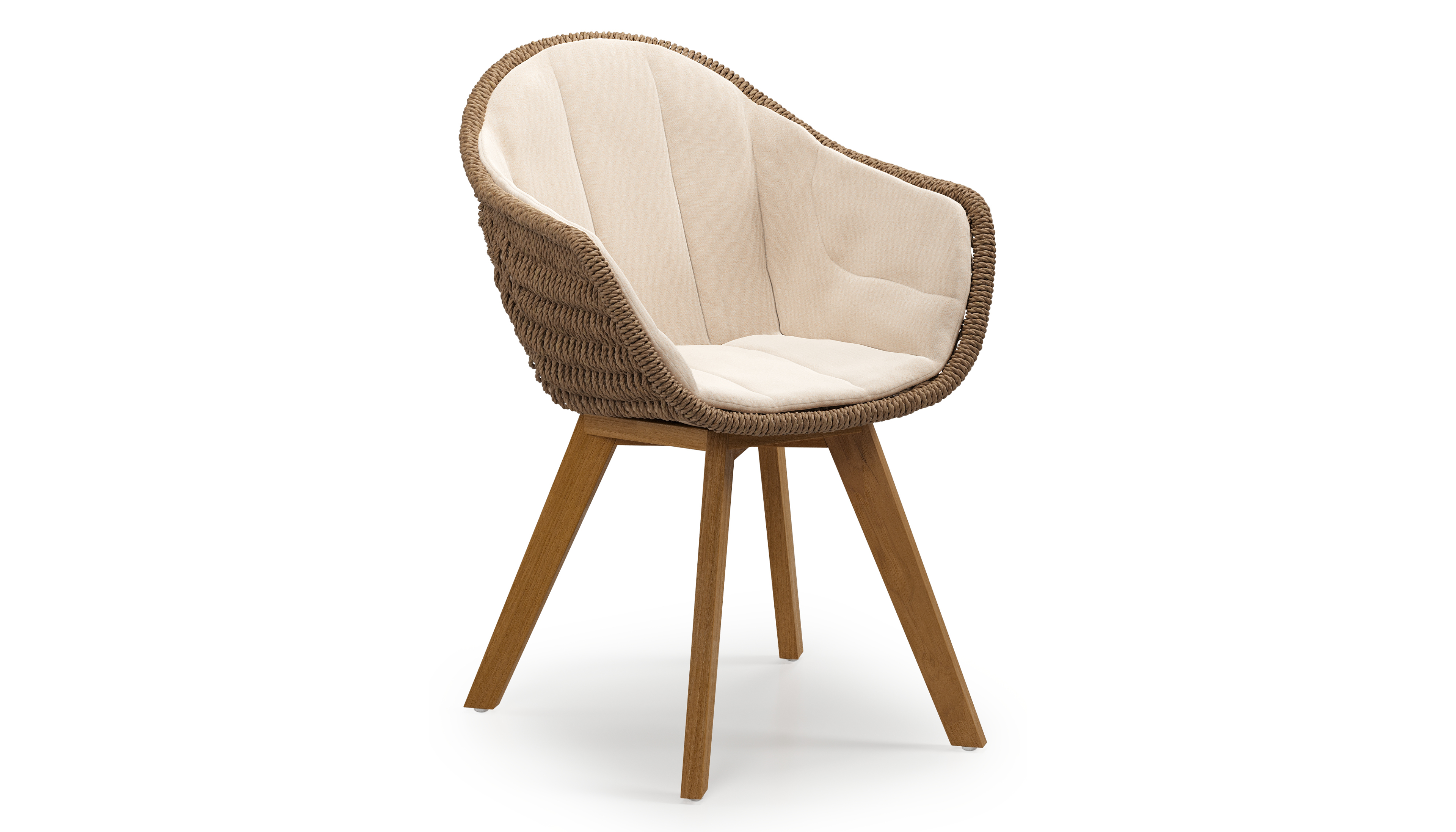 Pagino tuinstoel in teak en bruin ronde wicker met zitkussen in All Weather Sunbrella® Luxe Natte Linen Chalk | Exterioo tuinmeubelen