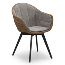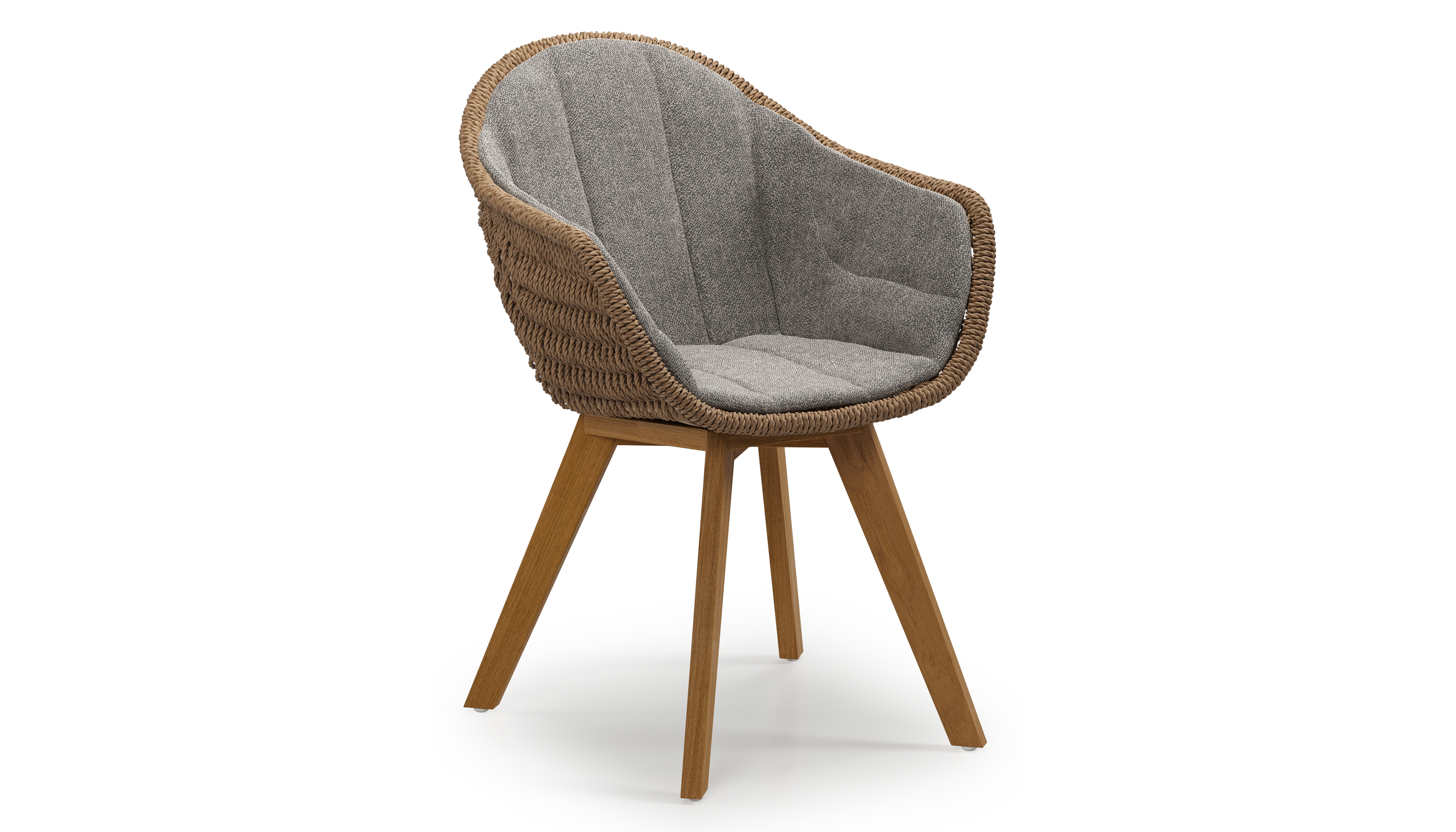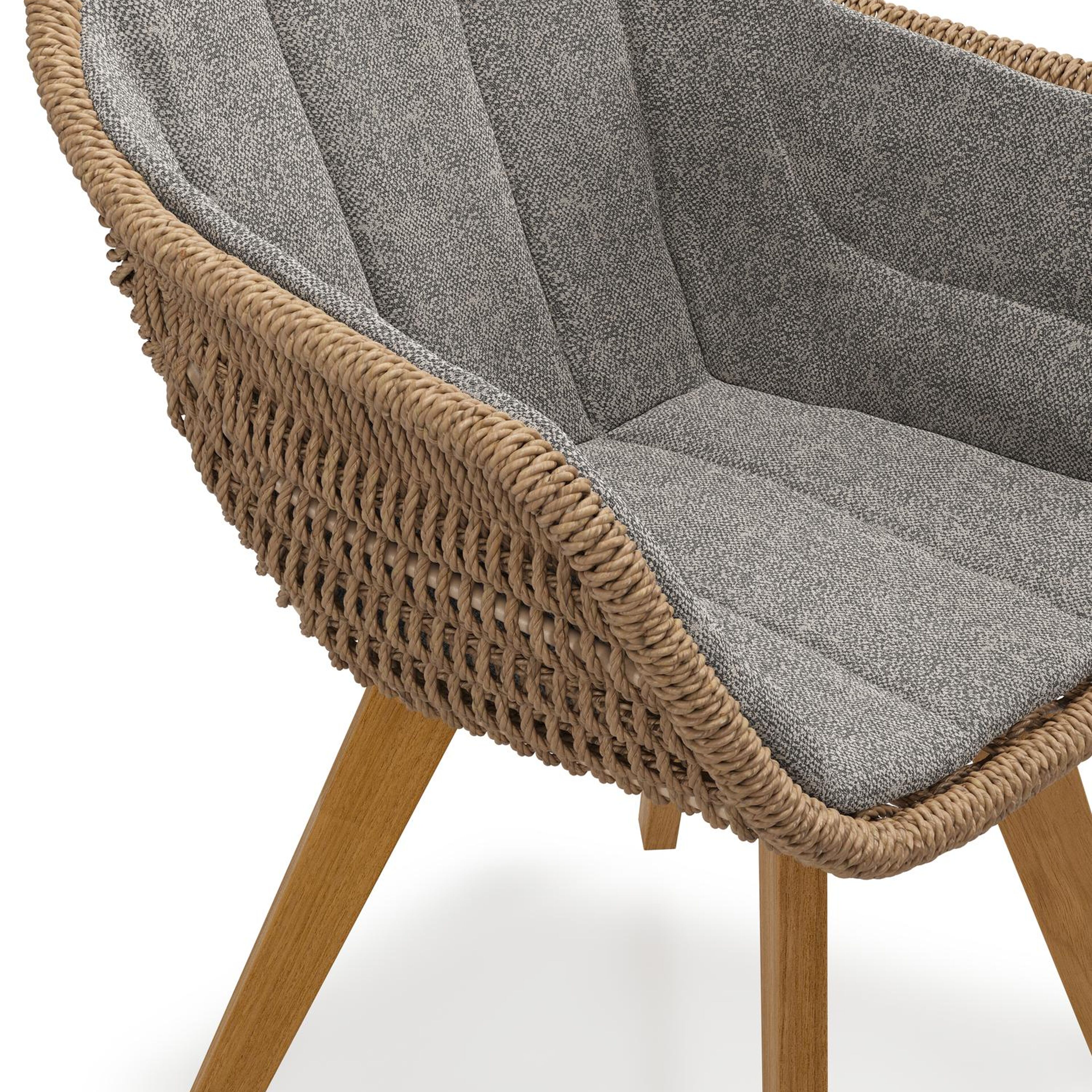 Pagino tuinstoel in teak en bruin ronde wicker met zitkussen in All Weather Sunbrella® Luxe Chartres Drizzle | Exterioo tuinmeubelen
