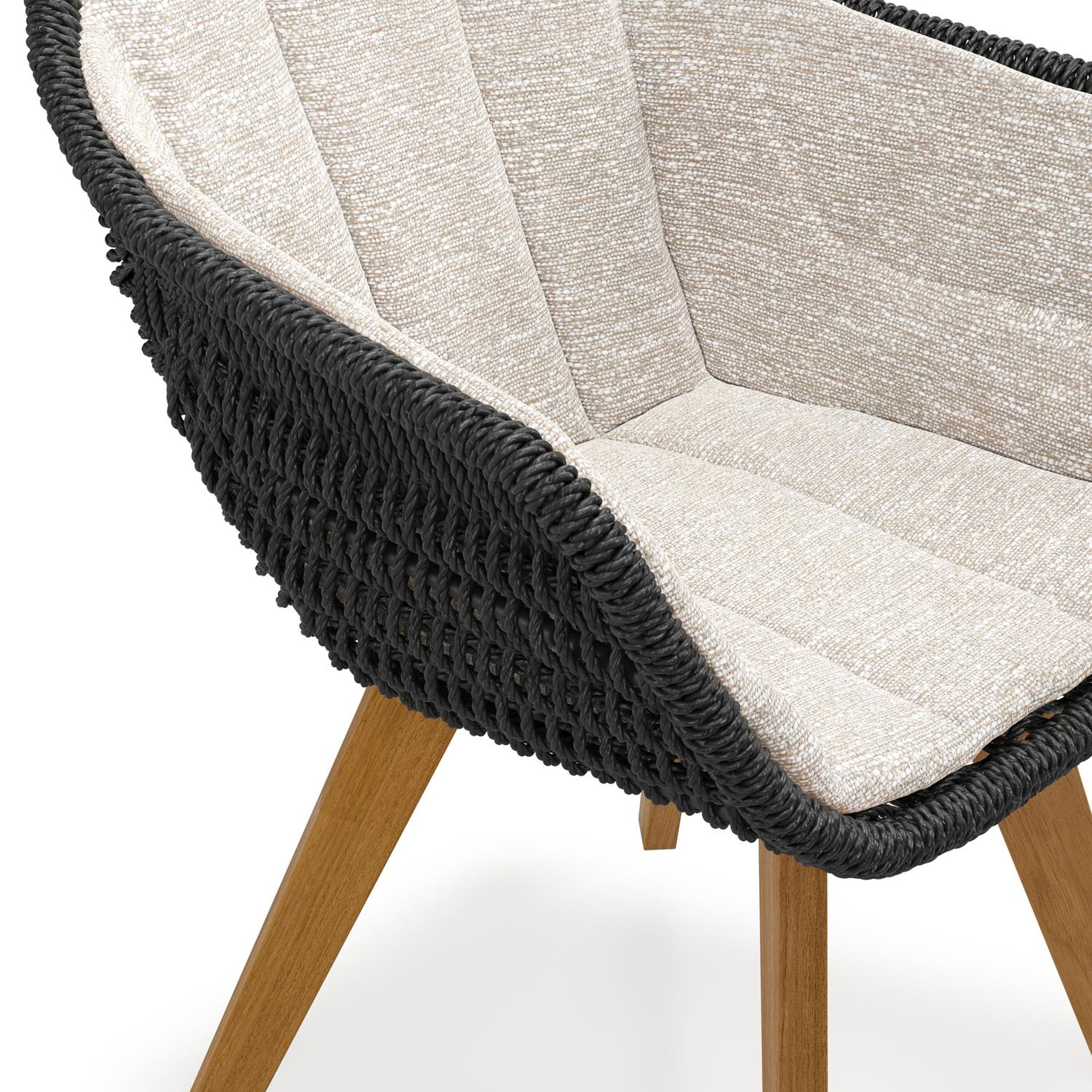 Pagino tuinstoel in teak en zwart ronde wicker met zitkussen in All Weather Sunbrella® Luxe Tundra Sand | Exterioo tuinmeubelen