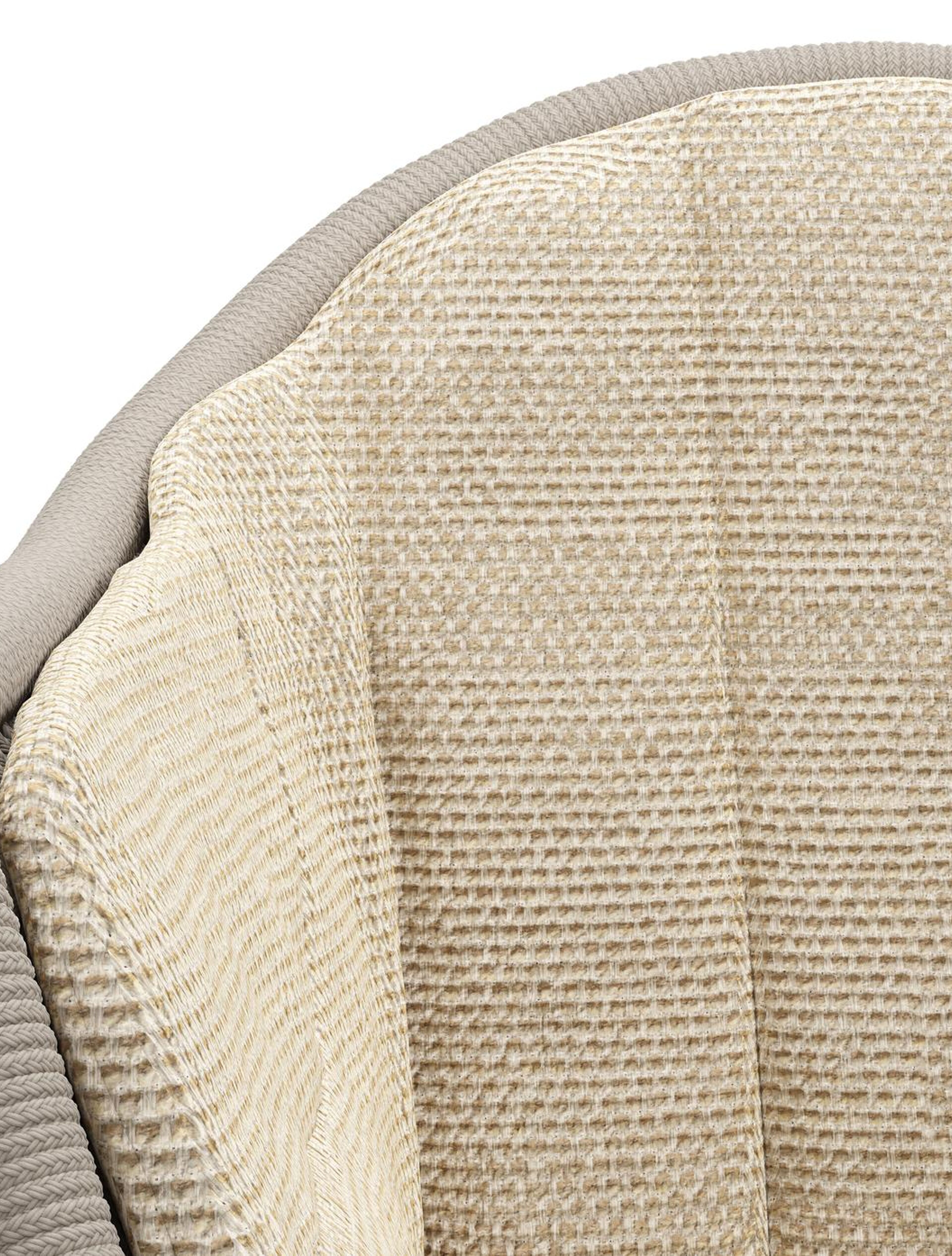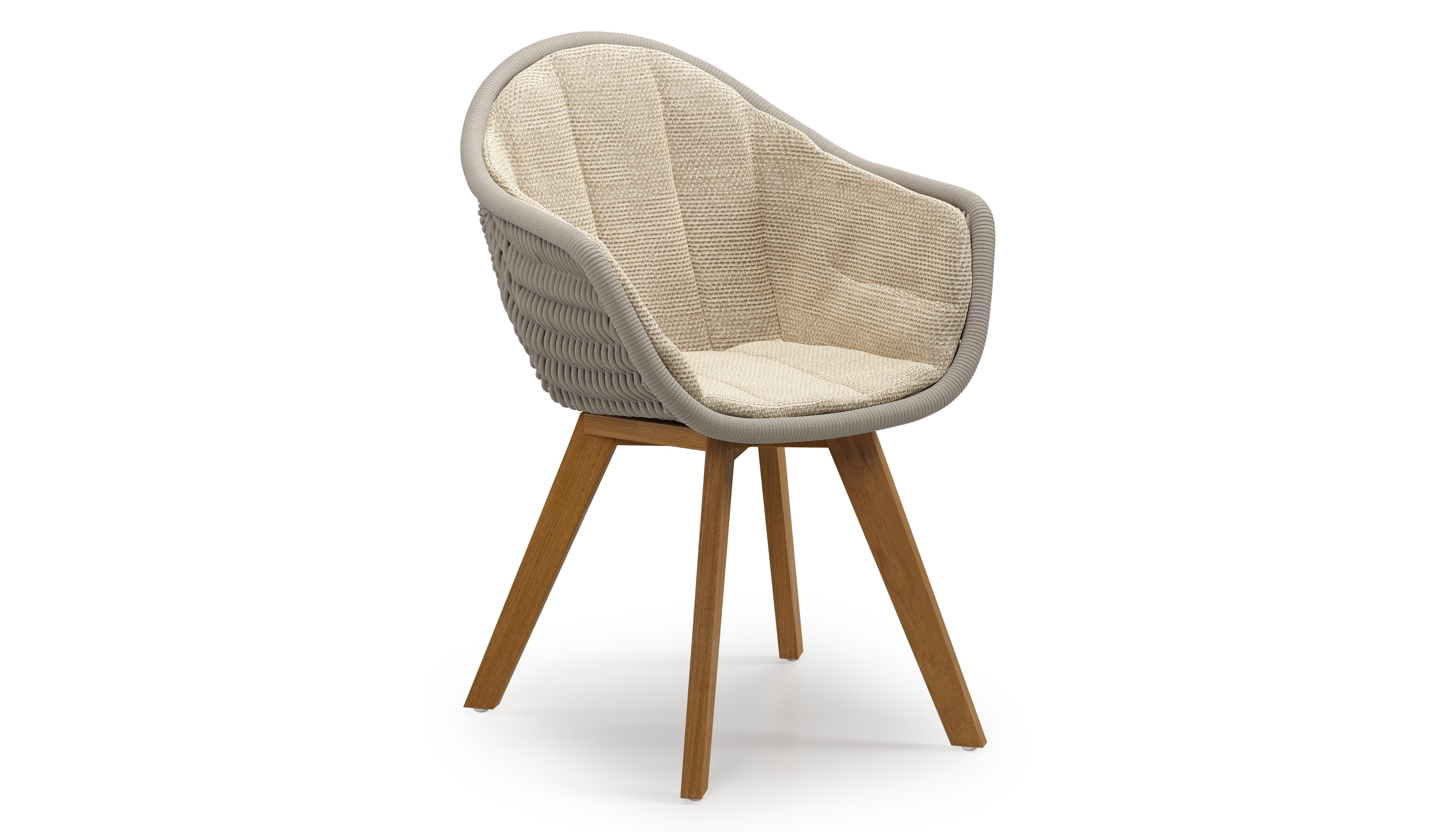 Pagino tuinstoel in teak en beige verticaal geweven ronde rope met zitkussen in All Weather Cosytica Althea Camel | Exterioo tuinmeubelen