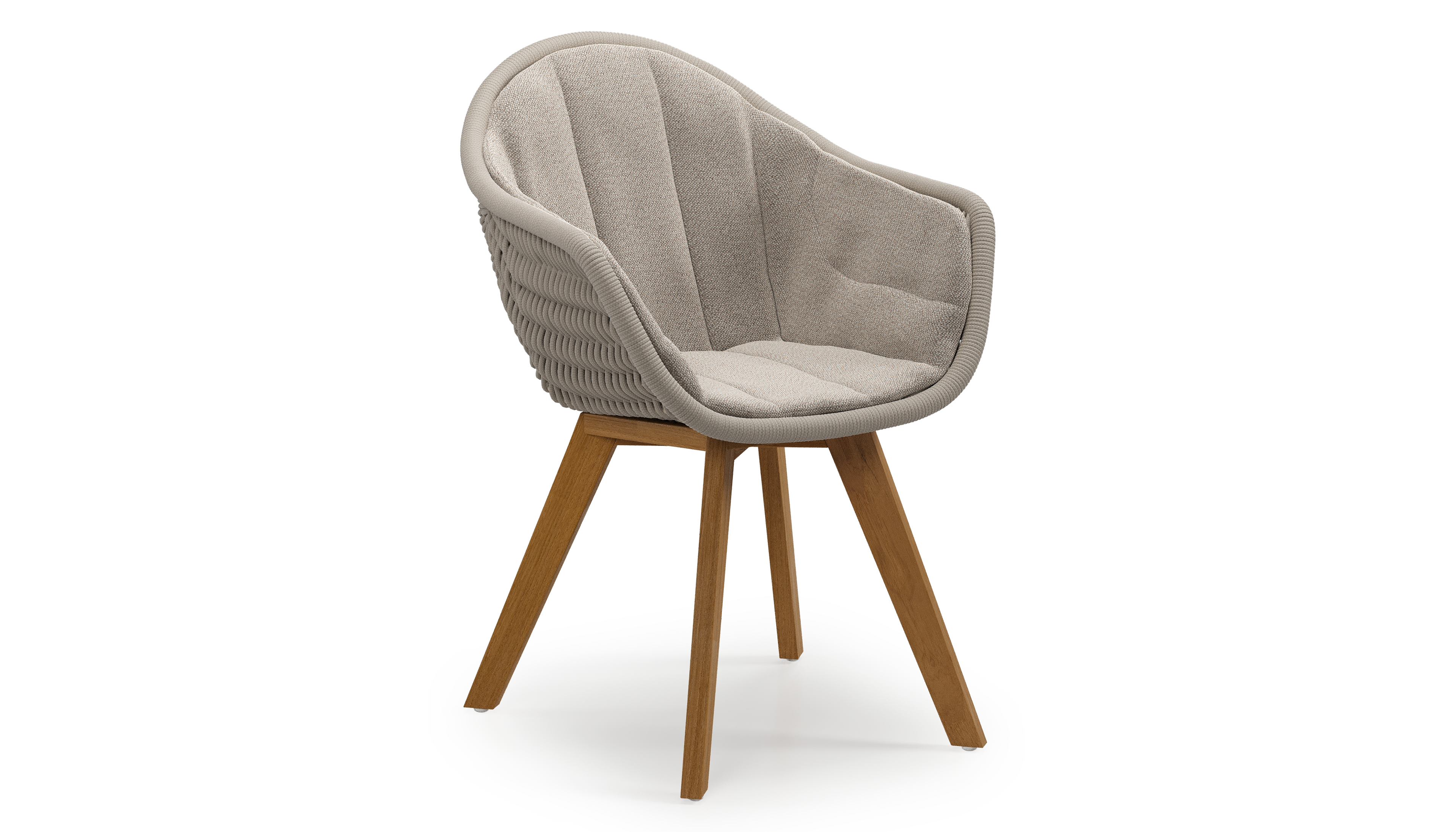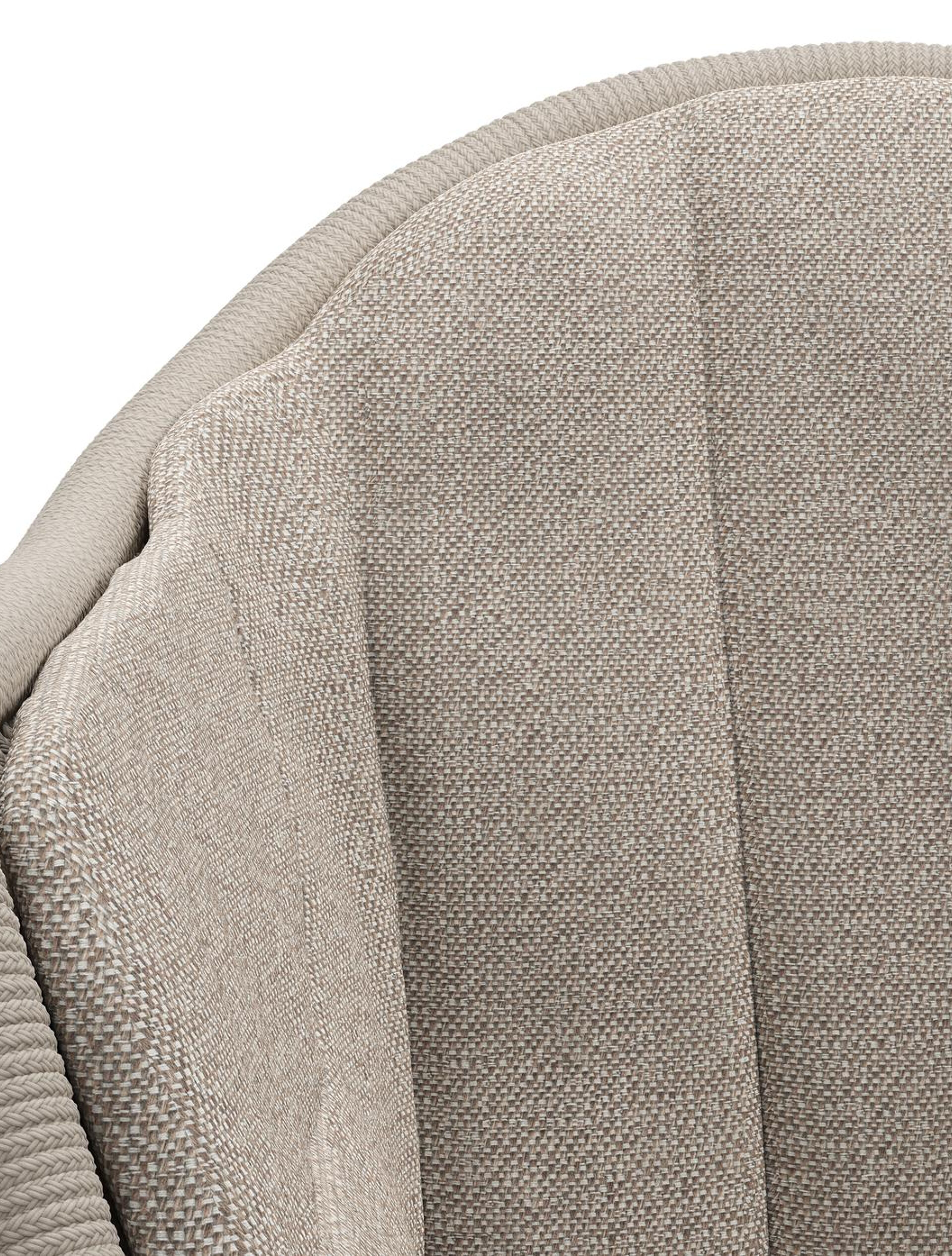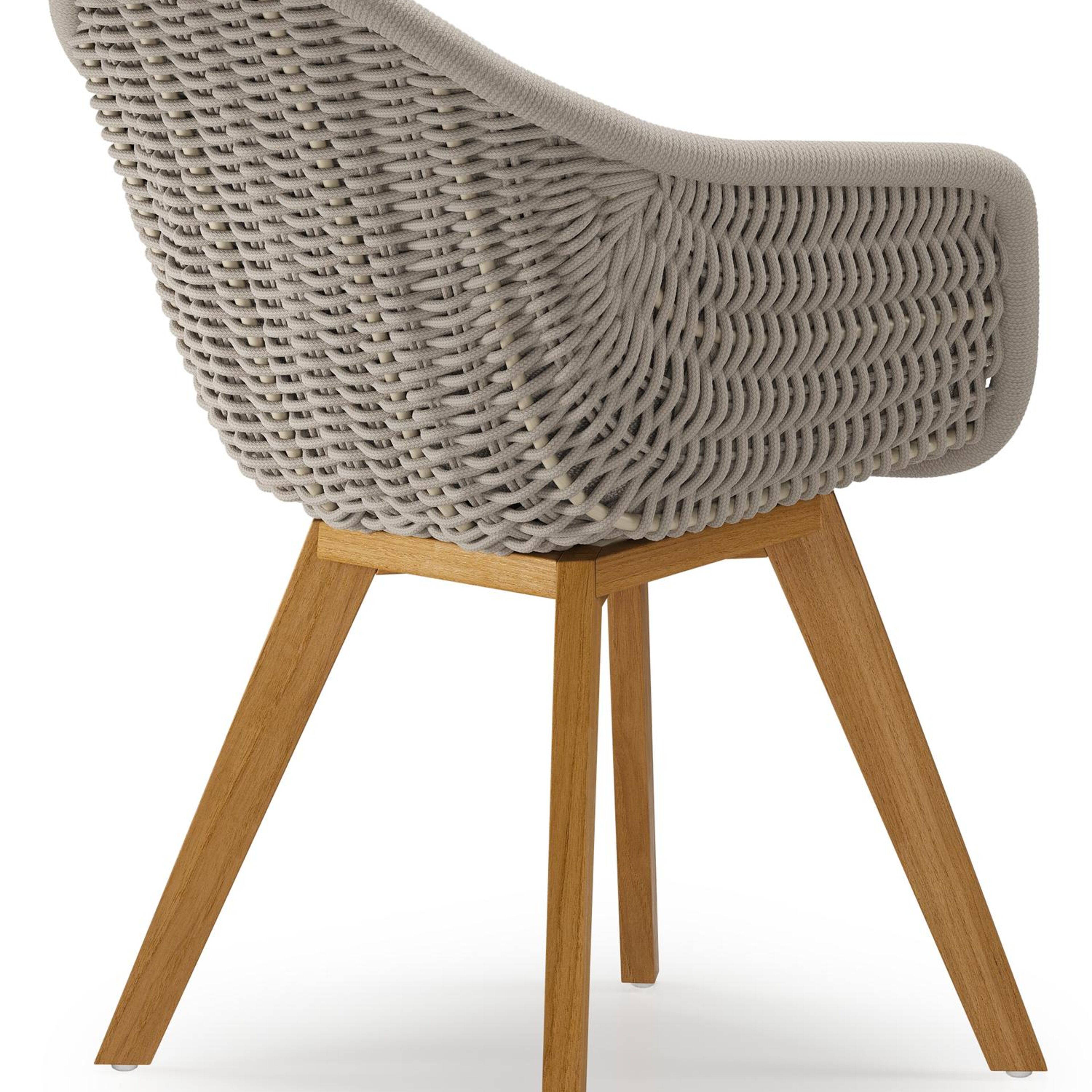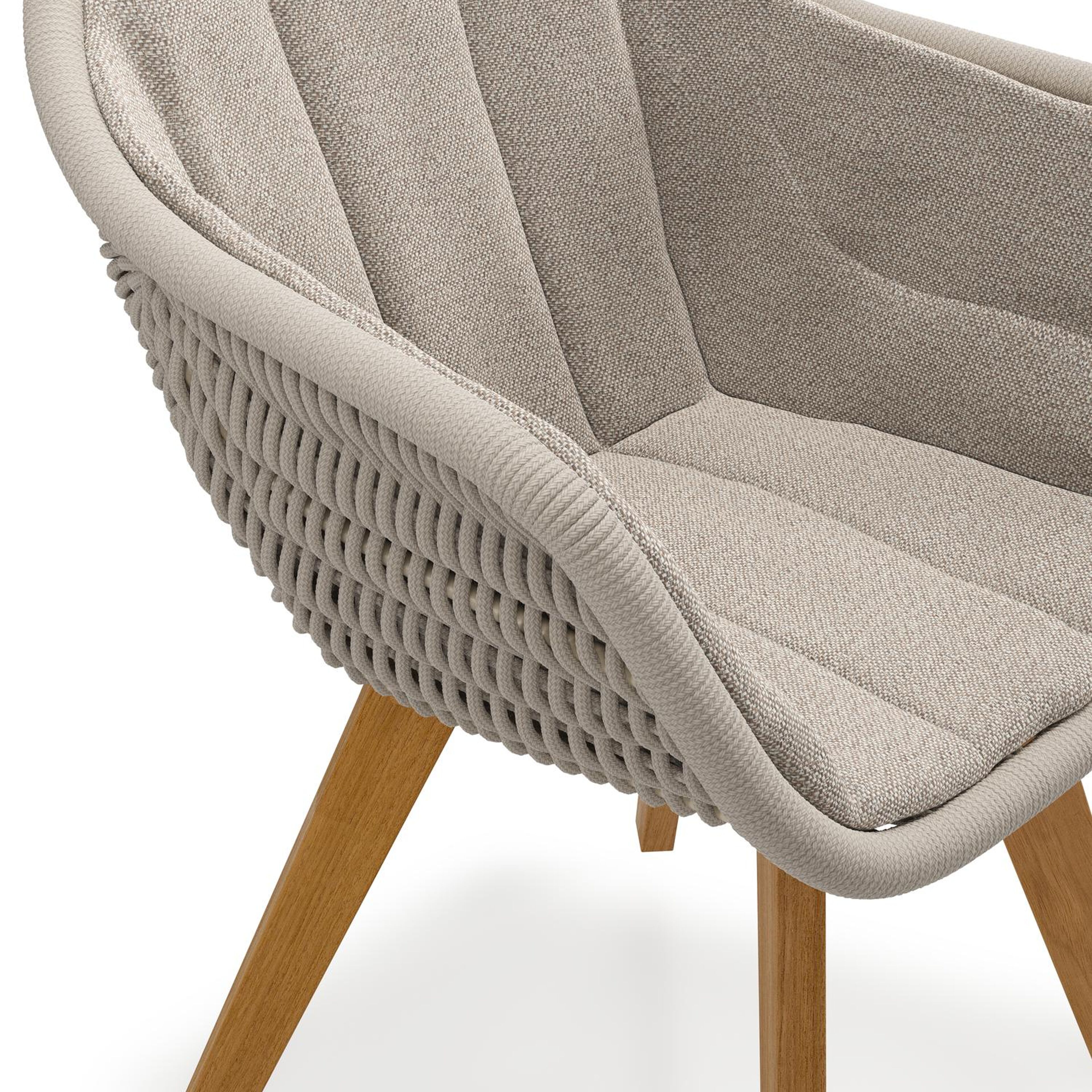 Pagino tuinstoel in teak en beige verticaal geweven ronde rope met zitkussen in All Weather Sunbrella® Luxe Savane Coconut | Exterioo tuinmeubelen