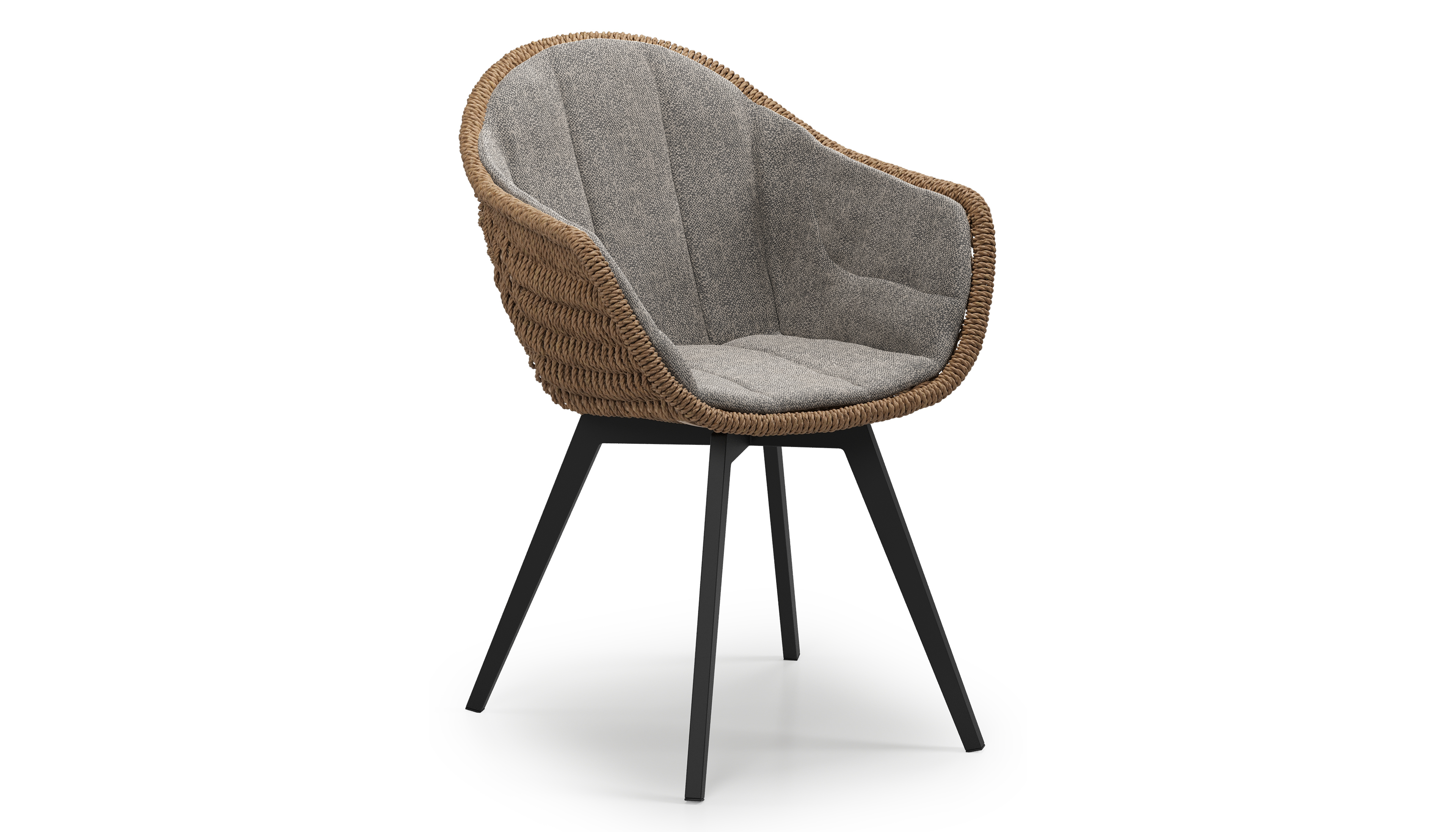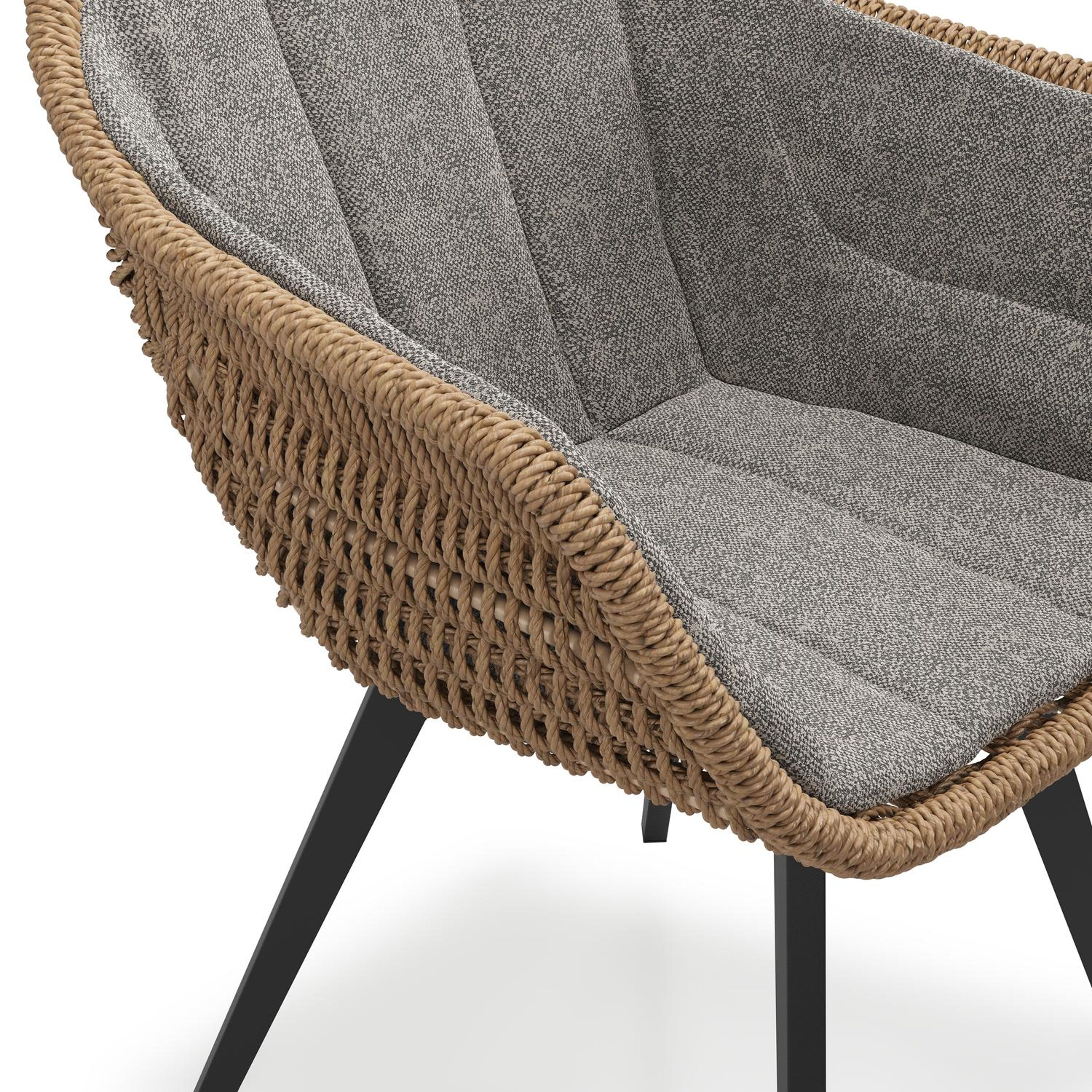 Pagino tuinstoel in zwart aluminium en bruin ronde wicker met zitkussen in All Weather Sunbrella® Luxe Chartres Drizzle | Exterioo tuinmeubelen