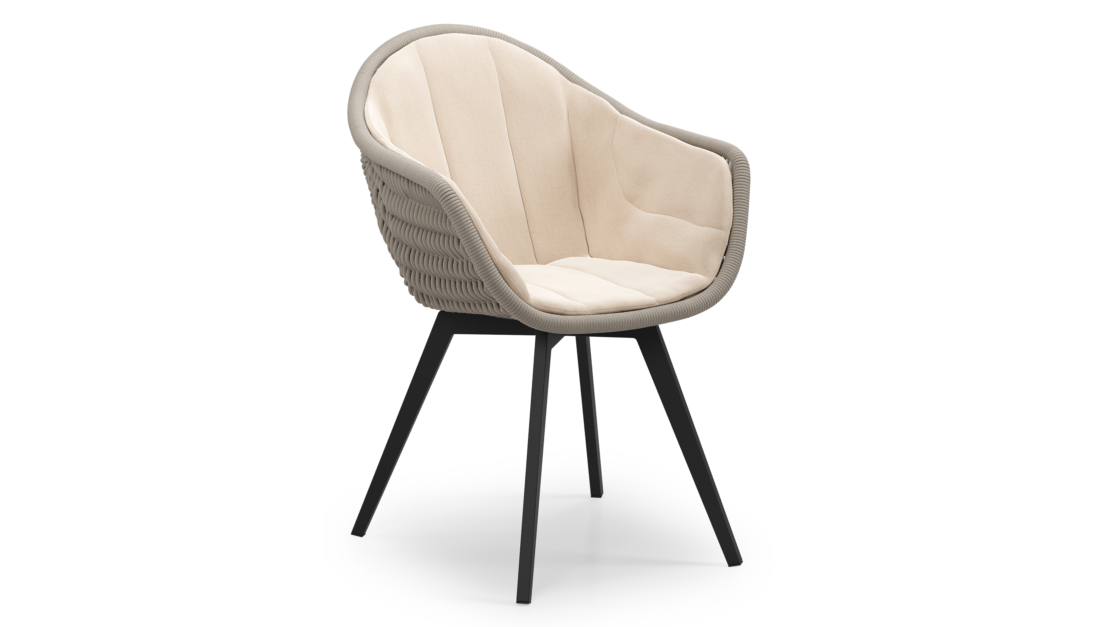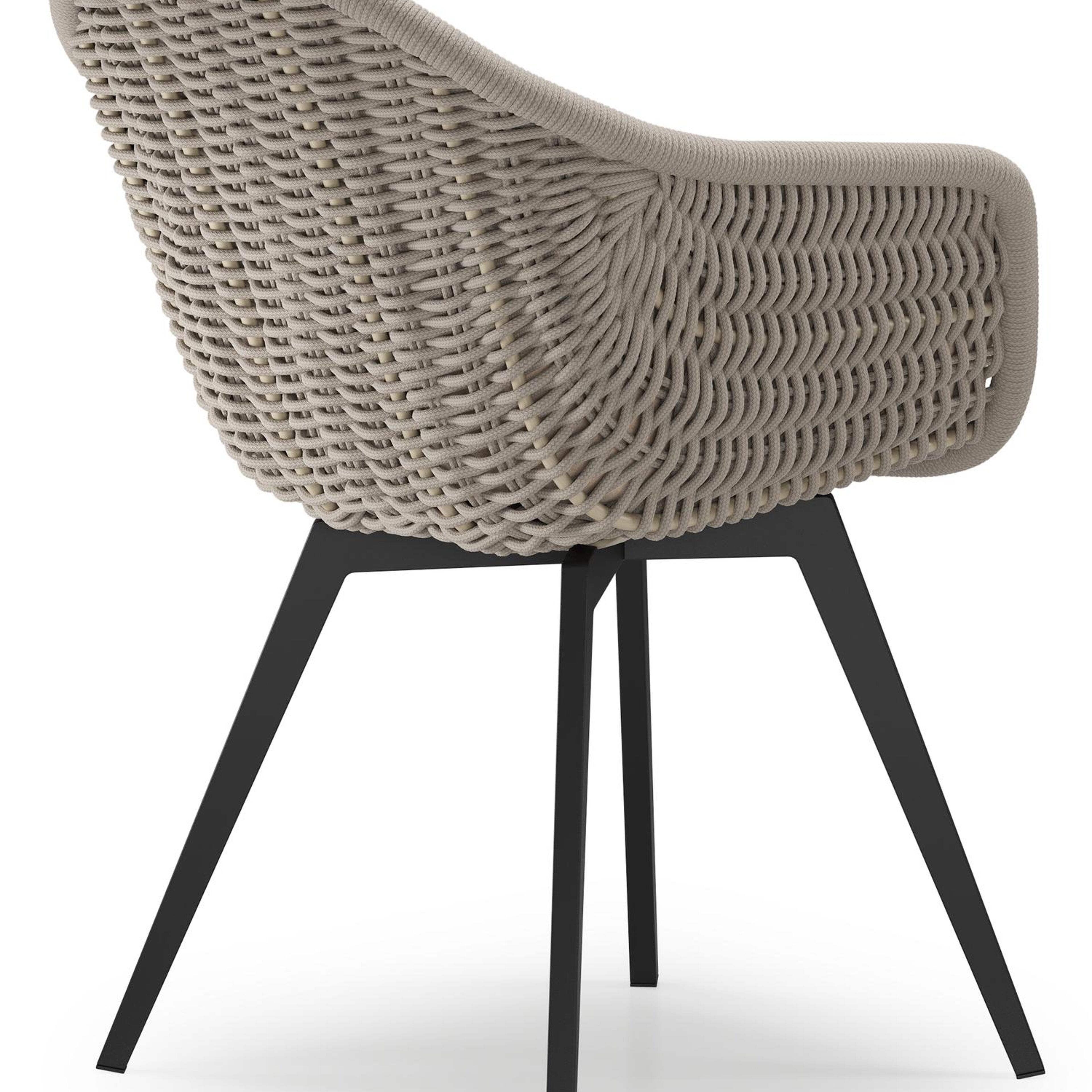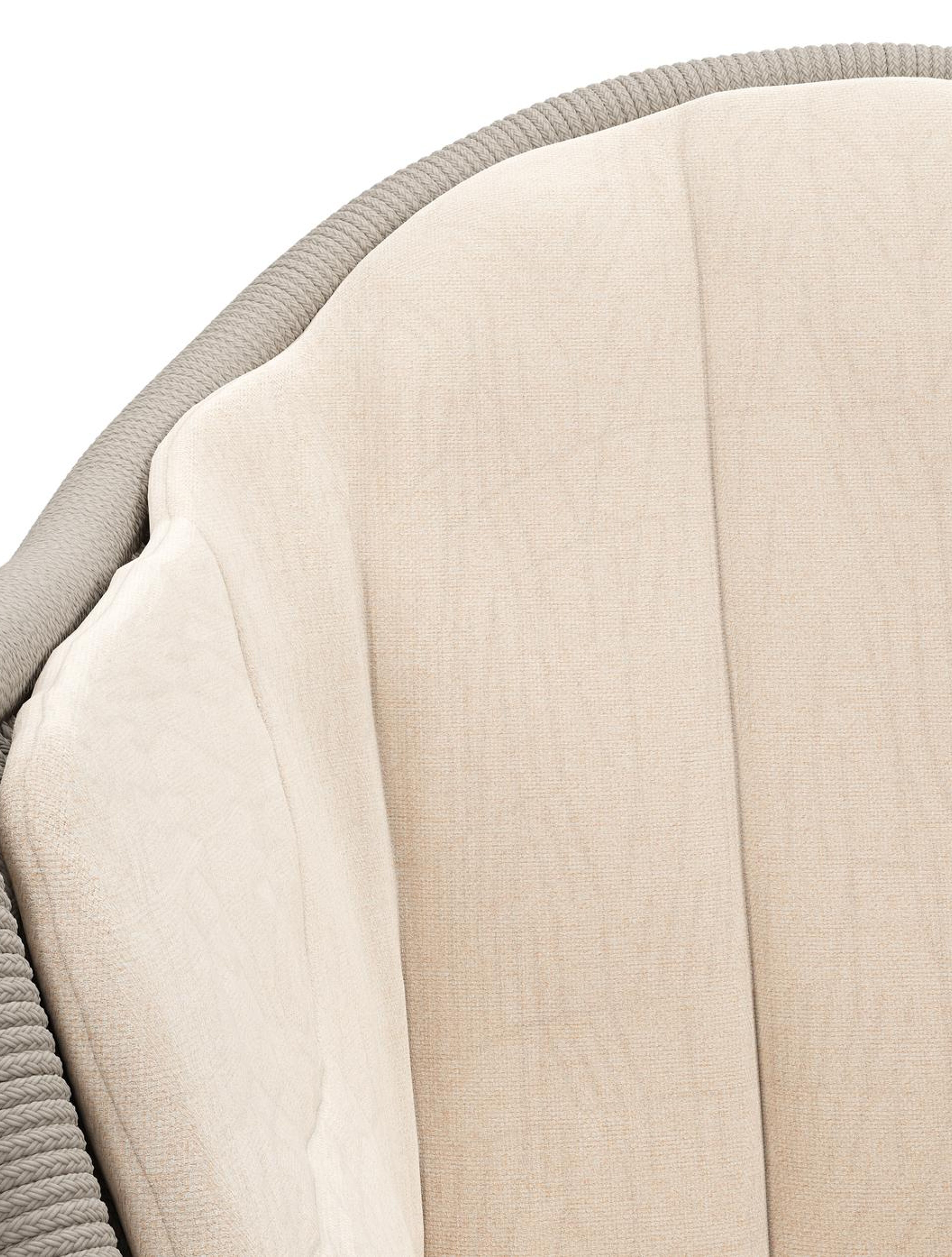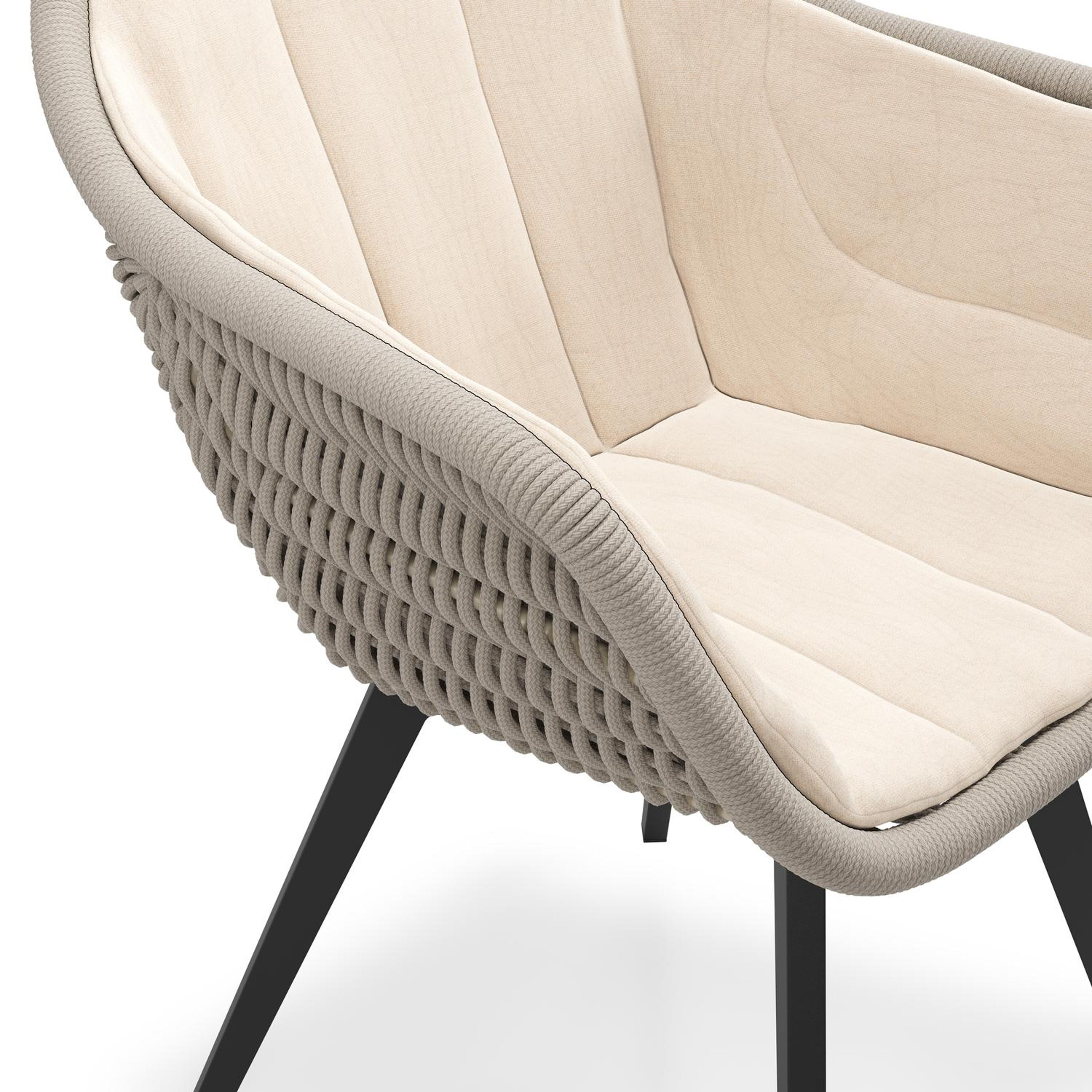 Pagino tuinstoel in zwart aluminium en beige verticaal geweven ronde rope met zitkussen in All Weather Sunbrella® Luxe Natte Linen Chalk | Exterioo tuinmeubelen