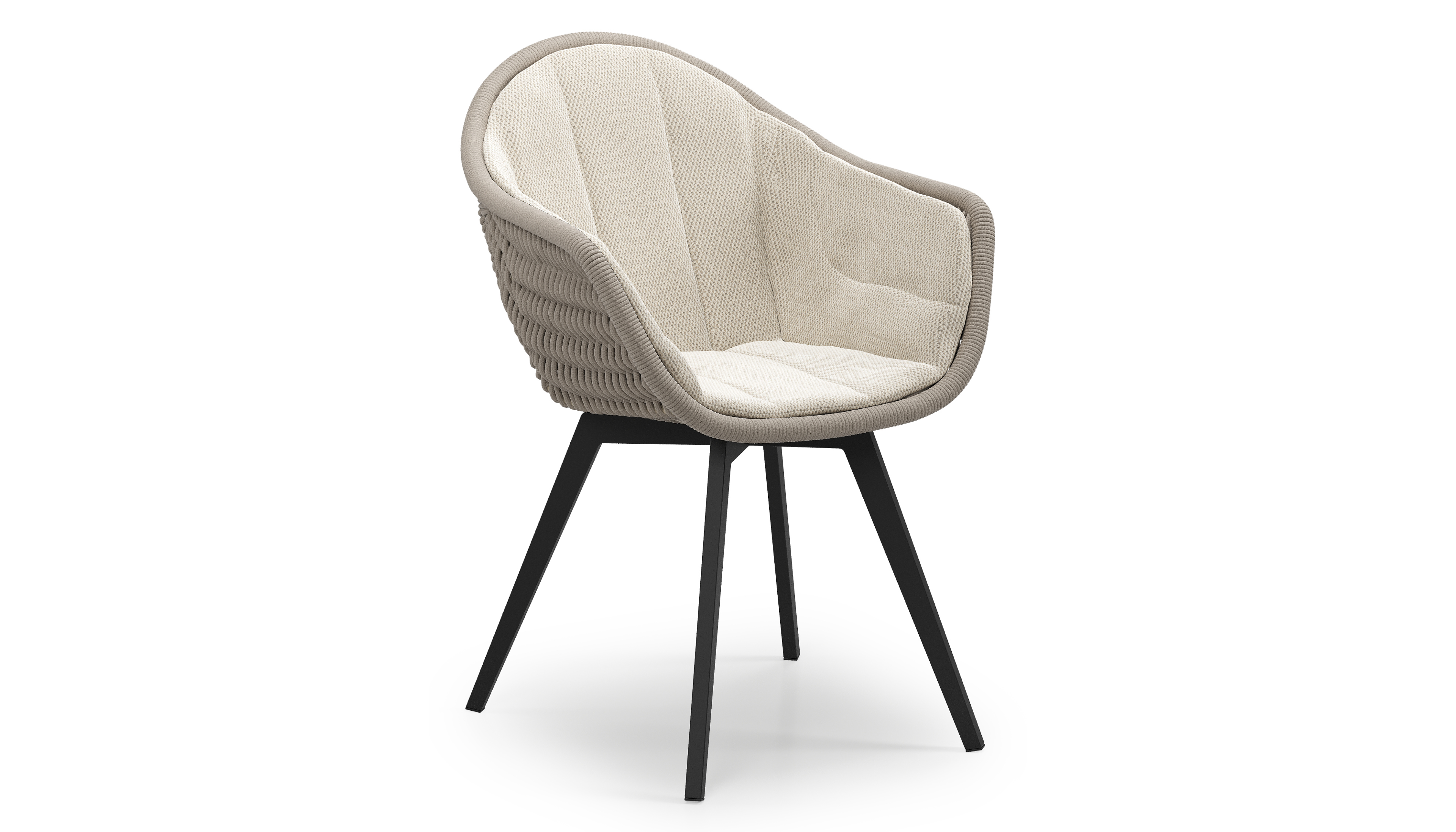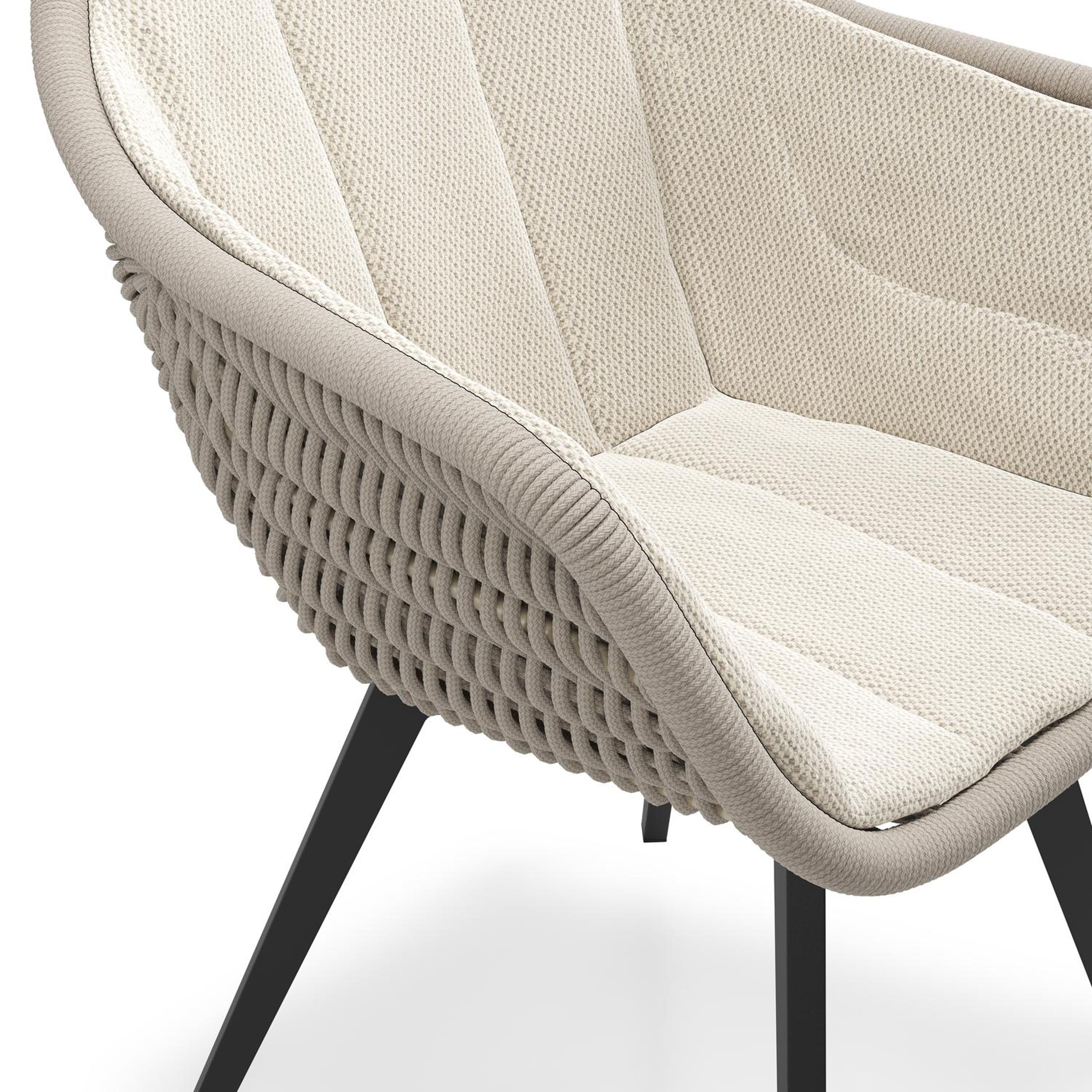 Pagino tuinstoel in zwart aluminium en beige verticaal geweven ronde rope met zitkussen in All Weather Sunbrella® Luxe Lopi Marble | Exterioo tuinmeubelen