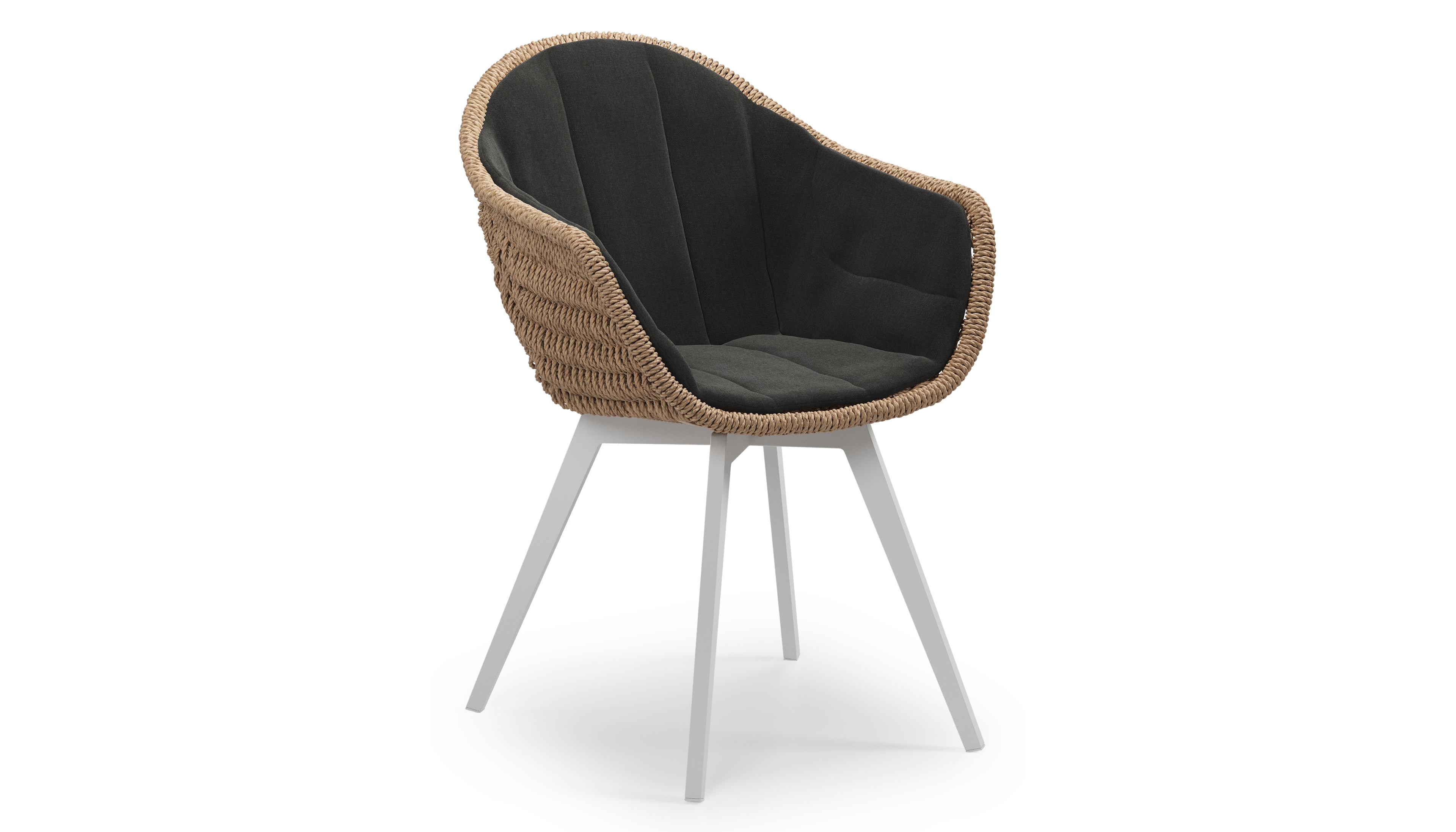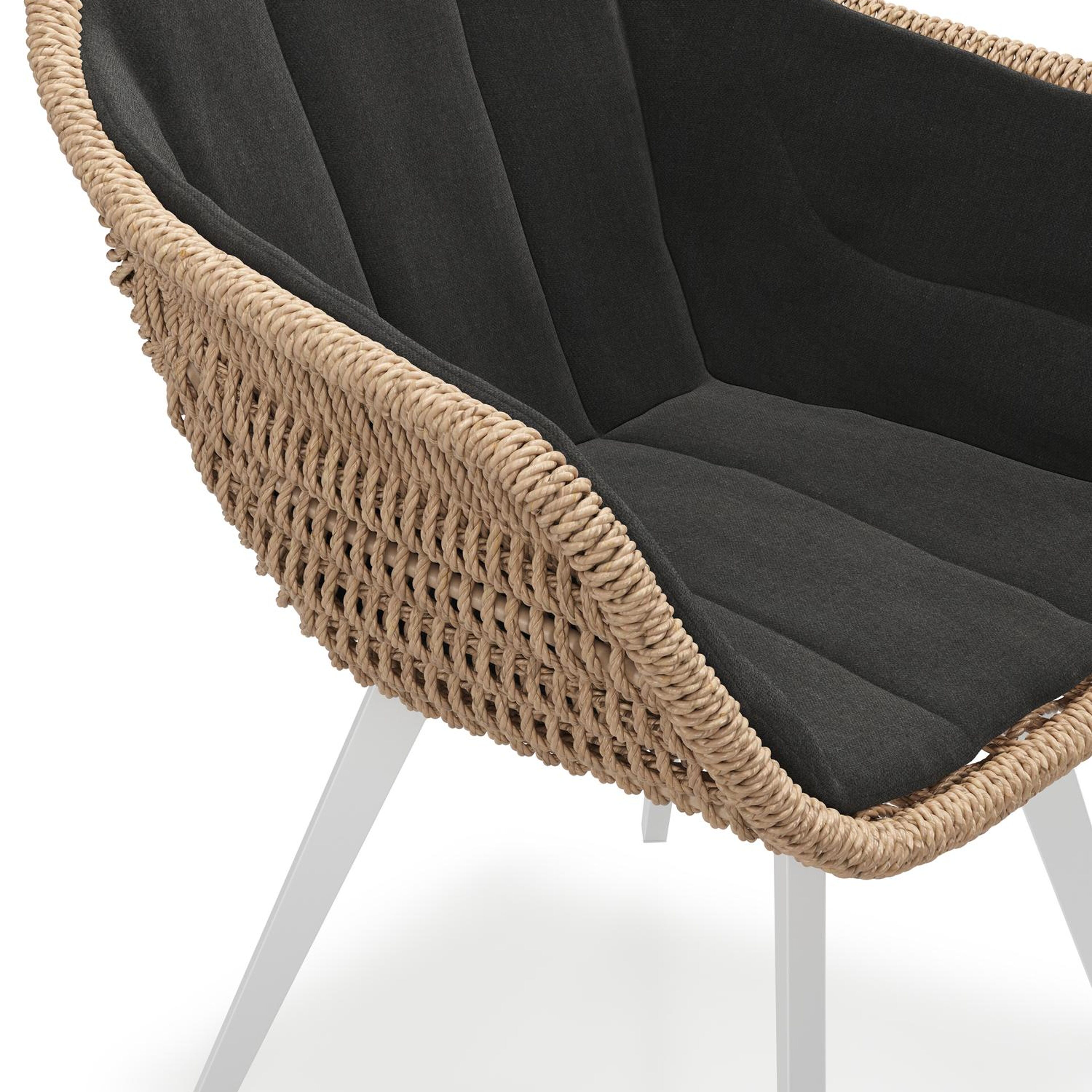 Pagino tuinstoel in wit aluminium en naturel ronde wicker met zitkussen in All Weather Sunbrella® Luxe Natte Sooty | Exterioo tuinmeubelen