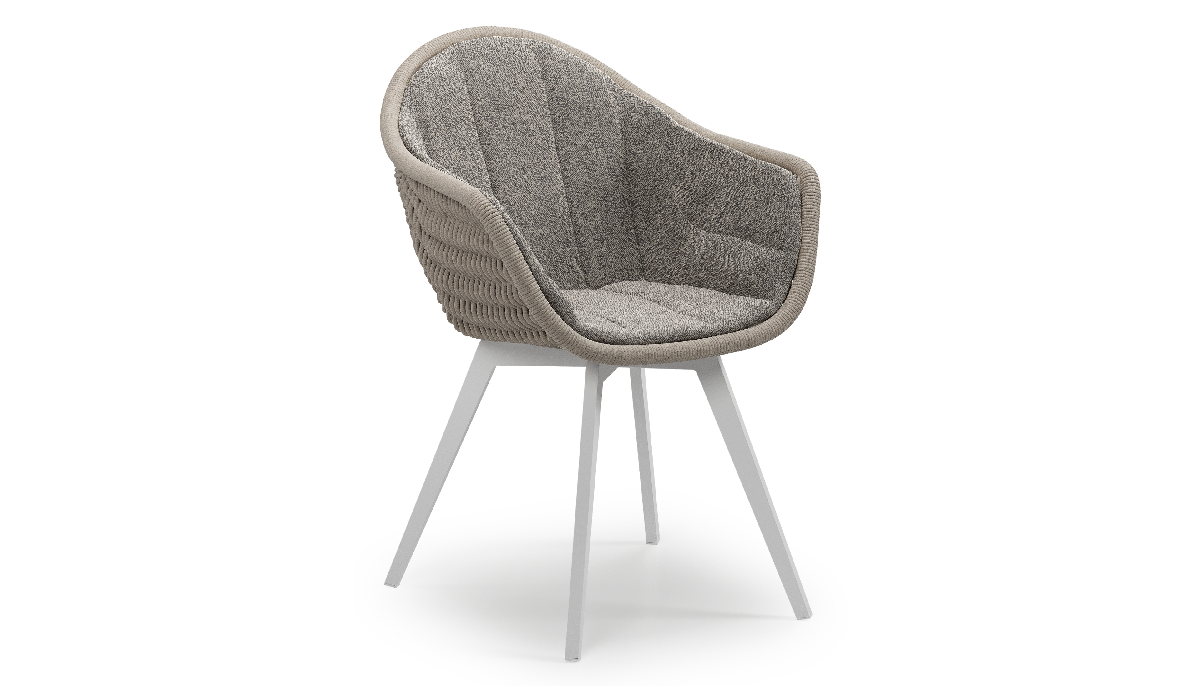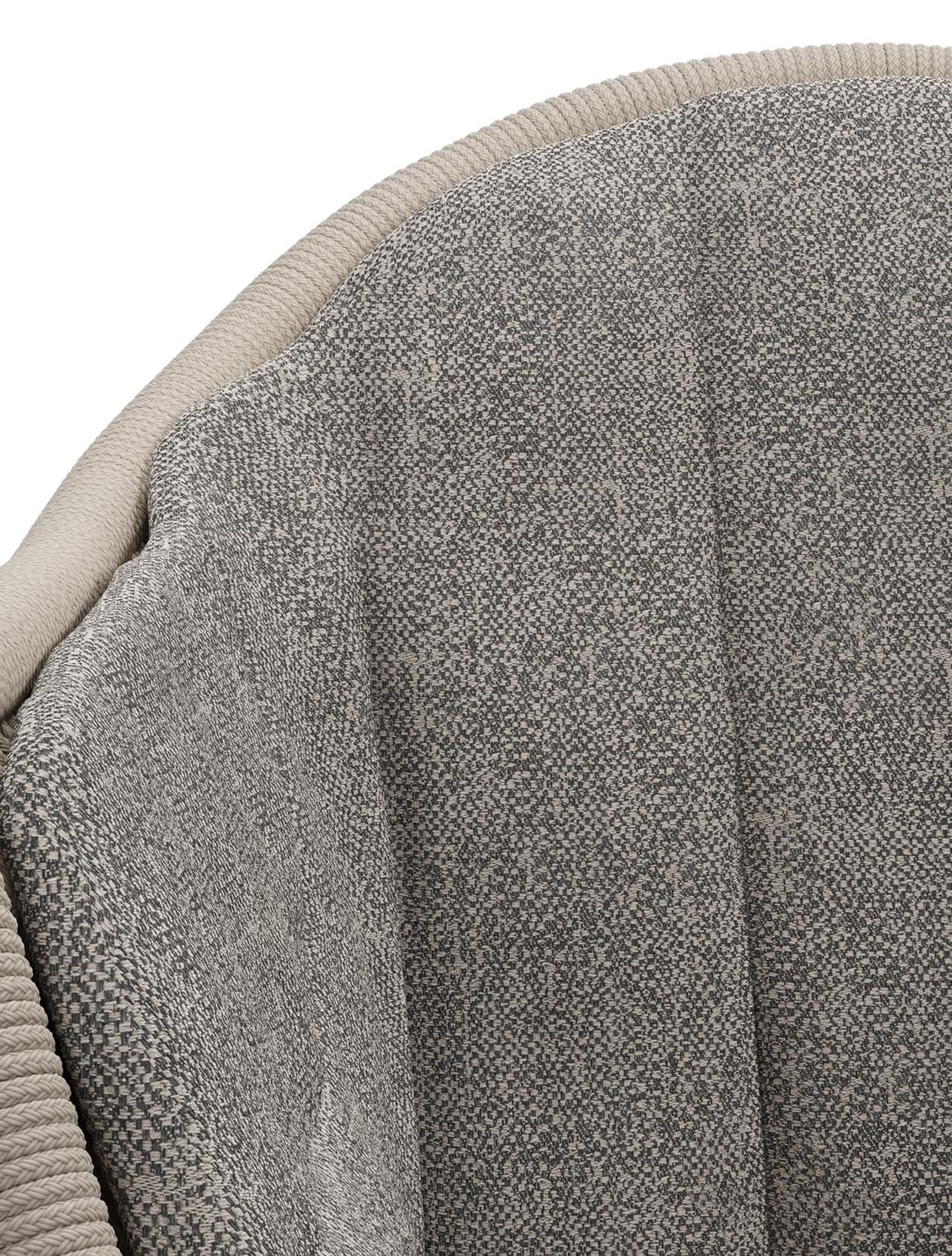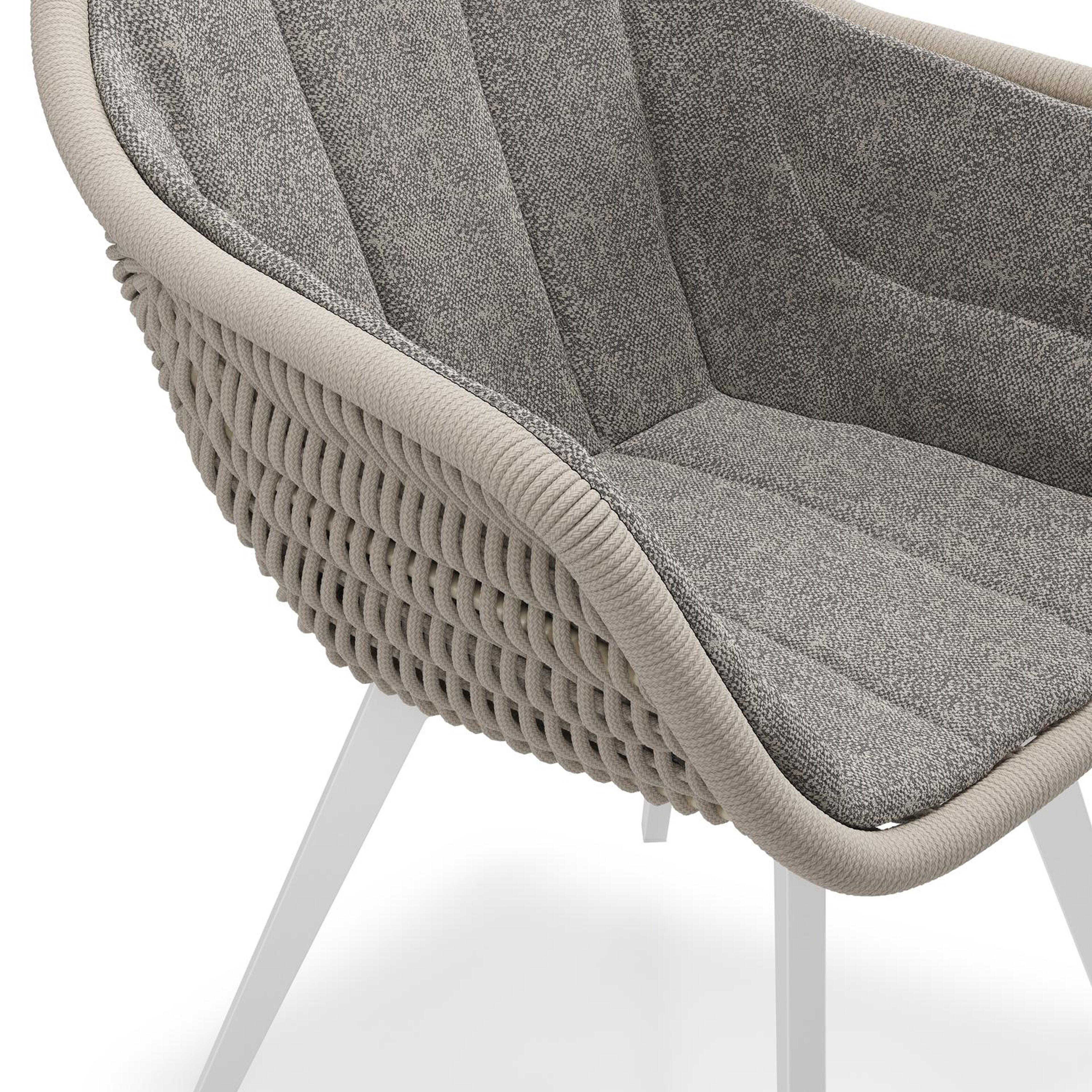 Pagino tuinstoel in wit aluminium en beige verticaal geweven ronde rope met zitkussen in All Weather Sunbrella® Luxe Chartres Drizzle | Exterioo tuinmeubelen
